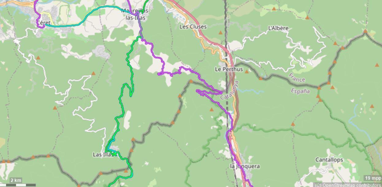 You can see below Ceret, Maureilles, Las IIlas, Le Perthus. The top of the mountain/the border is the grey line with the orange dots. Starting from Maureilles, in Green it is the Grampies, Scott 2022, and McLeod/Karsoo. They all go up past Las Illas. In purple, it is EV8 and Scott 2018. In orange, it is D900 past Perthus. Near D900, invisible on this map, is a little road that may be what Ken and Judy took.