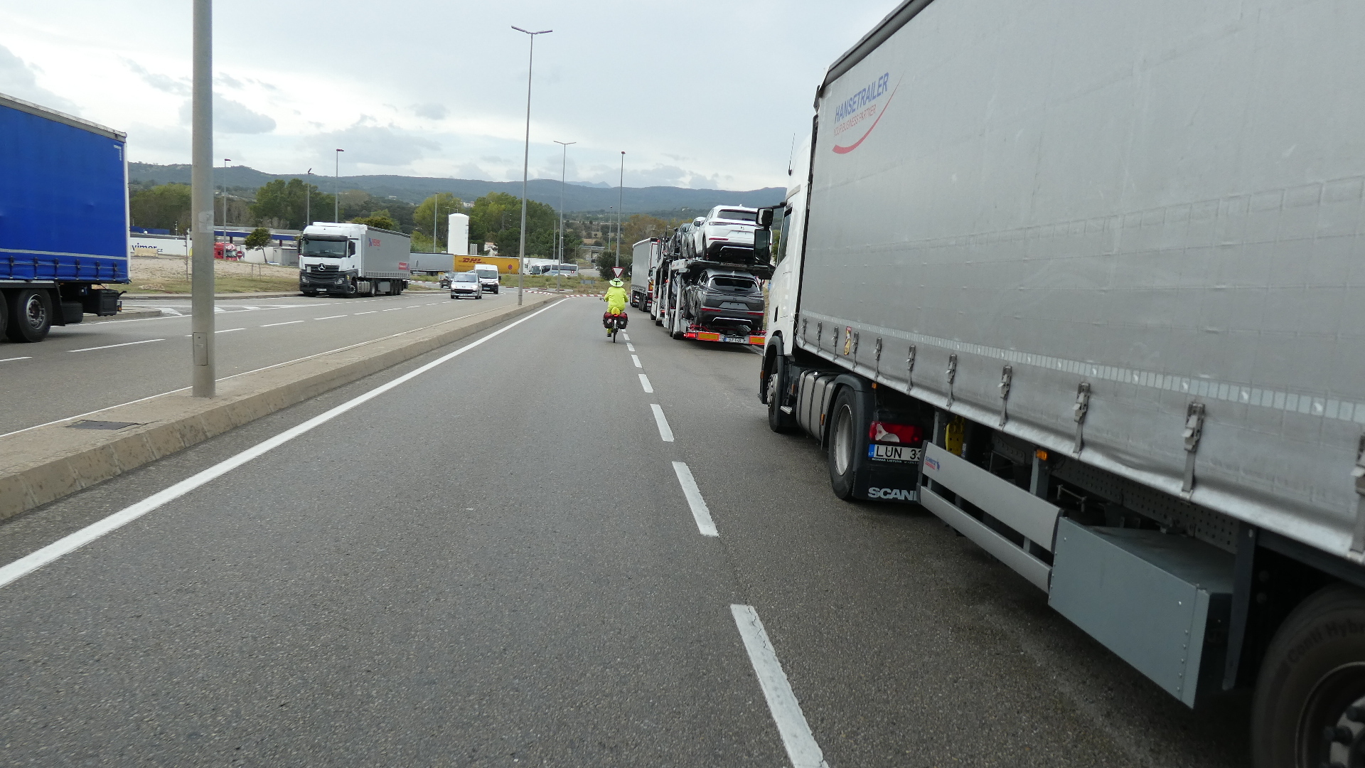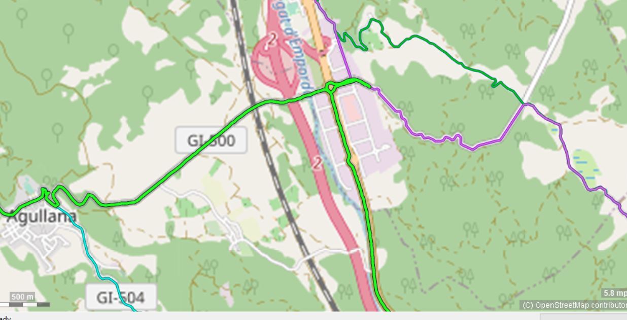 Once over the top, everyone seems to converge at Agullana. But now we see McLeod/Karsoo (in thin turquoise) heading directly south, by GI 504. Grampies today, in heavy green go east, to that interchange. They continue east a bit, lured by the thin purple Scott 2022, which is trying to join with Scott 2018/EV8 over on the far right of the picture. Grampies give up on this and shoot south on the N11. Got it?