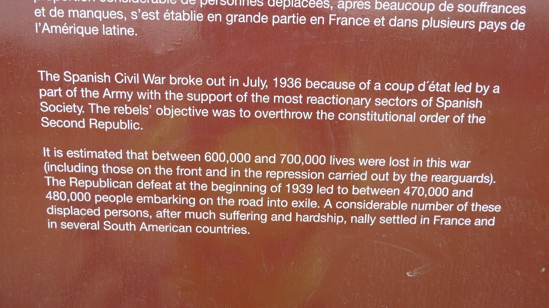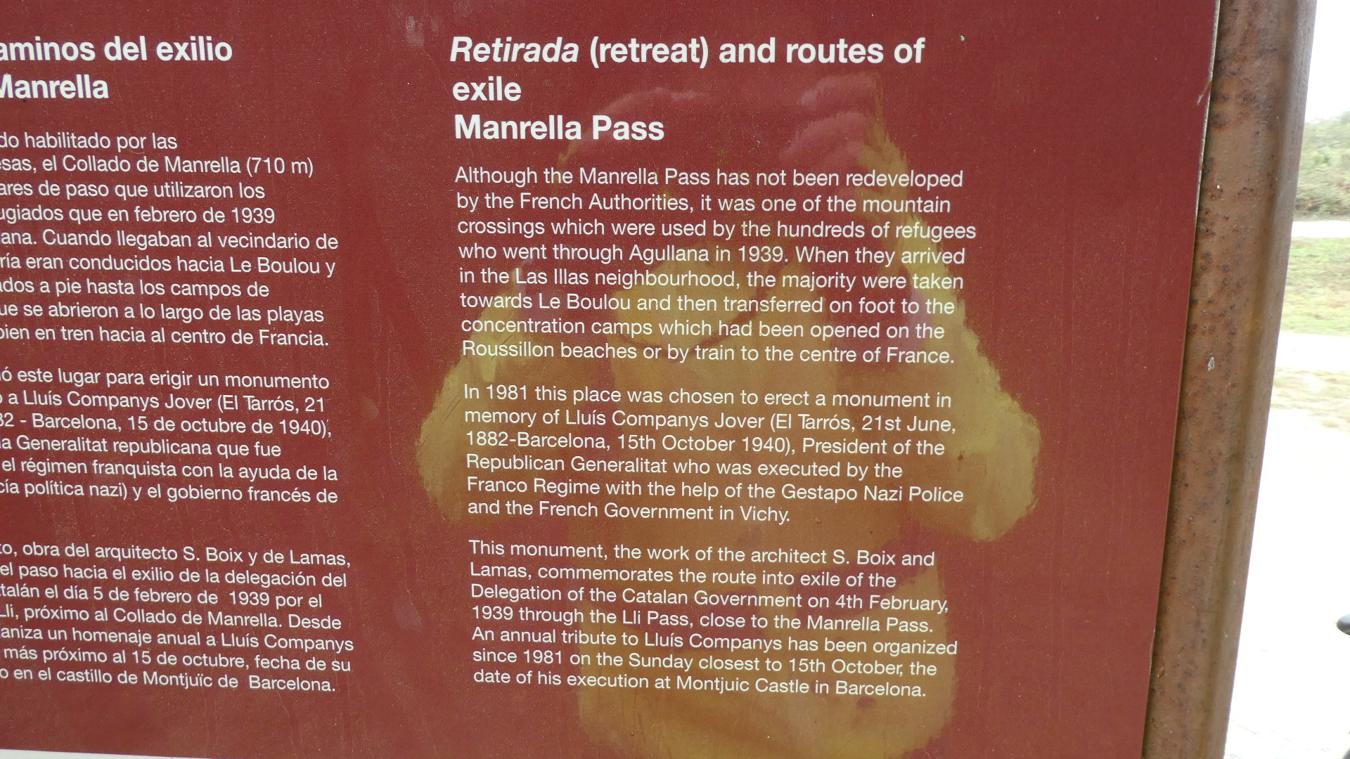 Beyond the rocks was an open area, containing the monument to Lluis Companys. This, and other roadside signs tells the story of how in 1936 Franco did a coup d'etat, spawning the Spanish Civil War. Members of the former government and other non-Franco supporters fled the country, many using passes like this one.