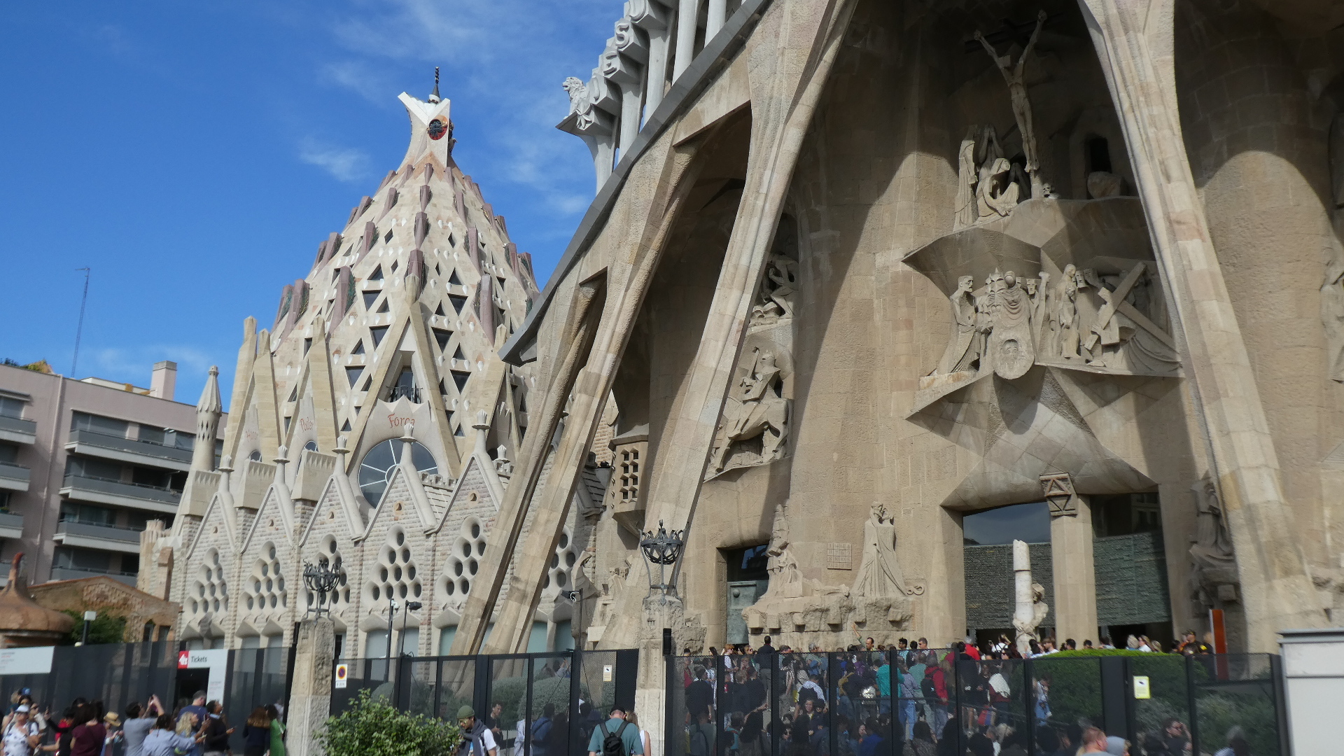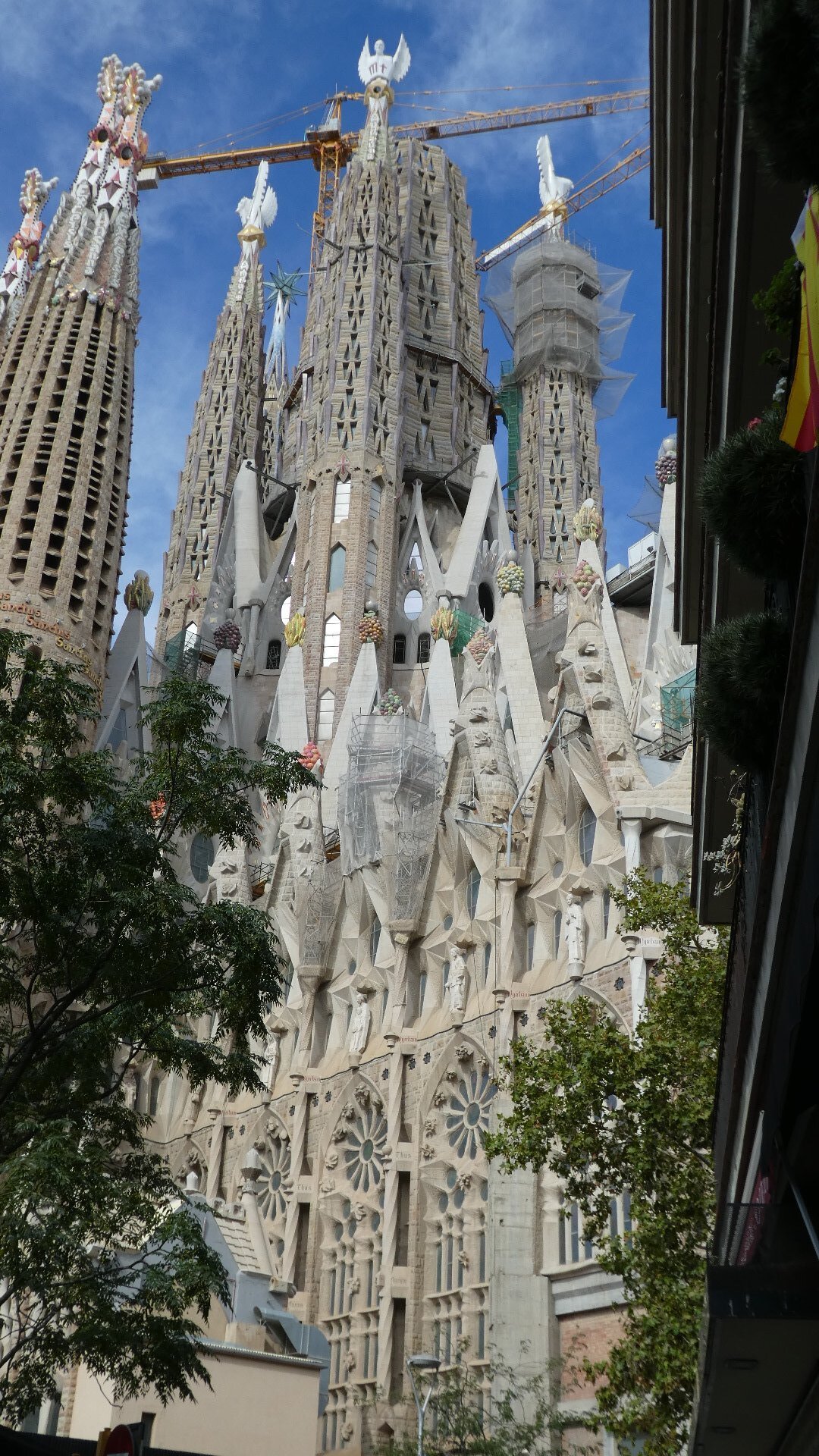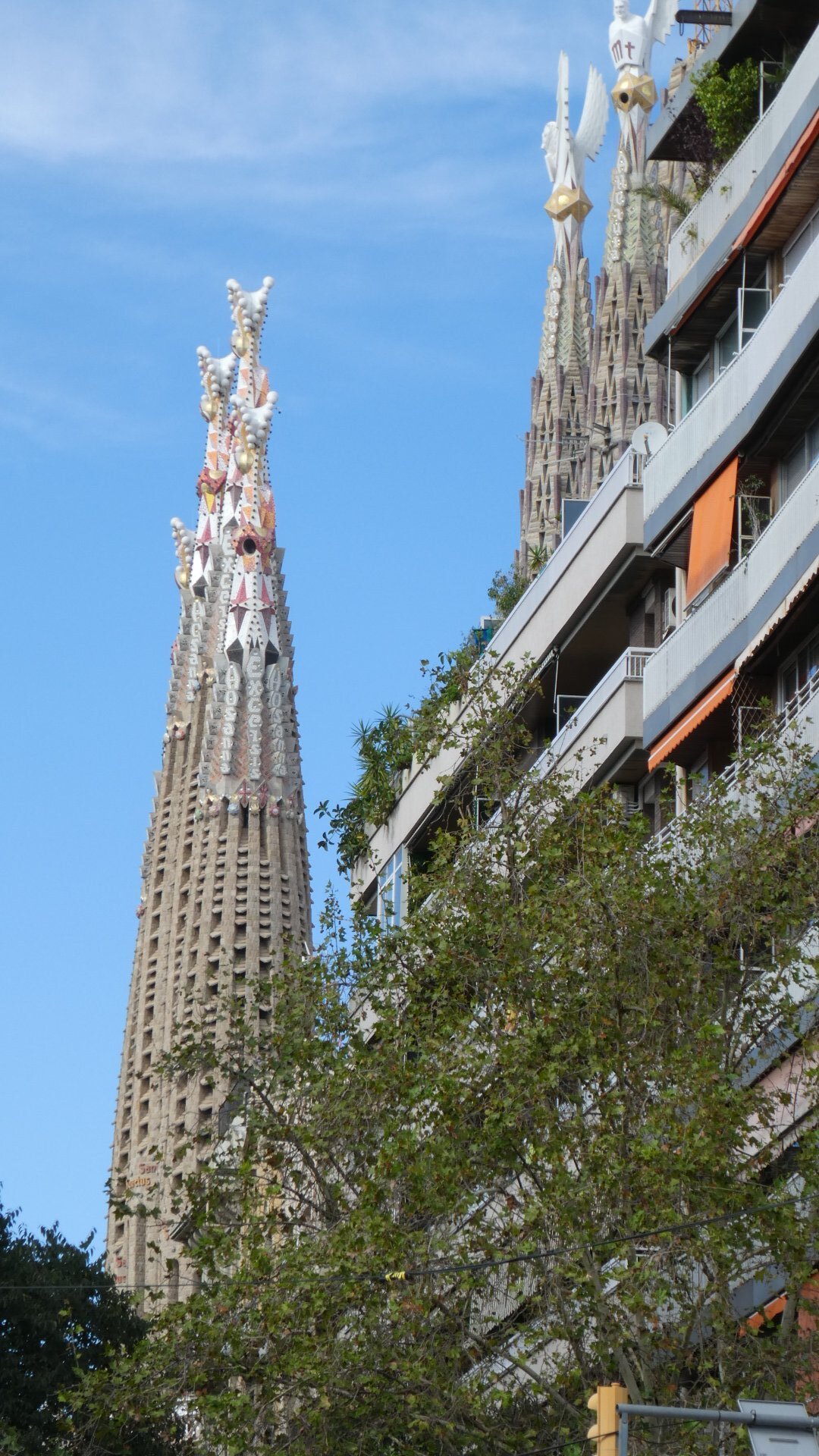 After dropping our bikes and gear, we decided to walk first to the Segrada Familia. We have all day in town tomorrow, and we will use that to look up some of the other sites. Segrada Familia, the church dedicated to the holy family and started by Antoni Gaudi in 1883 is probably the premier tourist attraction in Spain. It has a fascinating history and a lot to be said about its design and execution. Even the Wiki article on it is much fun to read. Lots of Cycleblaze writers have covered the Segrada Familia admirably. One good one is the Bartlett's from 2018. That is worth checking out, especially for a look inside.