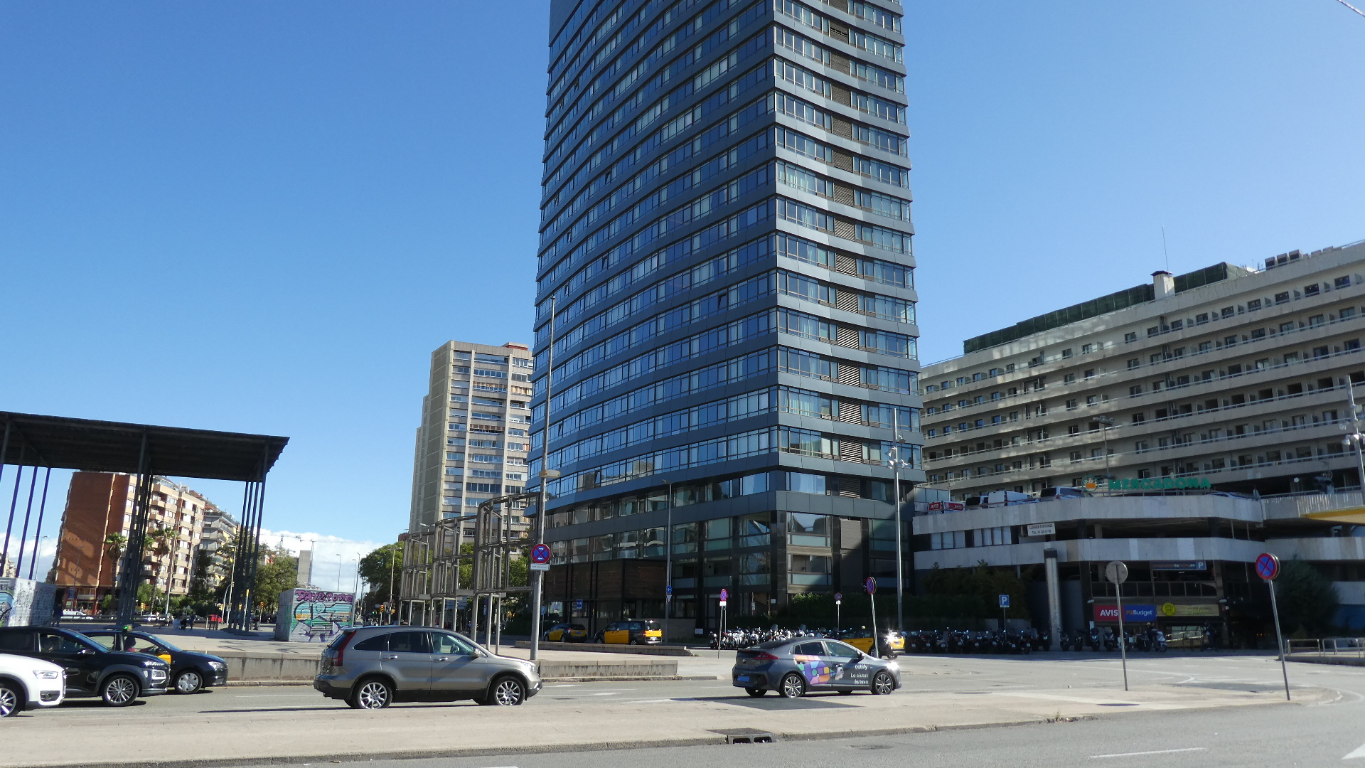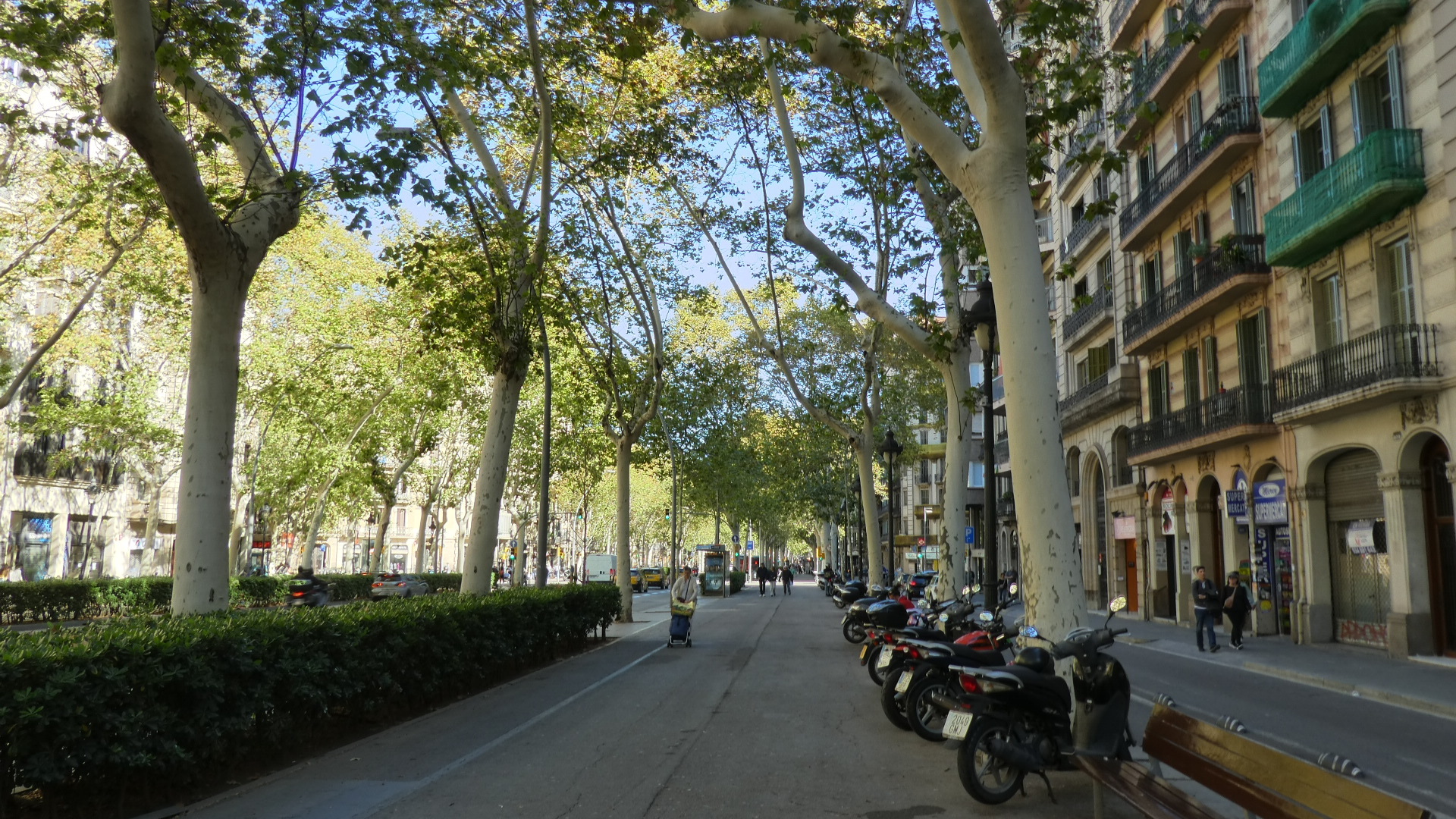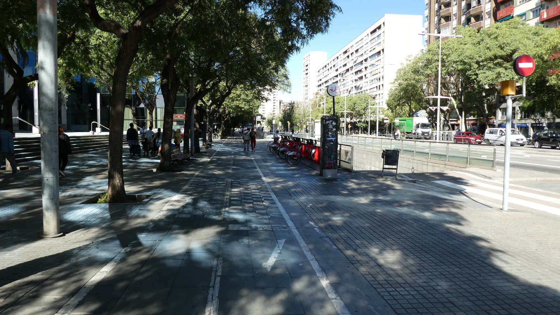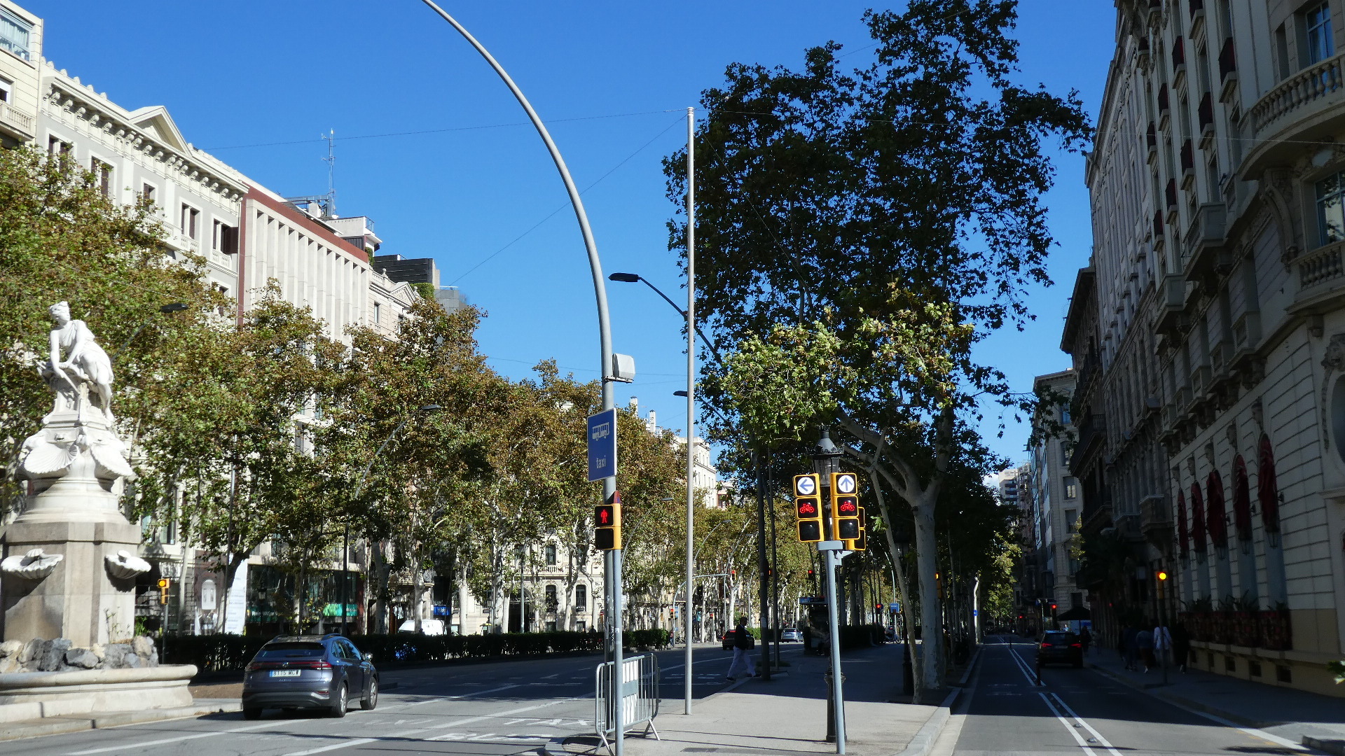 Of course right out of the station we were trying to get a sense of what the city might be like, and the initial view was of wide roads and nondescript tall buildings. Quite quickly we did get onto one very wide boulevard (Gran Via de las Cortes Catalanes), flanked by not ugly but not wow, eight story buildings. This boulevard went on for what seemed like a very long distance, making me think that this must be the major street of town. But no, looking at it later showed that grand street to be just one of many.