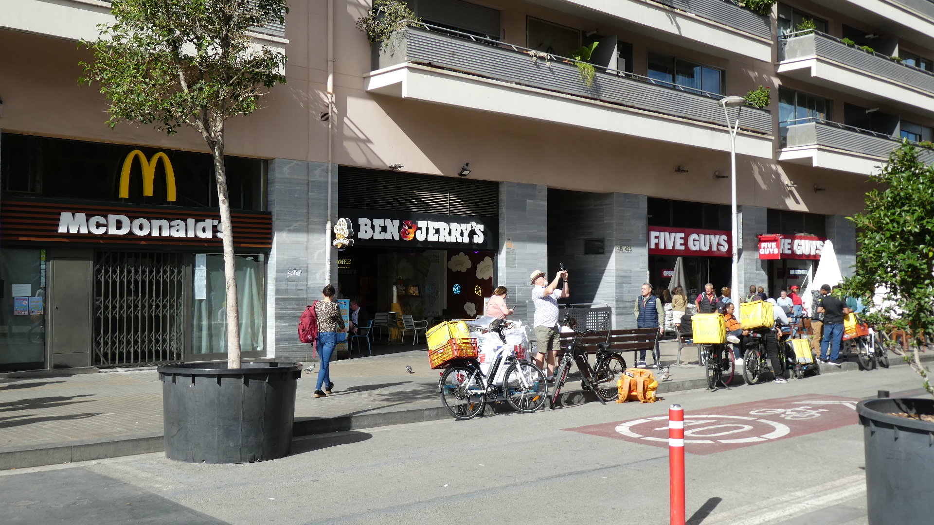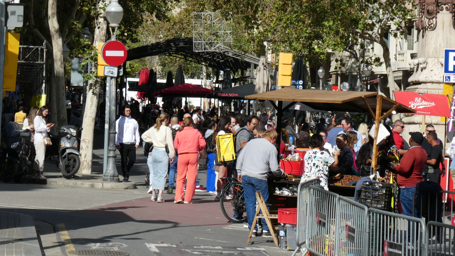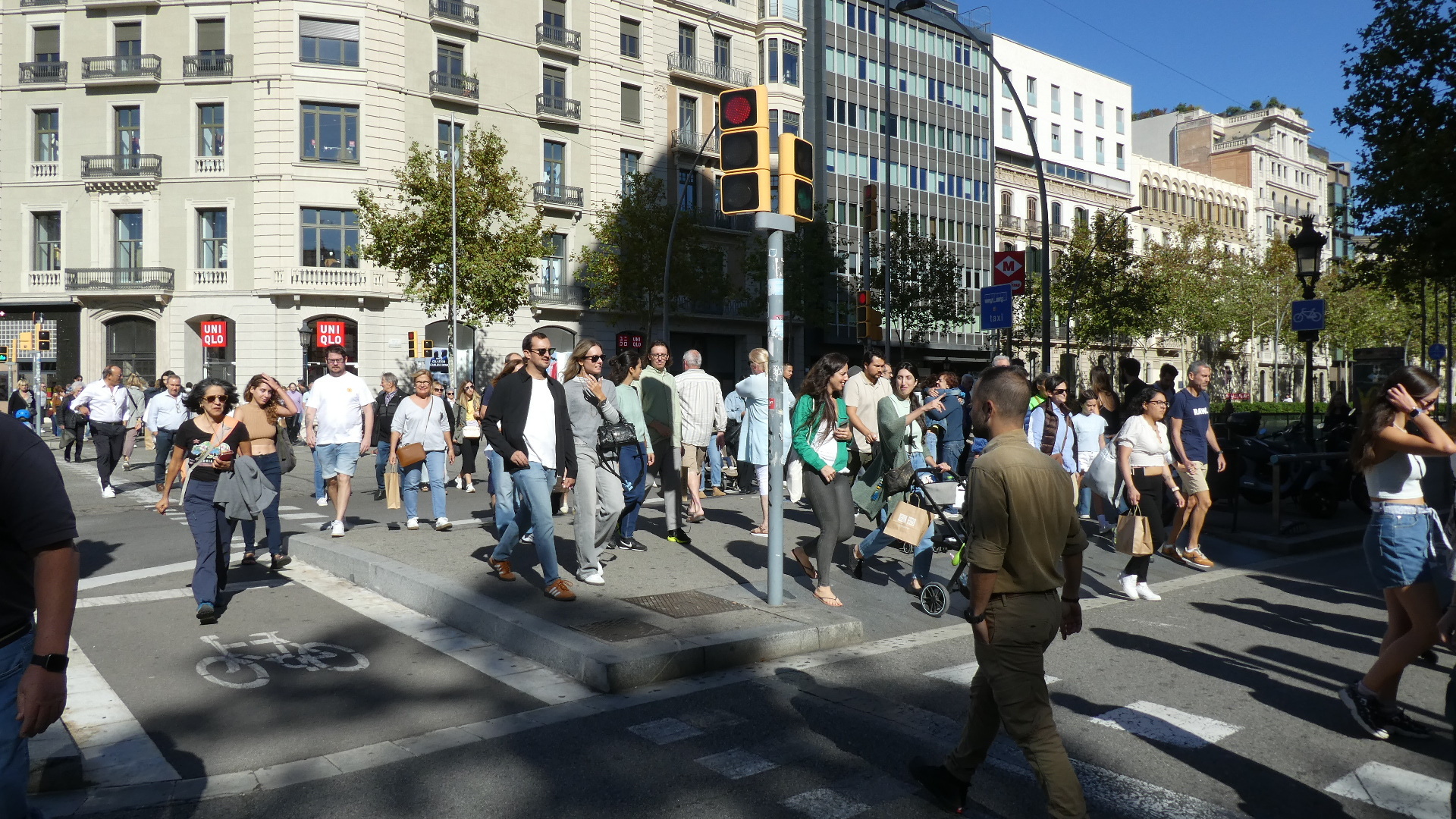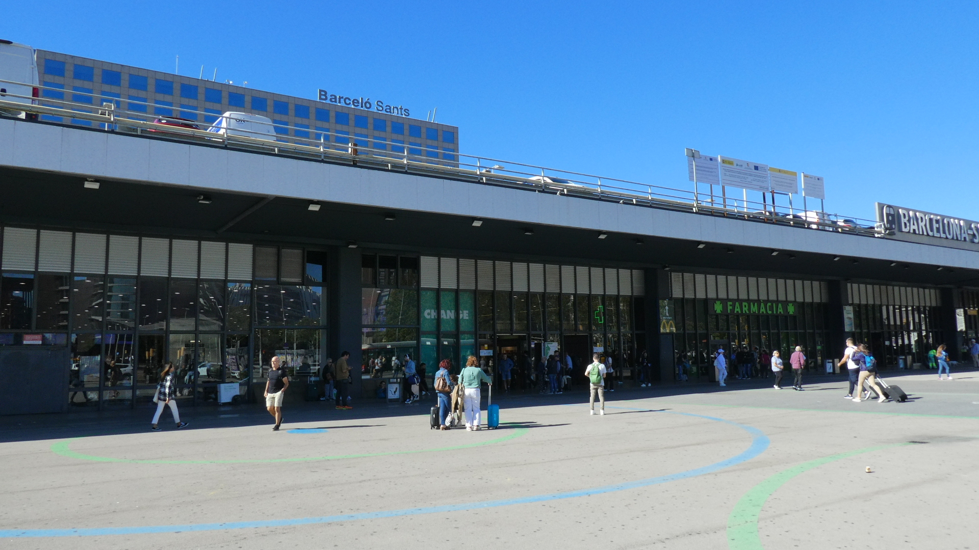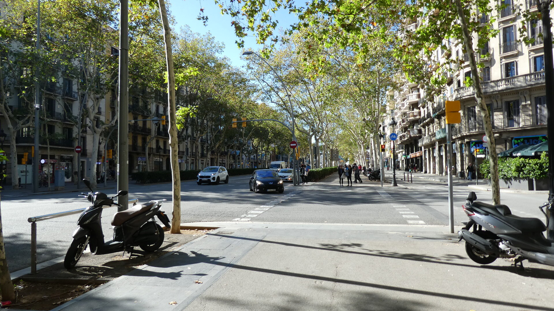 Of course right out of the station we were trying to get a sense of what the city might be like, and the initial view was of wide roads and nondescript tall buildings. Quite quickly we did get onto one very wide boulevard (Gran Via de las Cortes Catalanes), flanked by not ugly but not wow, eight story buildings. This boulevard went on for what seemed like a very long distance, making me think that this must be the major street of town. But no, looking at it later showed that grand street to be just one of many.