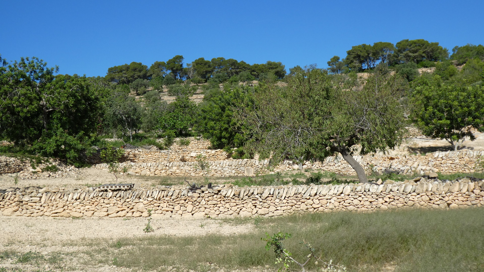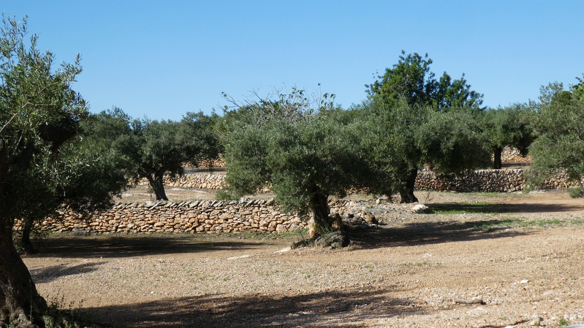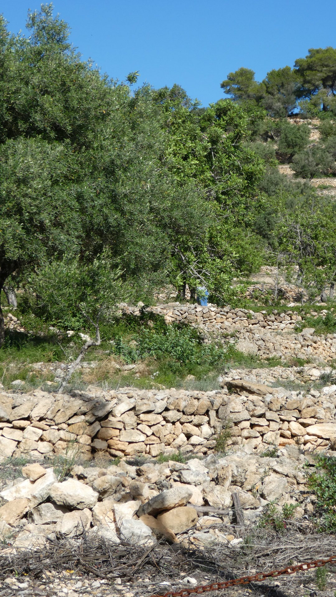 Just as sometimes we get taken up into the vines by a route, we now went up into the olives. We could see here the value of the many stone walls, which were creating terraces, or at least were blocking runoff.