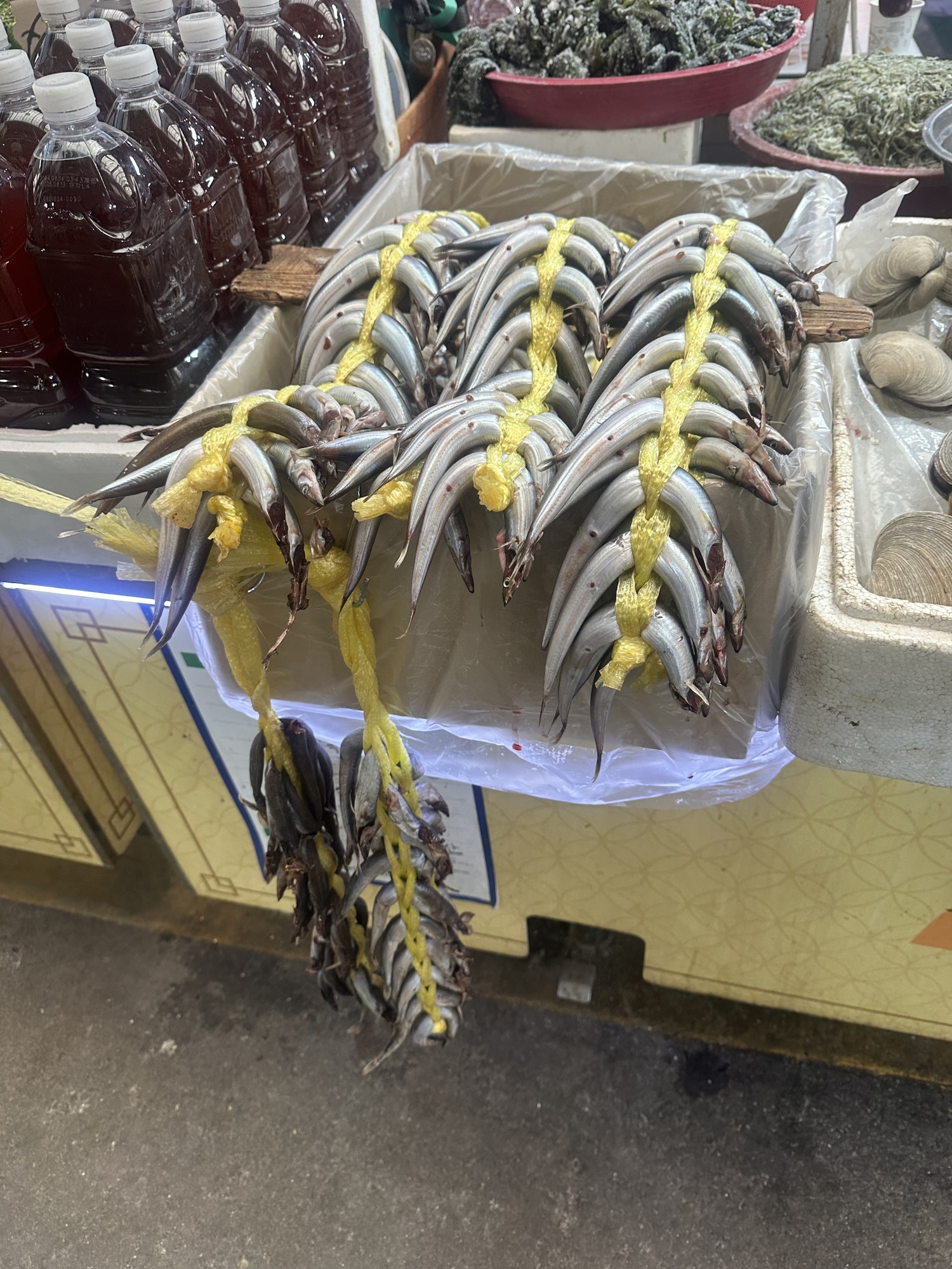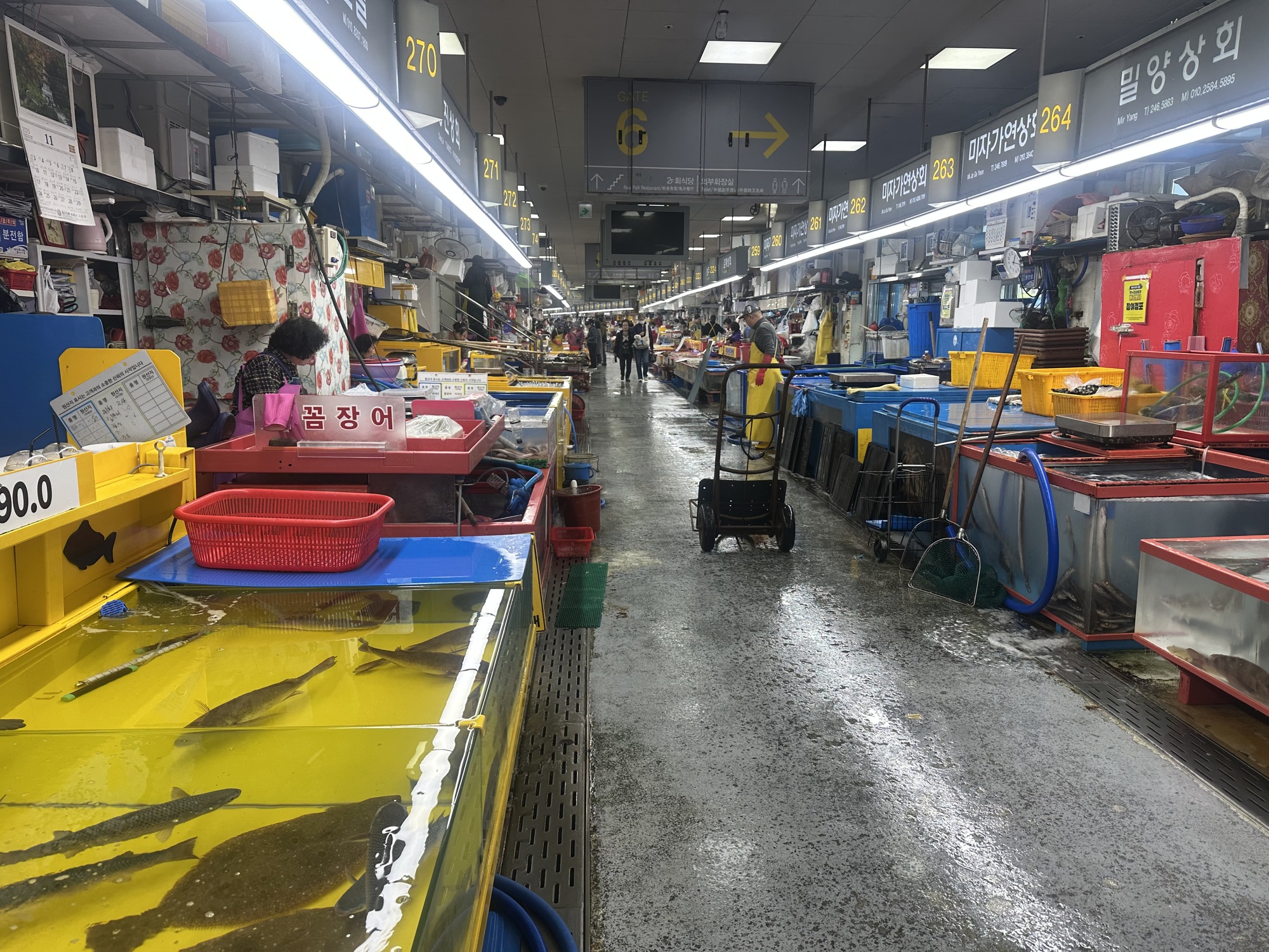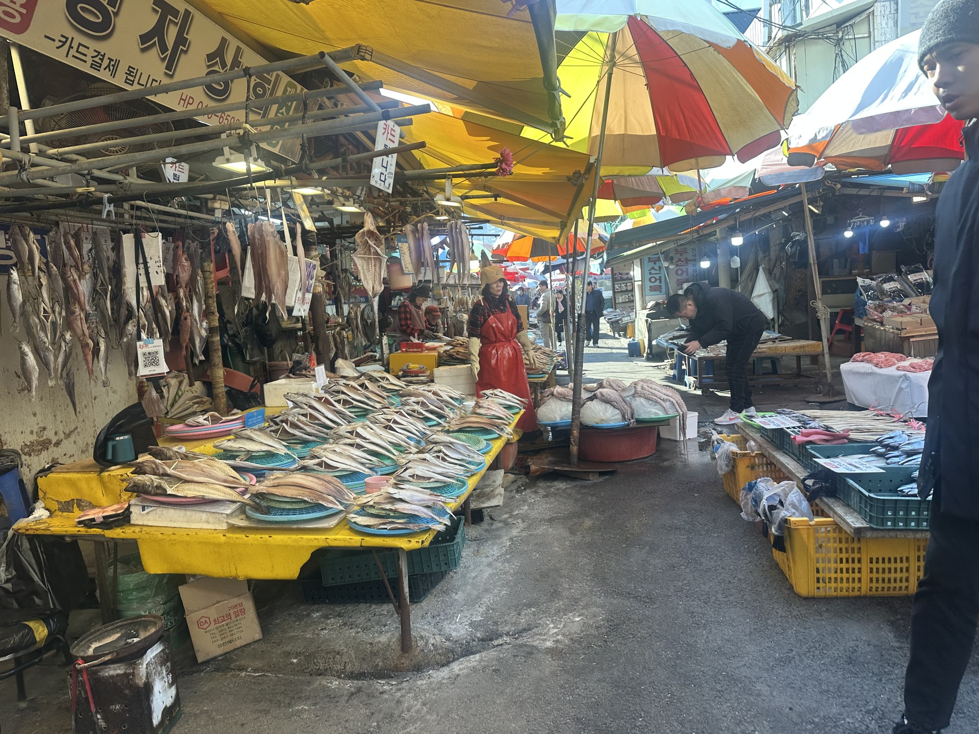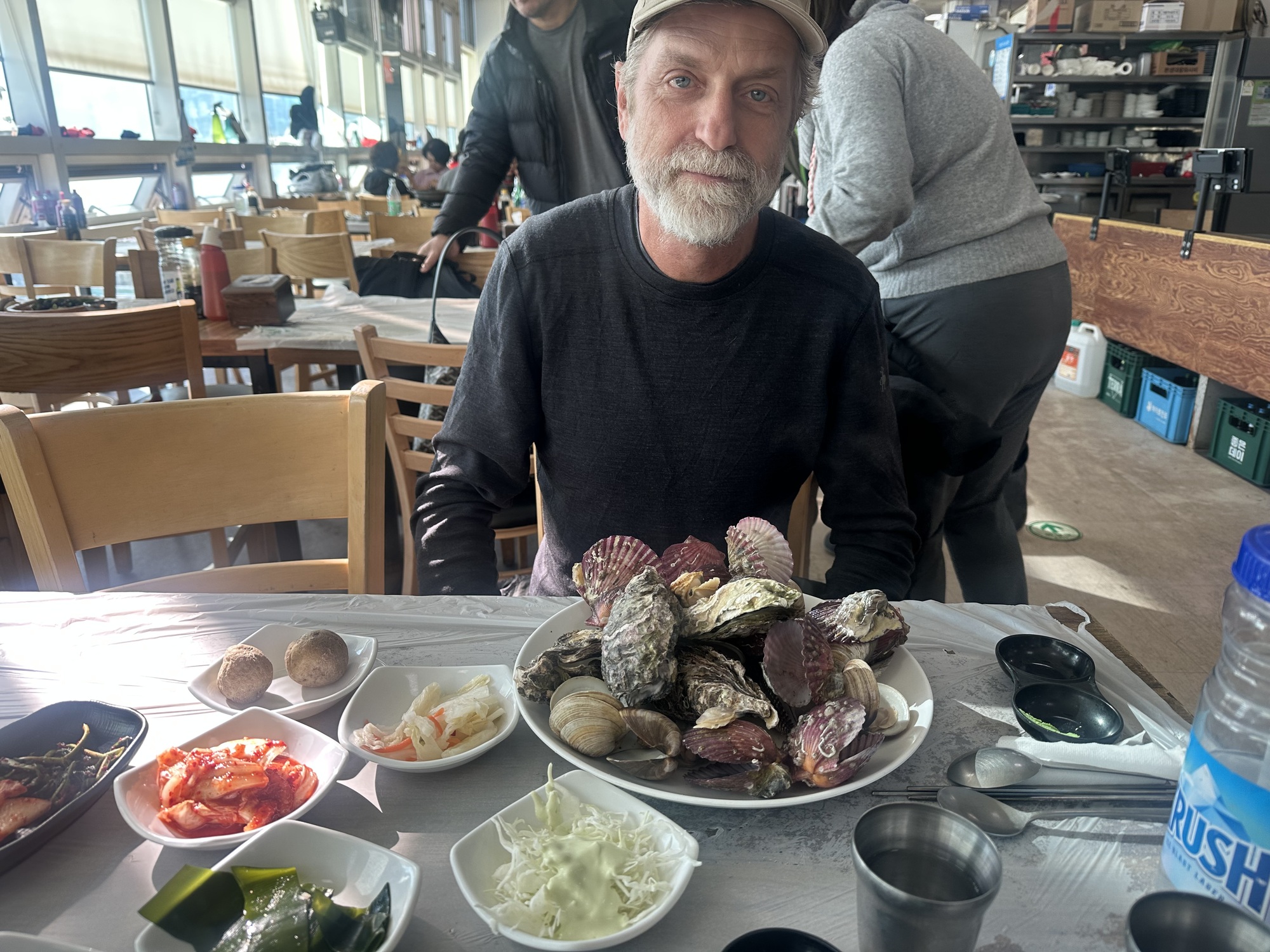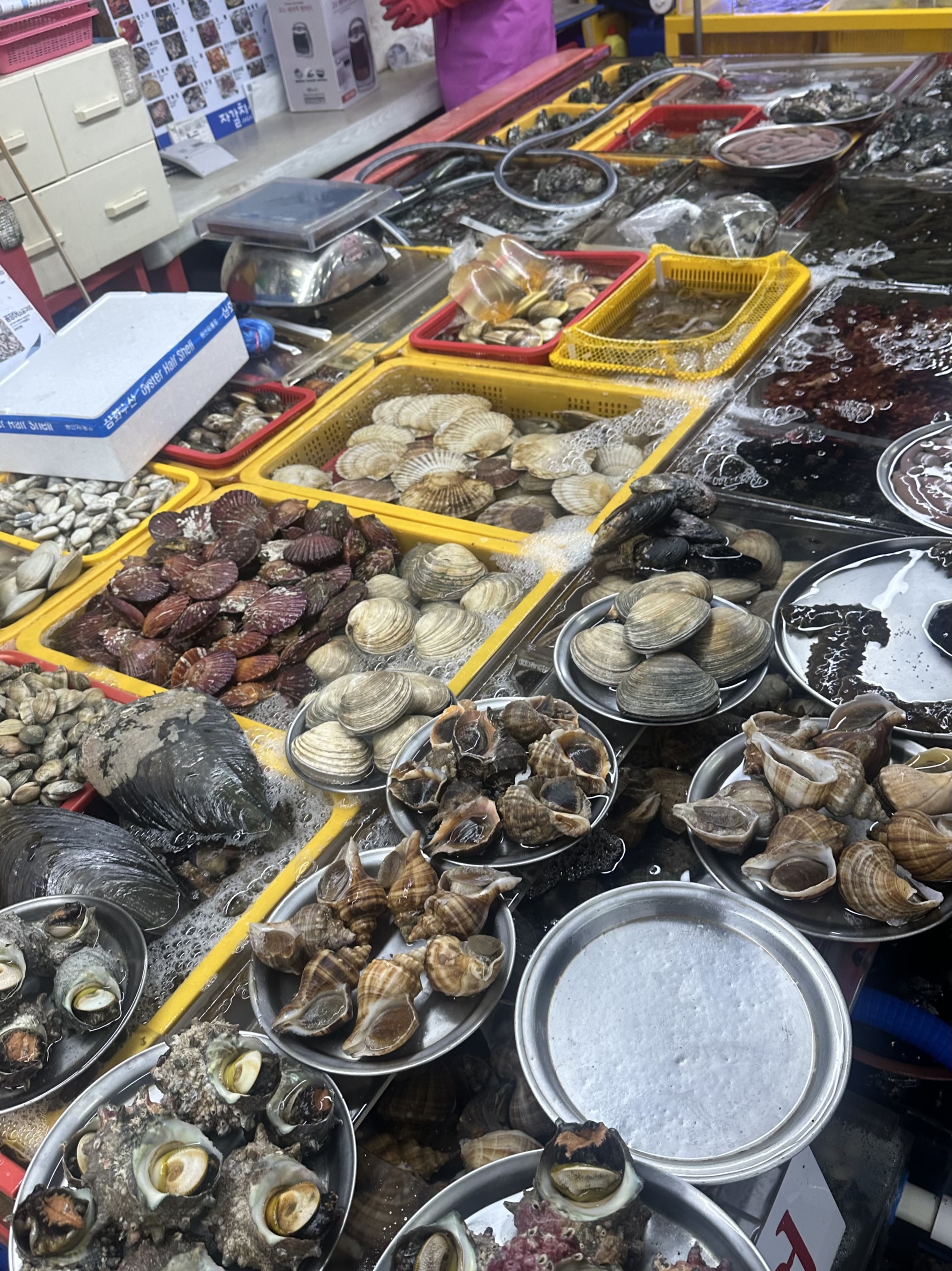It didn’t take long before a vendor had got Tom’s attention and before we really knew what had happened we’d bought a bunch of shellfish and were being led upstairs to a restaurant to get it cooked. Turns out the entire upper level of the market was a dining area, with different kitchens serving up the fish the diners had selected below. Around us were several big rowdy groups eating massive amounts of seafood and washing it down with equally massive amounts of soju.