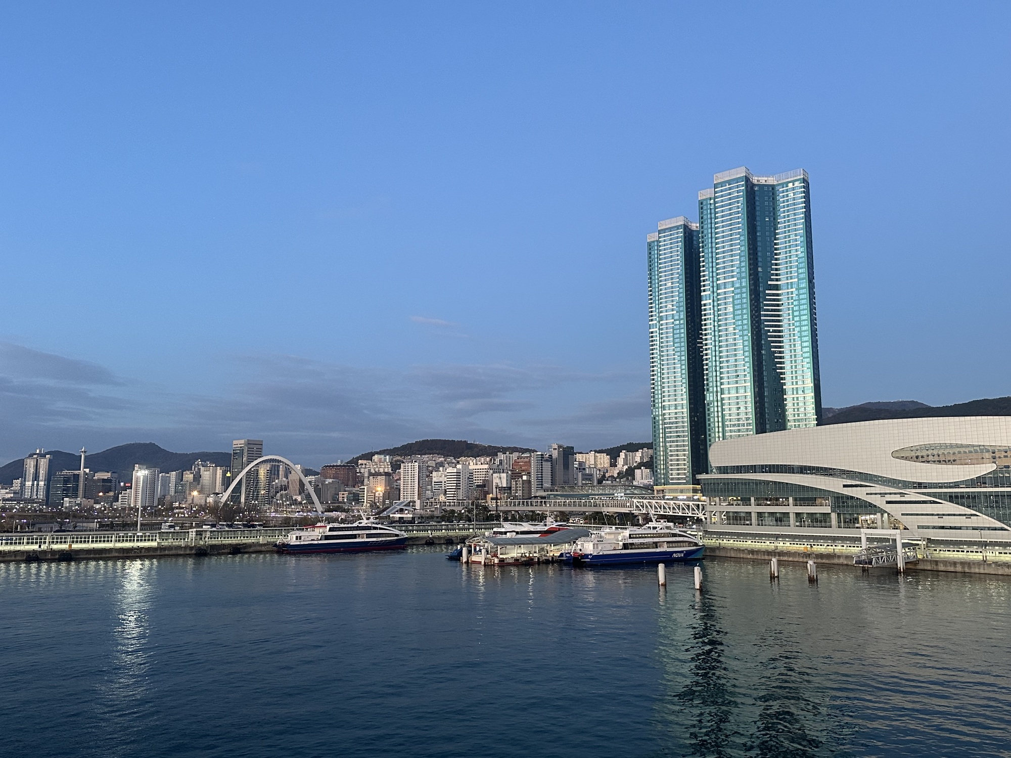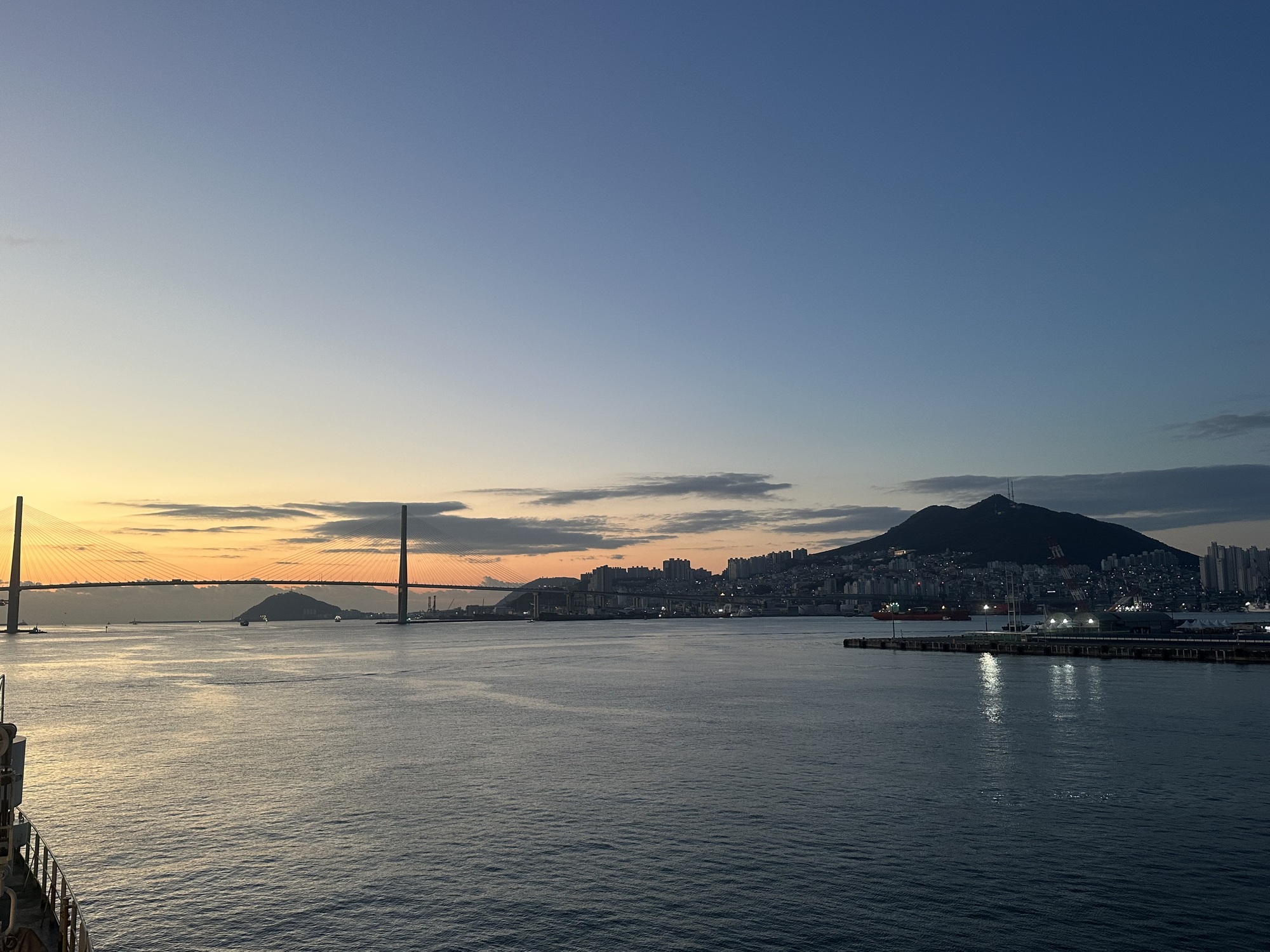 After a rather wild night at sea — the ship was rolling and heaving through big waves for hours, everything in our cabin creaked and groaned from the strain — we woke up to clear skies at dawn in Busan harbour.