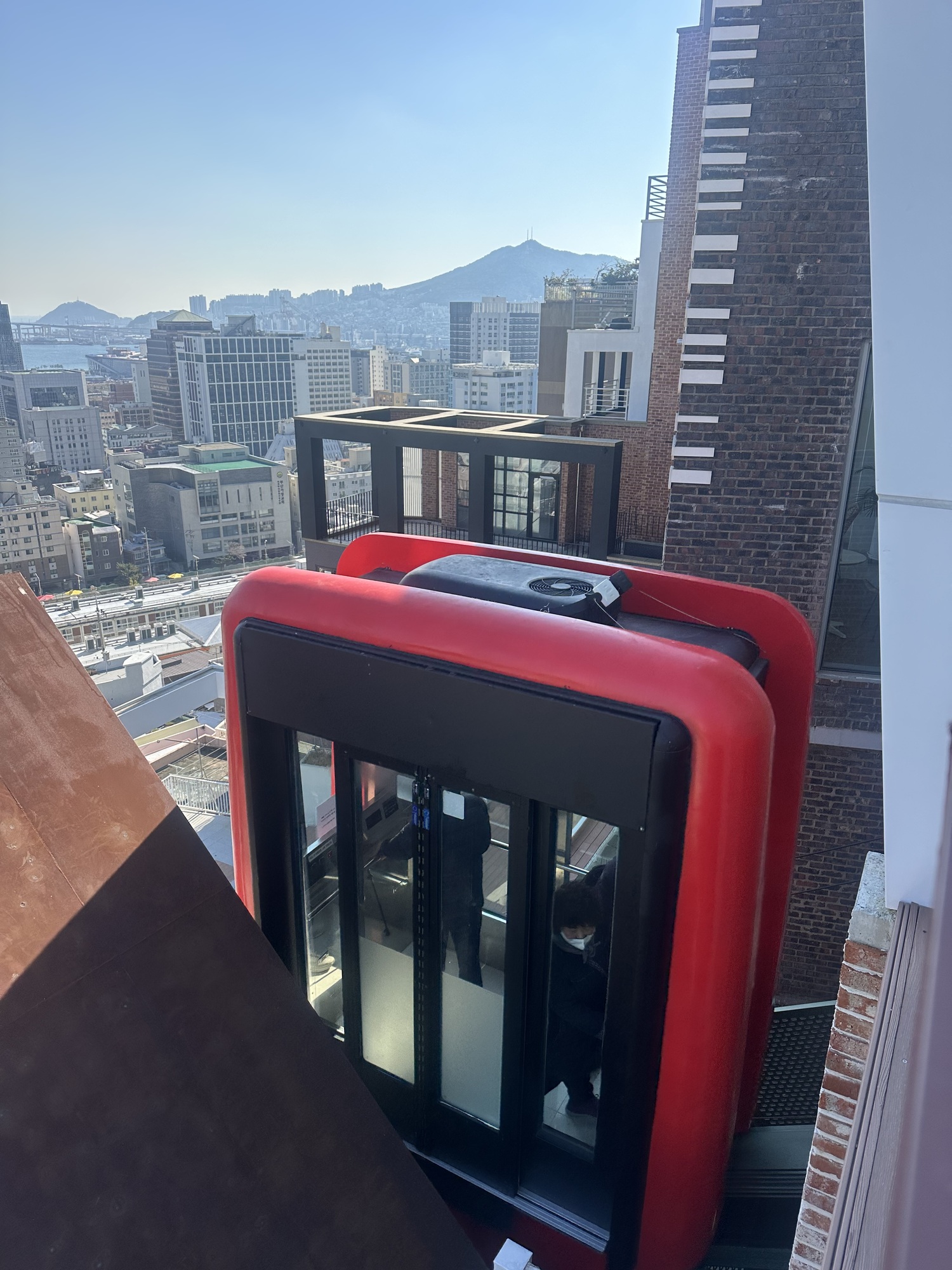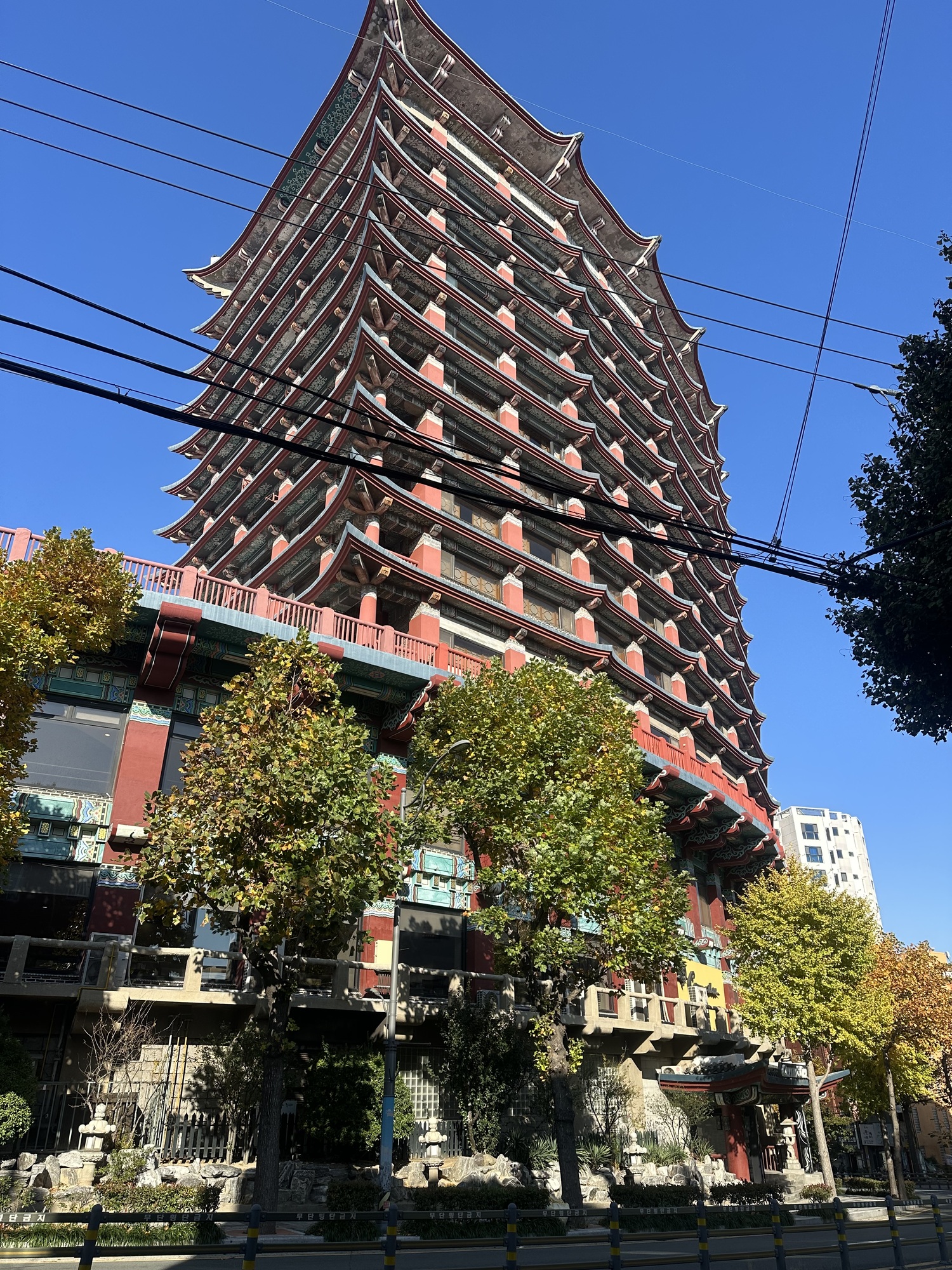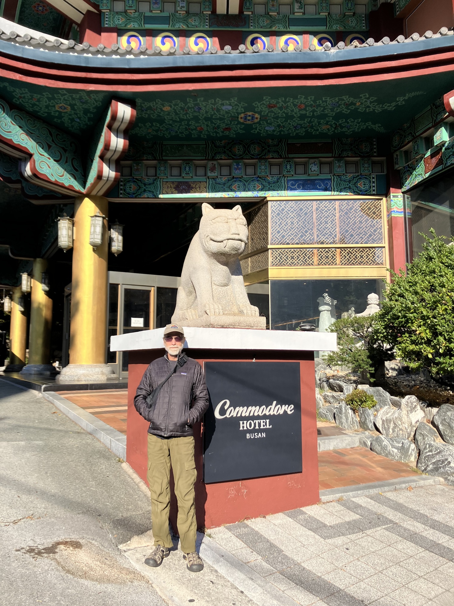 Eventually it occurred to us that the street we were on seemed to be endless, with no intersections or side streets branching off it. Off to one side, up on a hillside, we could see the top of a building, and a sign: Commodore Hotel. Our hotel! But the street we were on carried us past the vision of our hotel, offering no exit. We figured eventually it would connect to some other street, so we stuck with it and sure enough eventually we were able to branch off onto a side street — which promptly began to behave in exactly the same fashion as the first street, just sailing on endlessly. Well, in the end we got to the hotel, but it was a struggle that was only solved by noticing an elevator that took us from one street to the street above it, and then a lot of backtracking. Busan, it turns out, is incredibly hilly, with streets linked by tortuously steep staircases winding every which way.