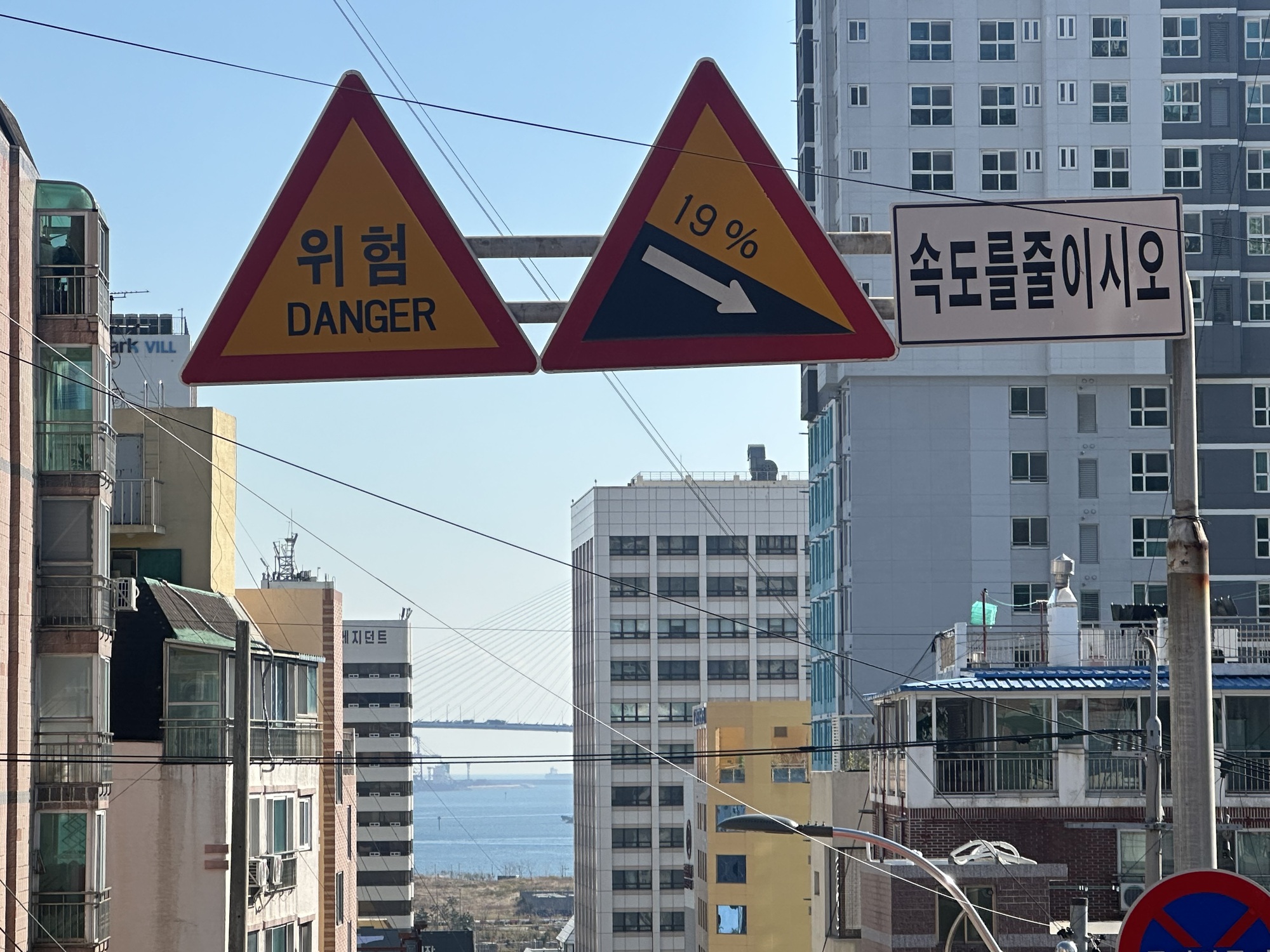 We cleared immigration and customs quite speedily, and were outside the ferry terminal by 8:30am, with about 2km ahead of us to get to our hotel. We were wondering what the reaction from the front desk would be if we tried to check in at 9am, but, as it turned out, that 2km proved very difficult to navigate. Google maps doesn’t really work in South Korea (the government blocks it for security reasons) and the substitute app, Naver maps, seems less useful. It routed us onto the approach to an expressway, which we luckily realized before things got too hairy, and we had to backtrack and reroute, eventually getting ourselves to the central train station. We walked the bikes from there, as the traffic was hectic and we didn’t really know where we were going — plus it gave us the opportunity to gawk at our surroundings like a couple of country bumpkins — the streetscape in central Busan was pretty impressive!