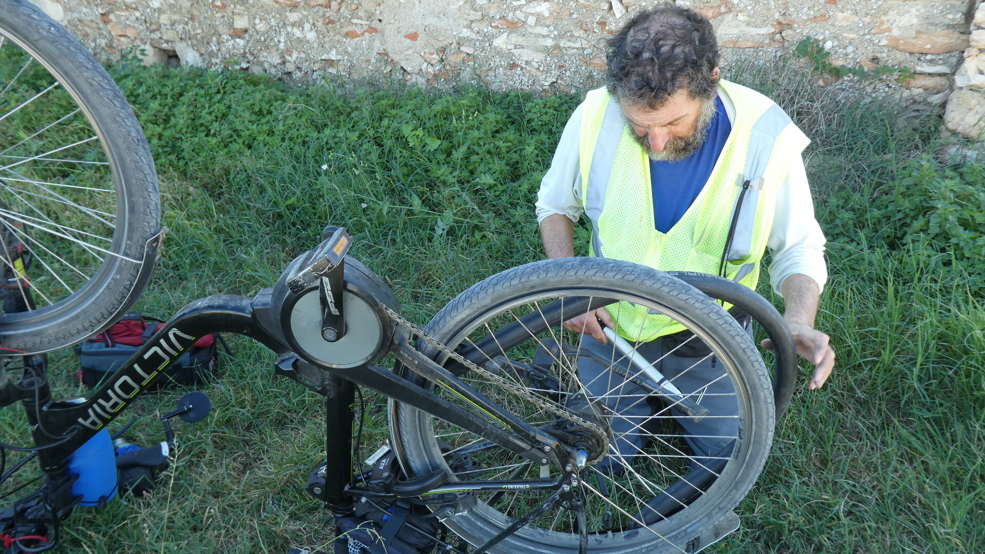 We succeeded with our trick of not removing the wheel, and not replacing the tube, but rather of looking for the puncture piecemeal. Dodie is good at spotting obscure leaks, so then we can patch them.