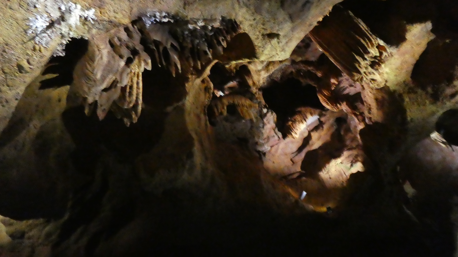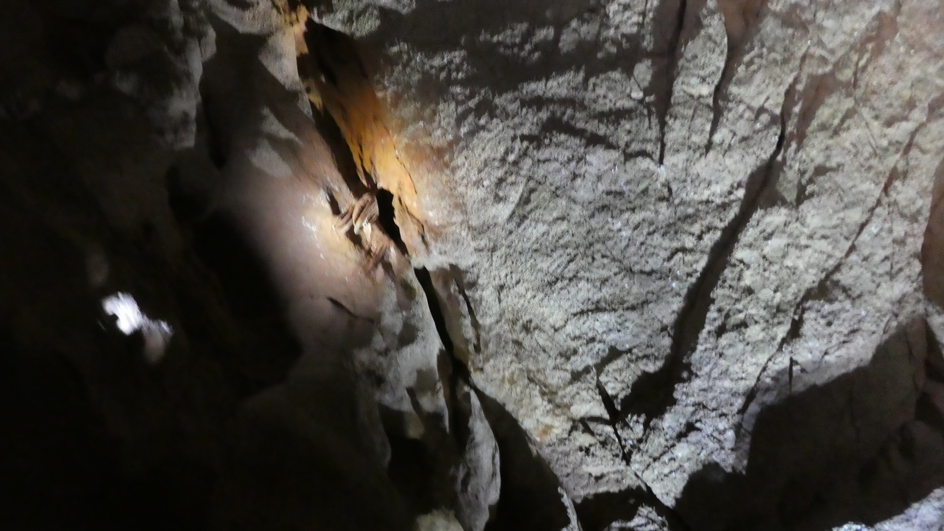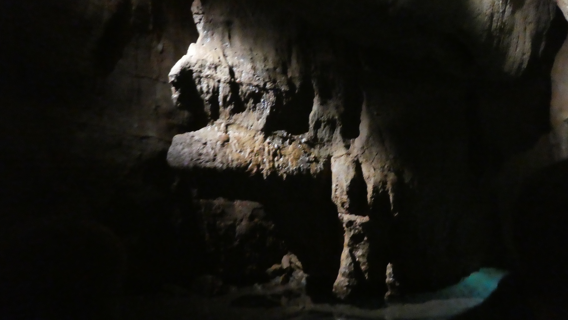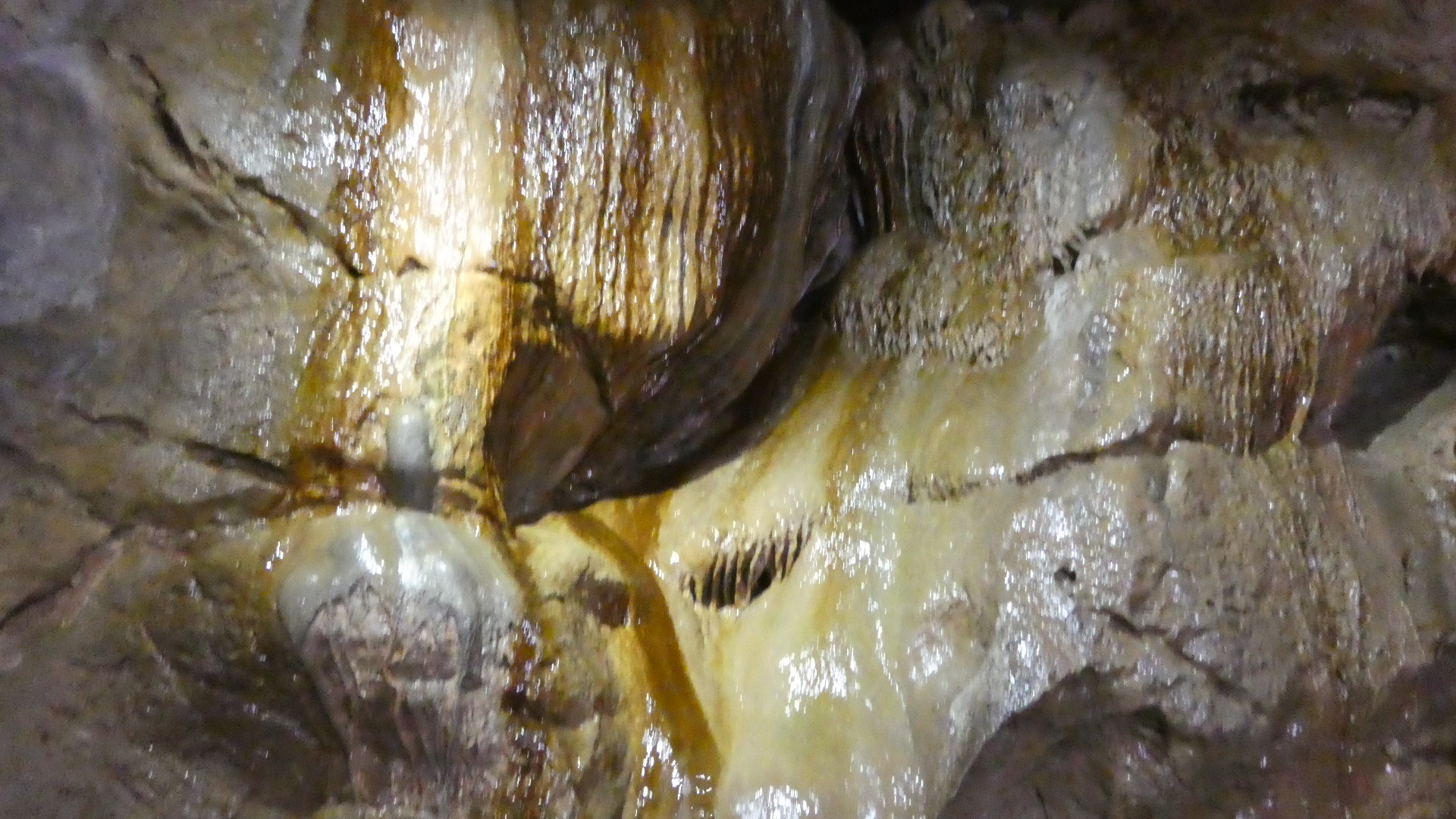 As is commonly found in caves, there are coloured mineral deposits and strange shapes. Photography is hard, not only because it's not allowed (and flash would be a bit of a giveaway) but because it's hard to give context and perspective to a shot.