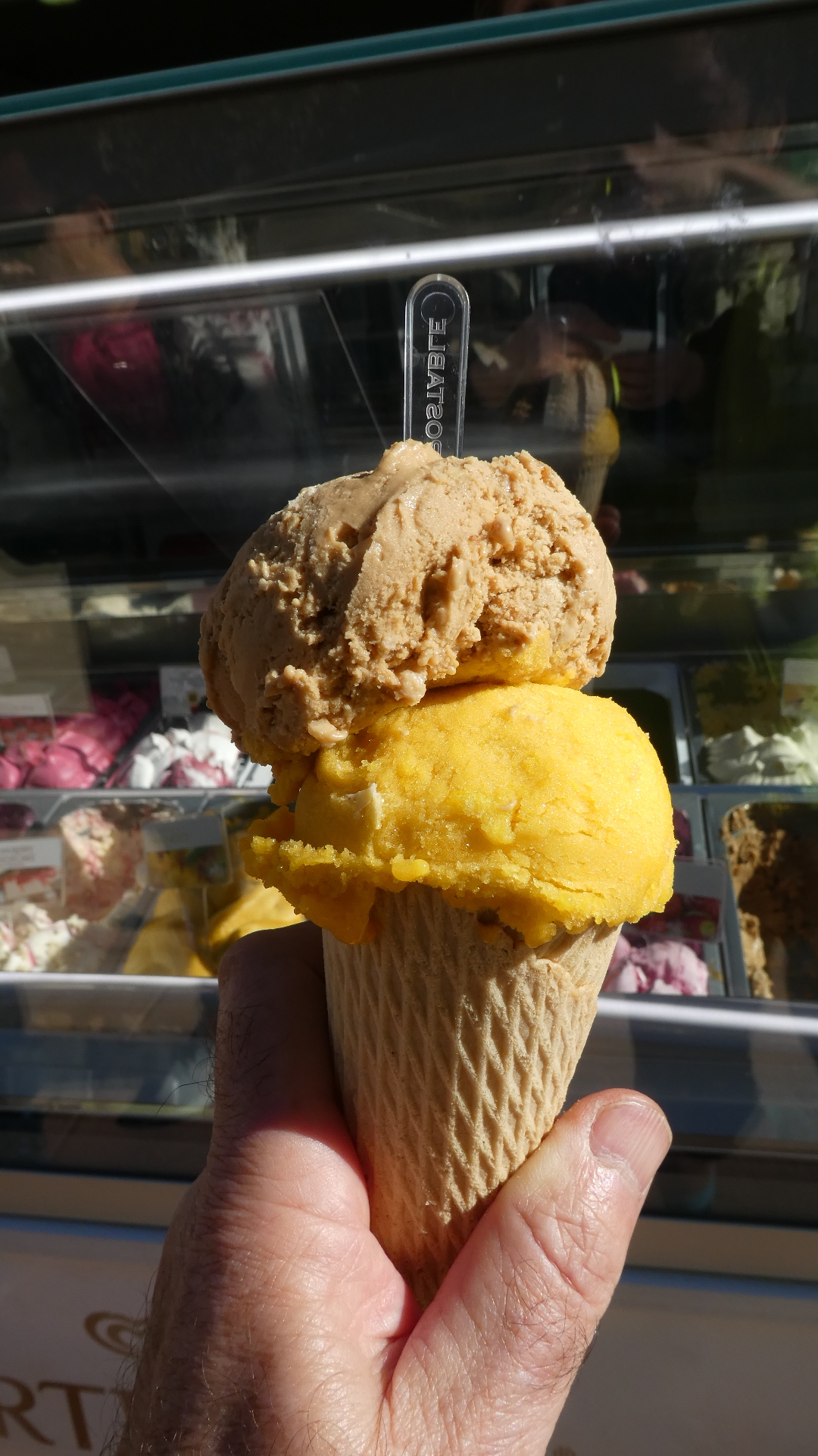Having absorbed enough religion and archeology, it was time to check out the gelato, especially with the sad thought that this could be the last of this trip. So what was the momentous choice for this event? Mango, which is SO good here, and Torron, which as we now know is Nougat!
