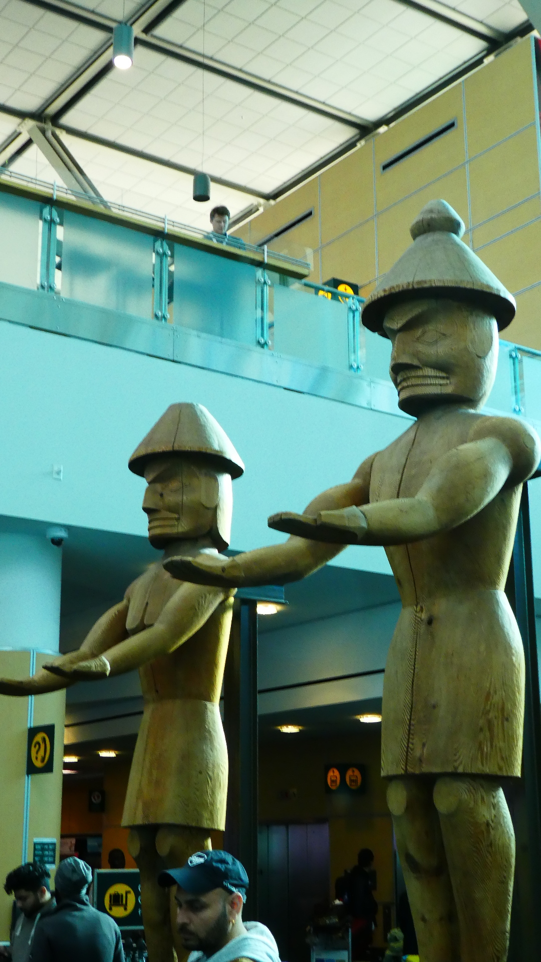 Vancouver's airport was noticeably cleaner, brighter, and better organized than either Valencia or Paris. As usual we noticed the extensive use of indigenous carving, which is something we look on as an unfair cultural appropriation. In fact, the statues below, for example, seem none too pleased to be greeting the hoards of foreigners.