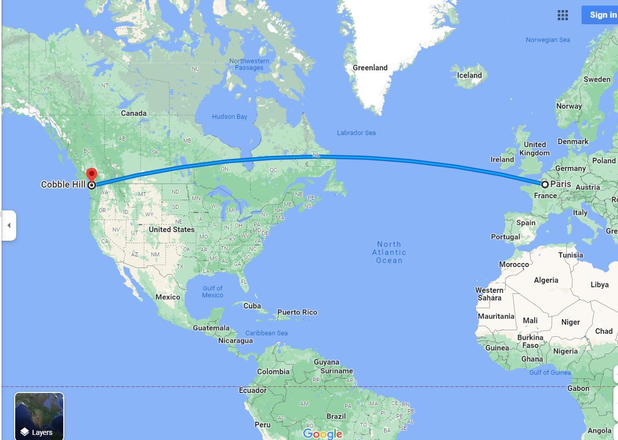 This time we were going Air France all the way, with a hop first to Paris, and then direct to Vancouver. In simplistic terms, it looks like the maps below. These have little information, but do illustrate that it's quite far to home.