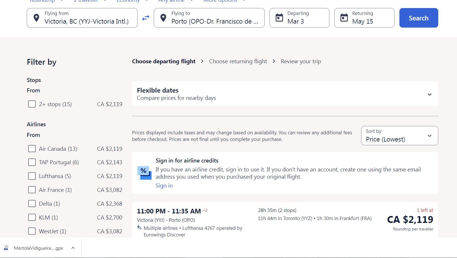 We compiled the figures for this page last night, from our actual bank records and from Expedia searches last night. Today I thought the boring all text page would be livened up by an actual frightening Expedia search. So I ran one just now -and lots of return trips popped up at $2,100. ($4,200 for two). That is Victoria to Porto with little lead time - pretty cheap? Now I really don't know what to think. What's more, our friend Marsha wrote yesterday that we should lay over in Toronto, so she could come see us. The flight shown has 12 hours in Toronto. Could have been great!