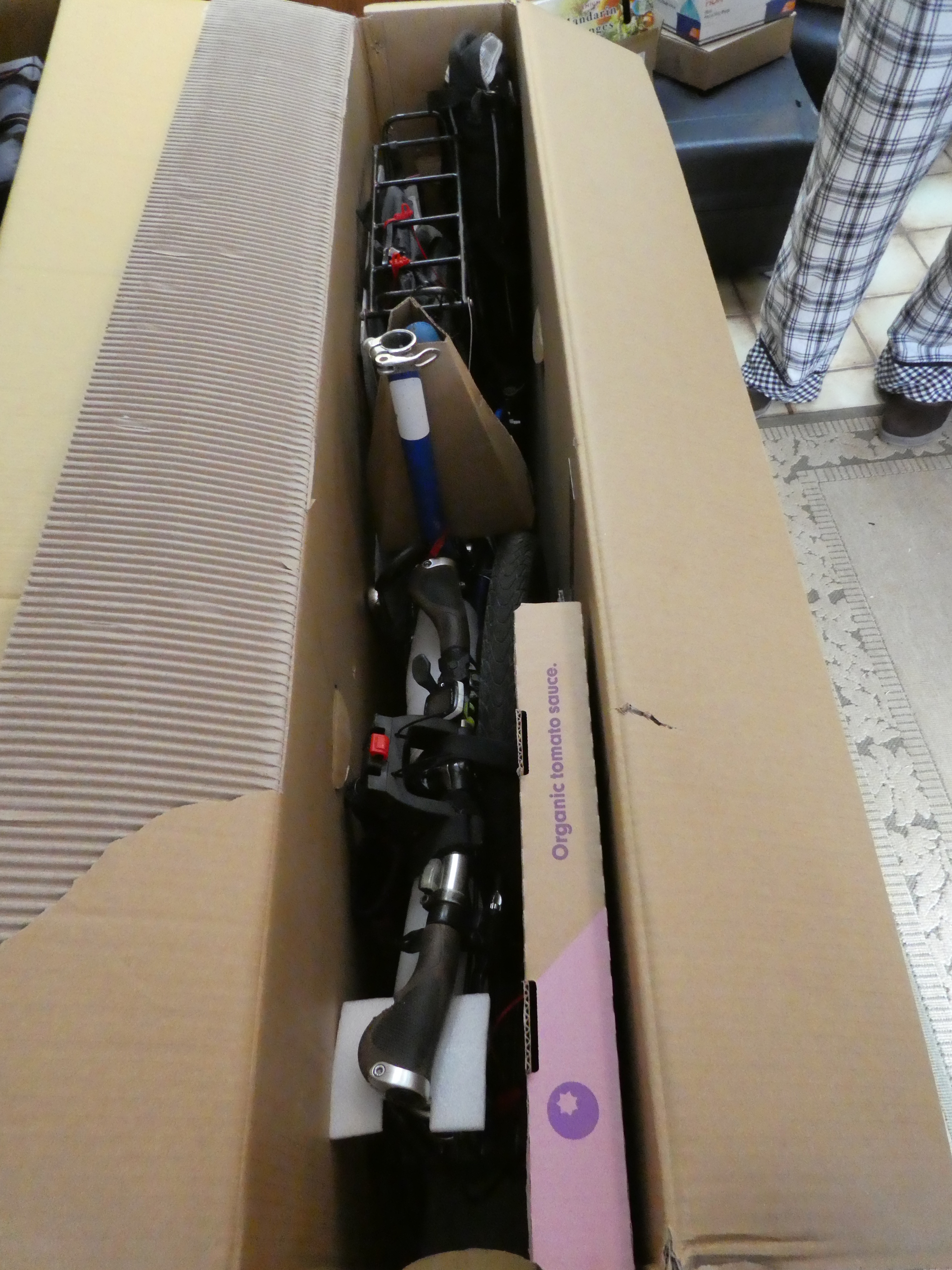 With the front wheels off there was the question of where to stash the wheels, which had to share space with the also removed handle bars/steering tubes and seat posts/saddles. We ripped one box shoving the wheel in. And with the wheels gone, the spiky rack bottoms wanted to poke through the bottom of the box. So we had to find some reinforcement for the box bottoms and add tape/cardboard to the ripped box beside the wheel.