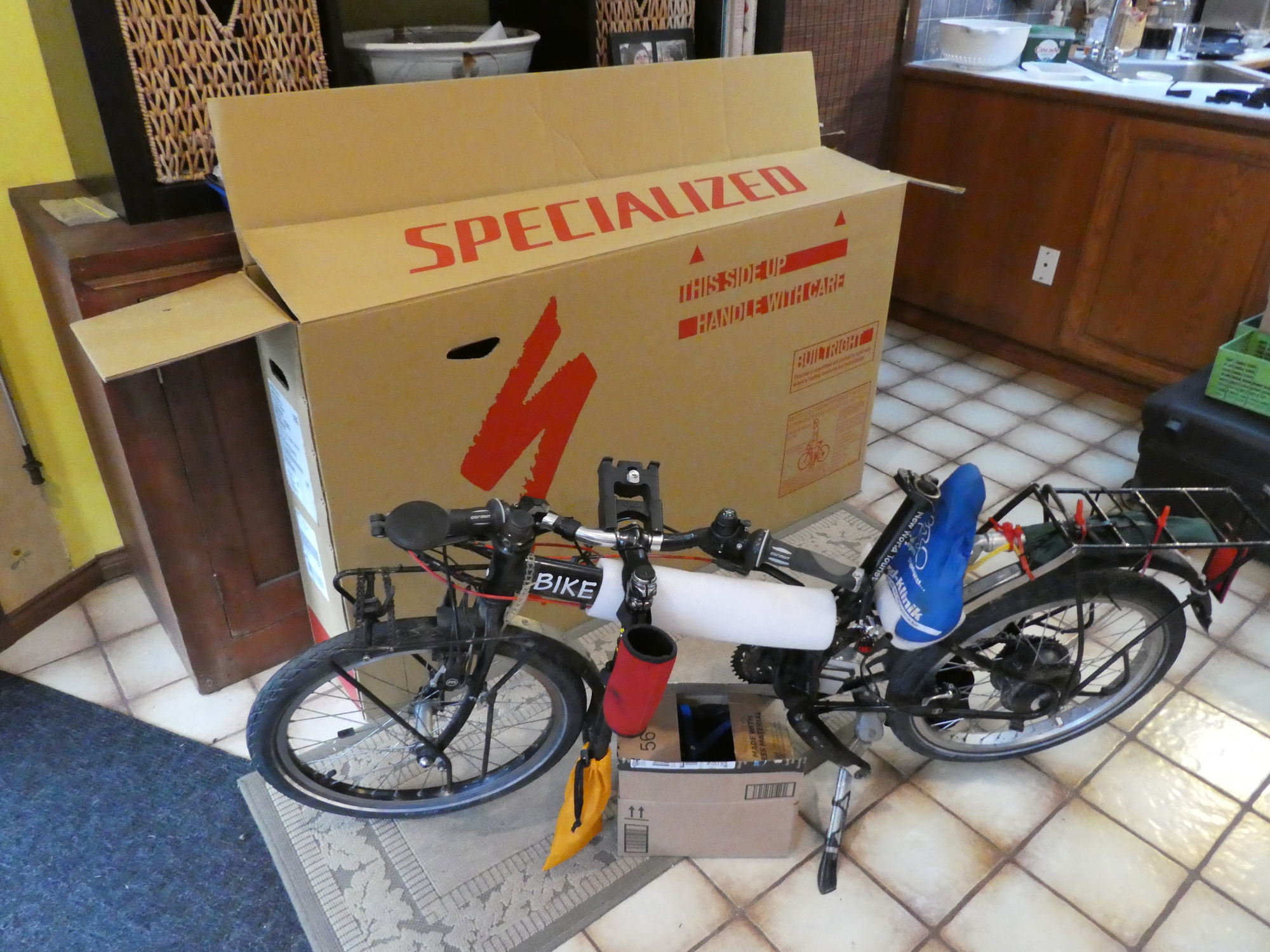 However, we discovered that the boxes wouldn't be provided until check-in, and we couldn't check in until 3 hours before the flight. It might have been even less time; things have changed a lot in the past 30 years! In any case, the boxes provided were gigantic, the size Via Rail uses. Pedals off, turn the handlebars, deflate the tires, and drop the bike in. A 10-minute job.