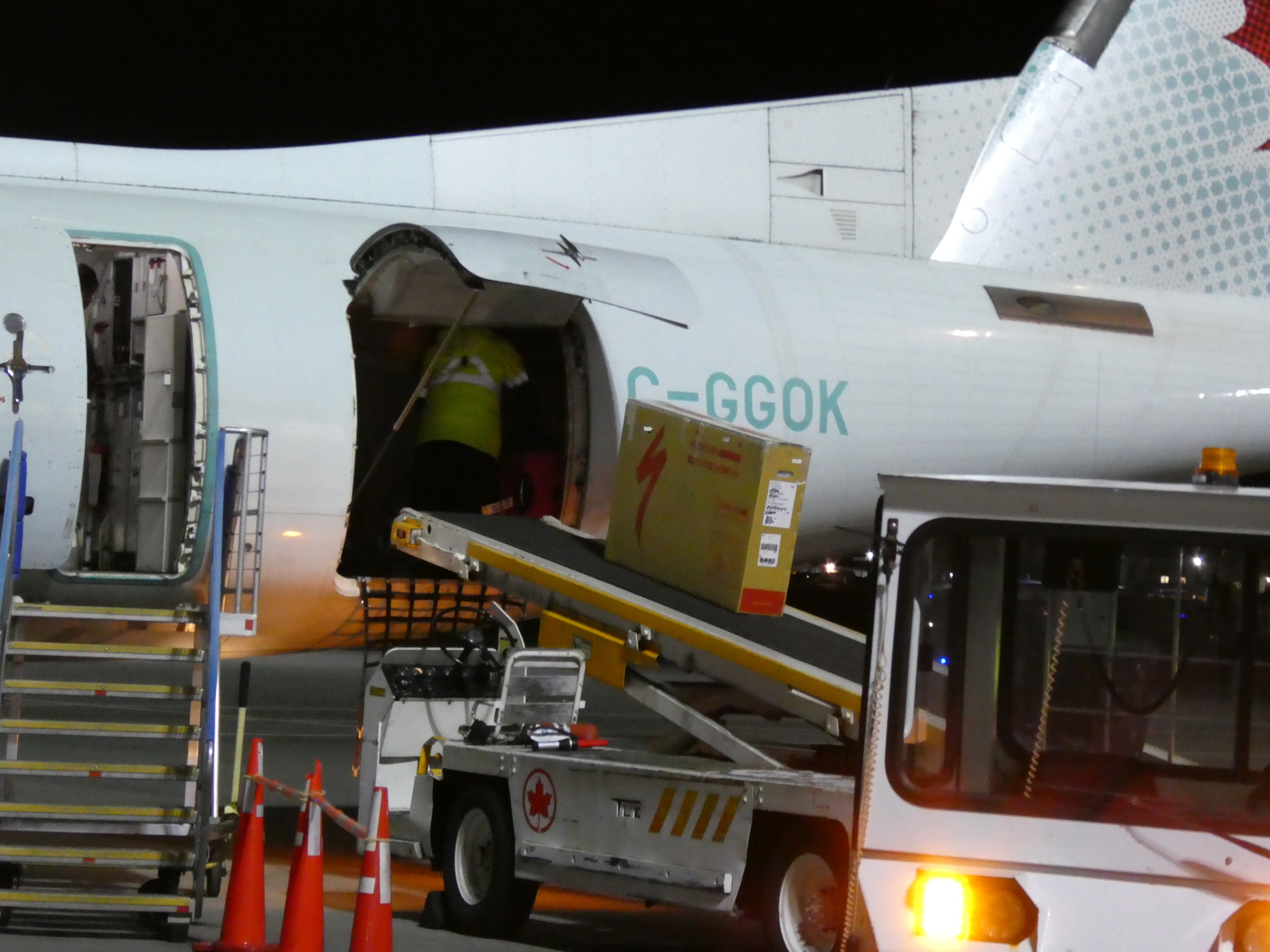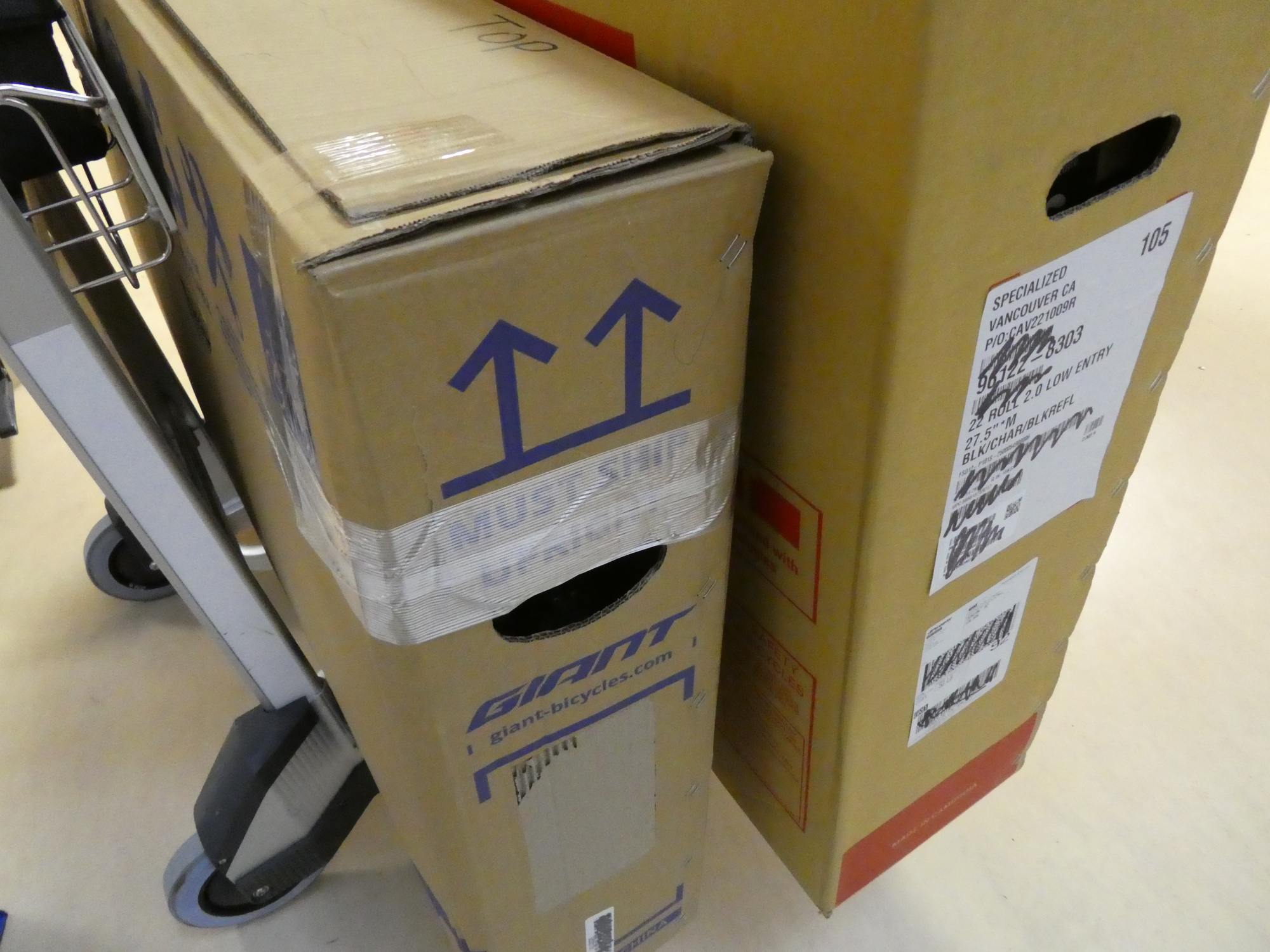 Update: We've made it to Vancouver, but we think the bike boxes are already having a hard time. Here they are boarding. Despite all the this way up signs, one is already down!