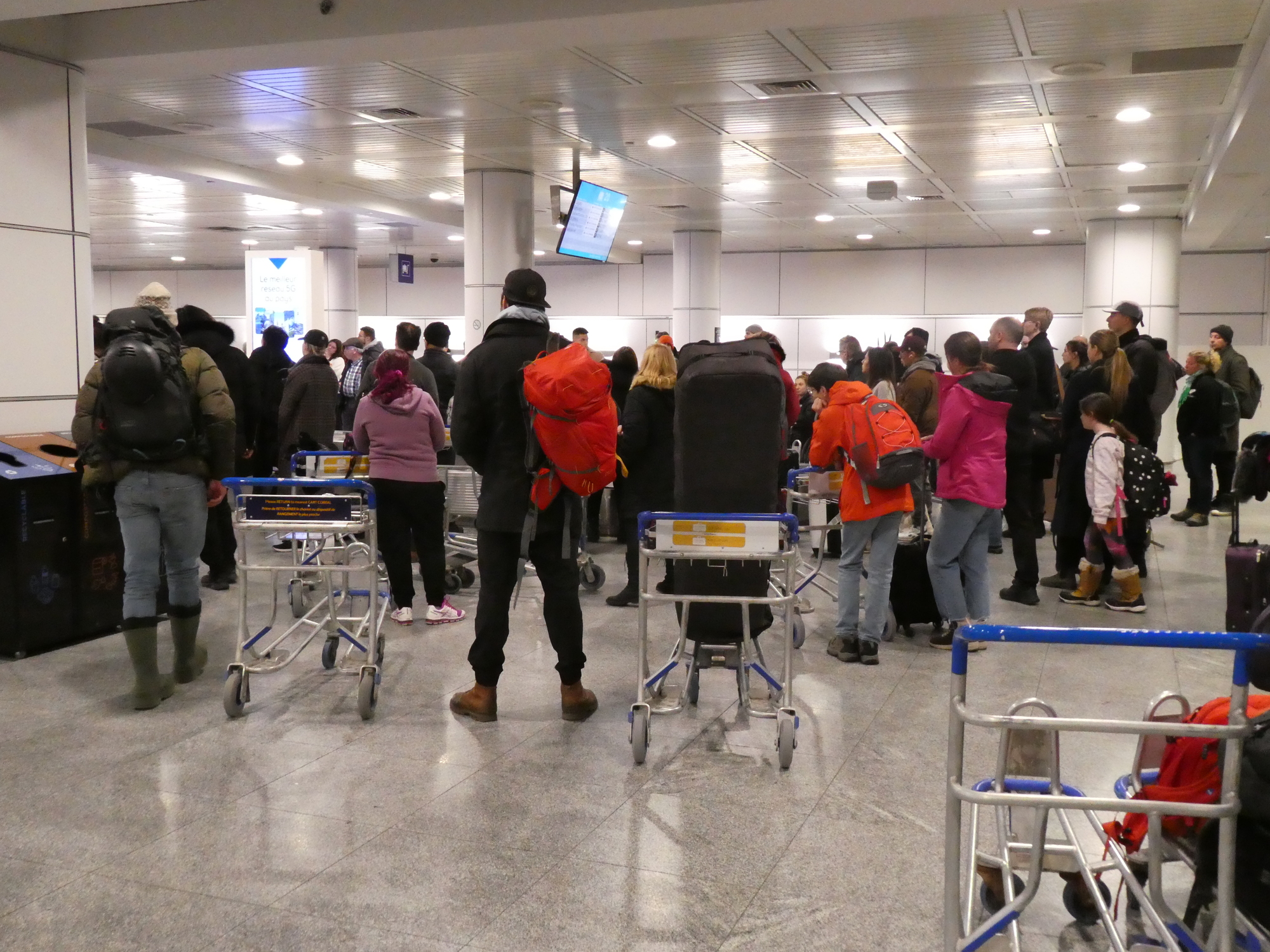 Our game is to leave the bikes at the airport, at their baggage check service, for what amounts to four days. Given their daily rate of $20 each, it will cost $160 plus tax. Oh well, we are getting used to the bicycle related hemorrhage of money. Even though it did not turn out to be true in our case, I thought the baggage check's sign amusing for its candour. A loose literal translation could be "Leave less weighed down, without going bankrupt". The english translation on the wall is considerably more elegant, but inaccurate.