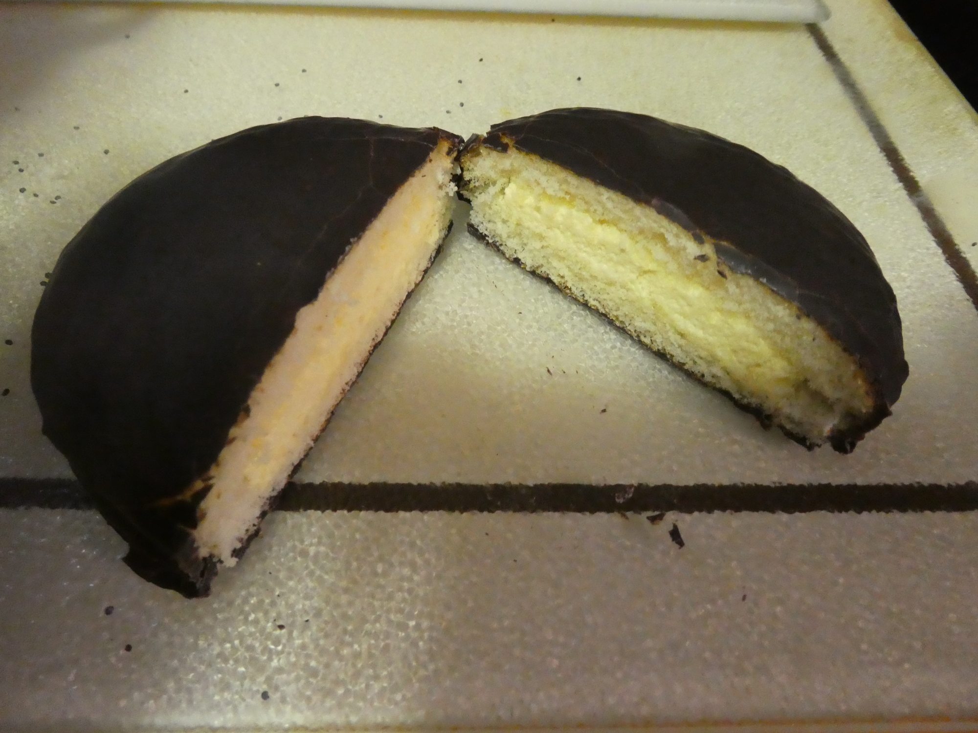 One final shout out, requested by my brother, comes also from the bakery realm. Reading the references to the Whippet cookies, he asked me to eat a May West for him. According to Wikipedia, "A May West is a round dessert cake with creme filling. It was created in Canada, and continues to be particularly popular in the province of Quebec. It is currently made by Vachon Inc., a division of Canada Bread. It was originally called a "Mae West", after the eponymous movie star, but the spelling was changed in the 1980s.