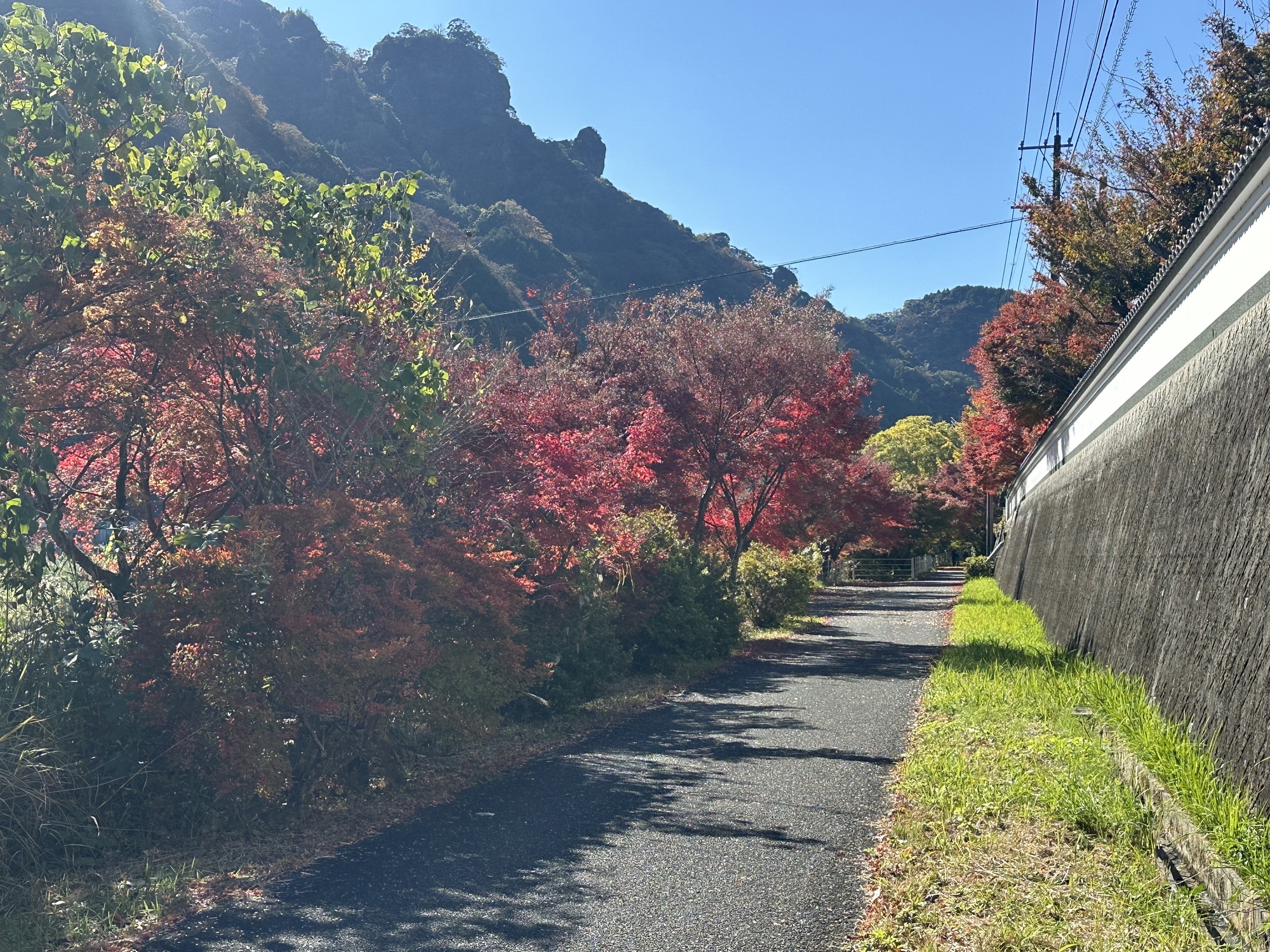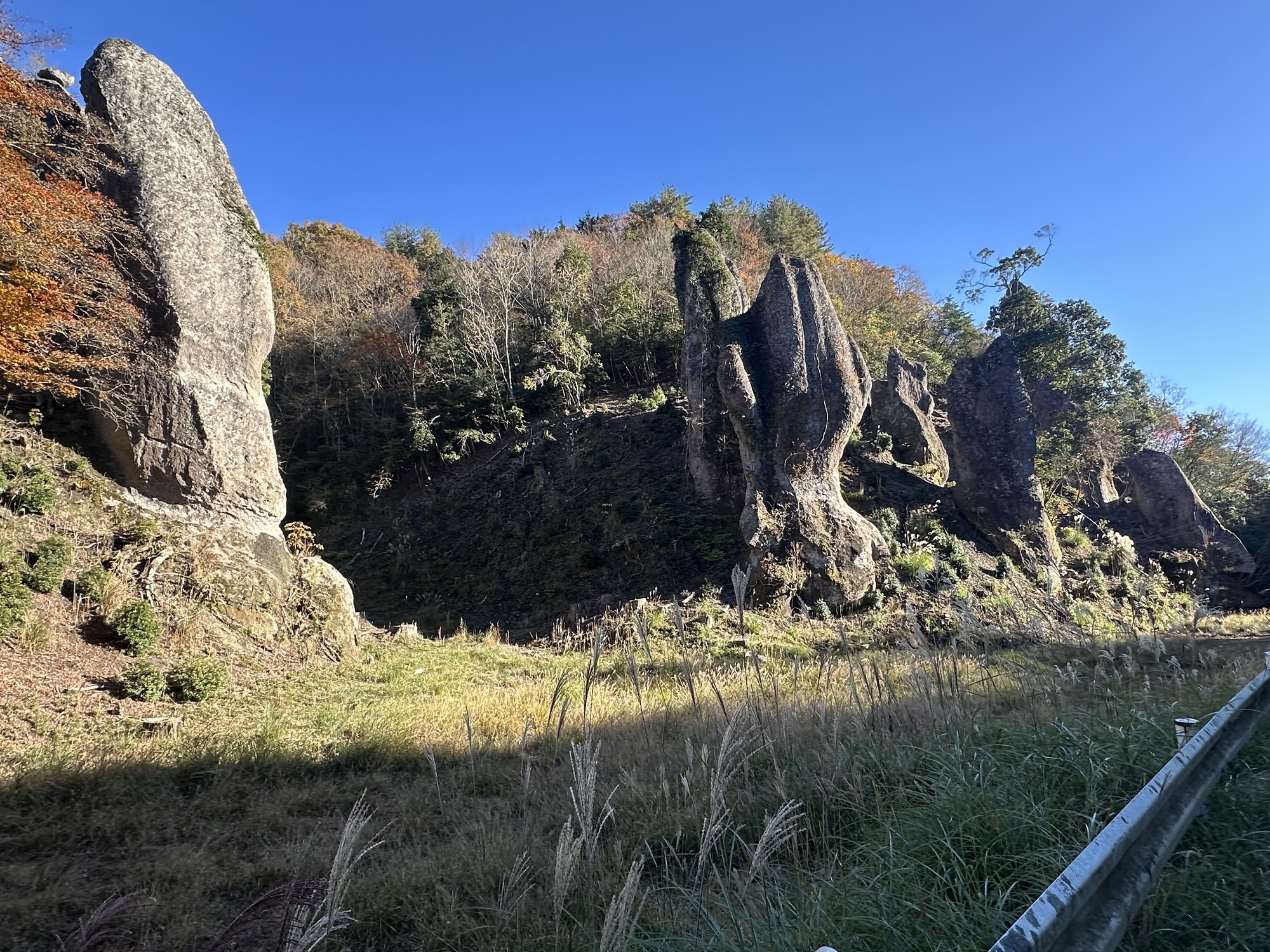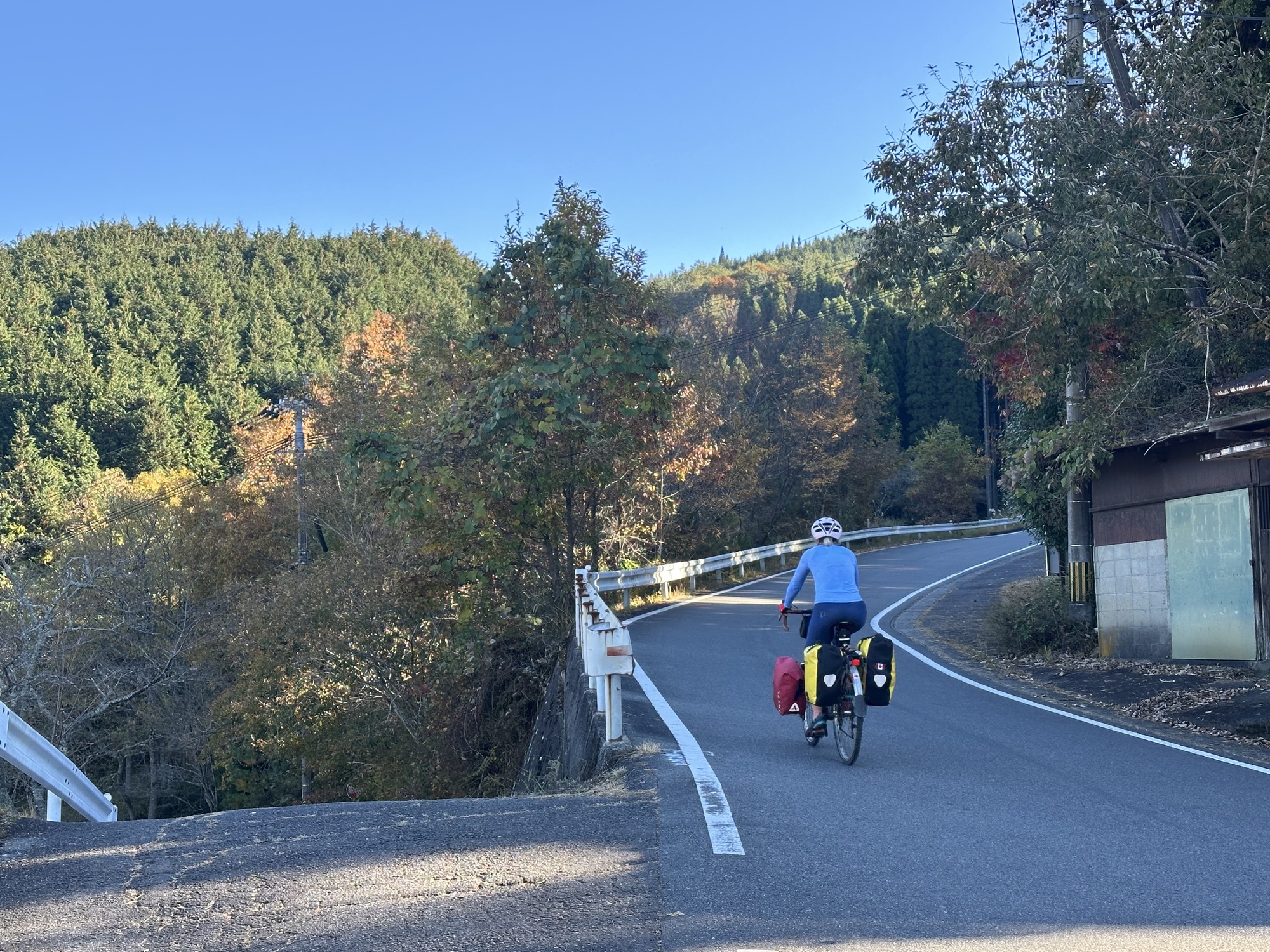 As all good things must, the bike path eventually did end. This left us back on the road with the bulk of the day’s climbing yet to do. It was a bit of a push — 500 m over 20 km then down into Kusu. The road wound its way up into more breccia formations, again awash in fall colours, so it was sweaty but rewarding.