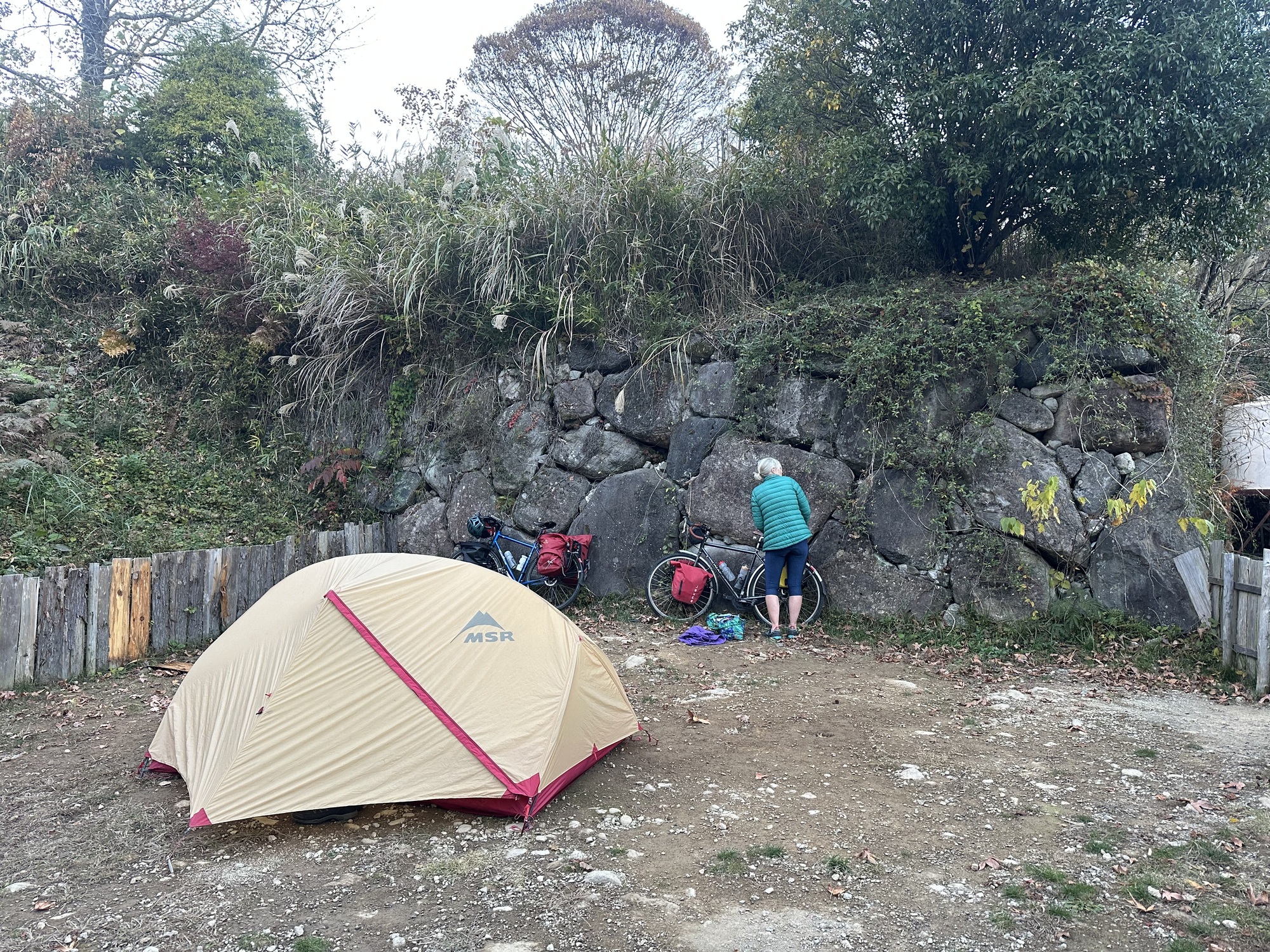 We thought this was an invite to all campers to get traffic into the bar to sell drinks, but when we showed up it was clear it was just us. The owner was a middle aged woman (our age exactly as it turned out, which is middle aged if you live to 114). She was hoping to practice English with us. She had studied English for years but found it impossible, and speaking with foreigners made her very nervous because she felt her English was so poor. We had bowls of oden (soup with fish cake and other stewed tidbits), accompanied by wine on the house. We had a fun evening discussing our lives — this was her father’s property, which she had developed into a campground, not what she wanted but… Not sure how much English was learnt, as almost the whole conversation was via Google Translate, but it was a good time. As hard as it was we had to cut off the free vino (I know, I can’t believe it either), as we had to get into the national park the next day, which was another big chunk of climbing.