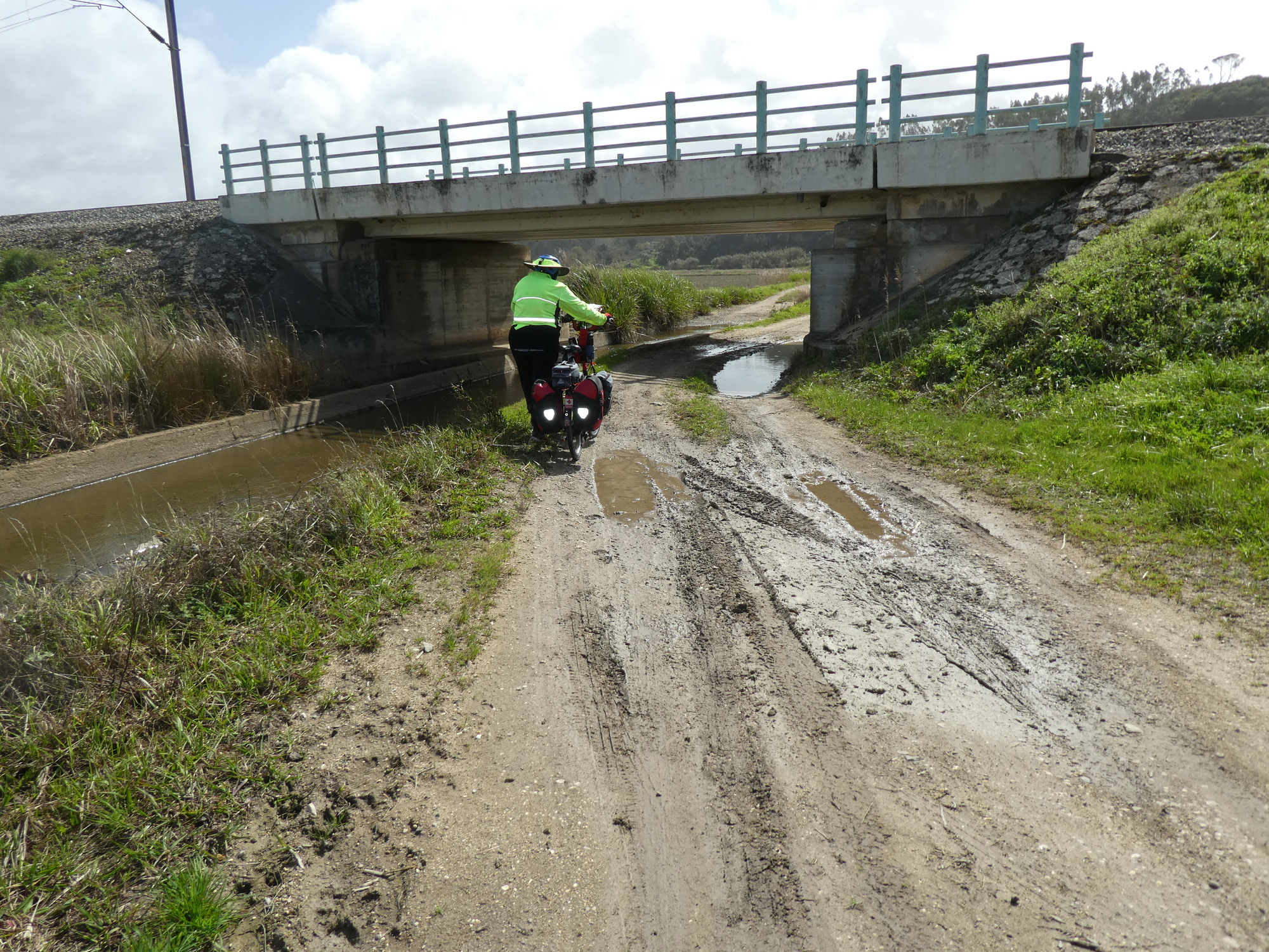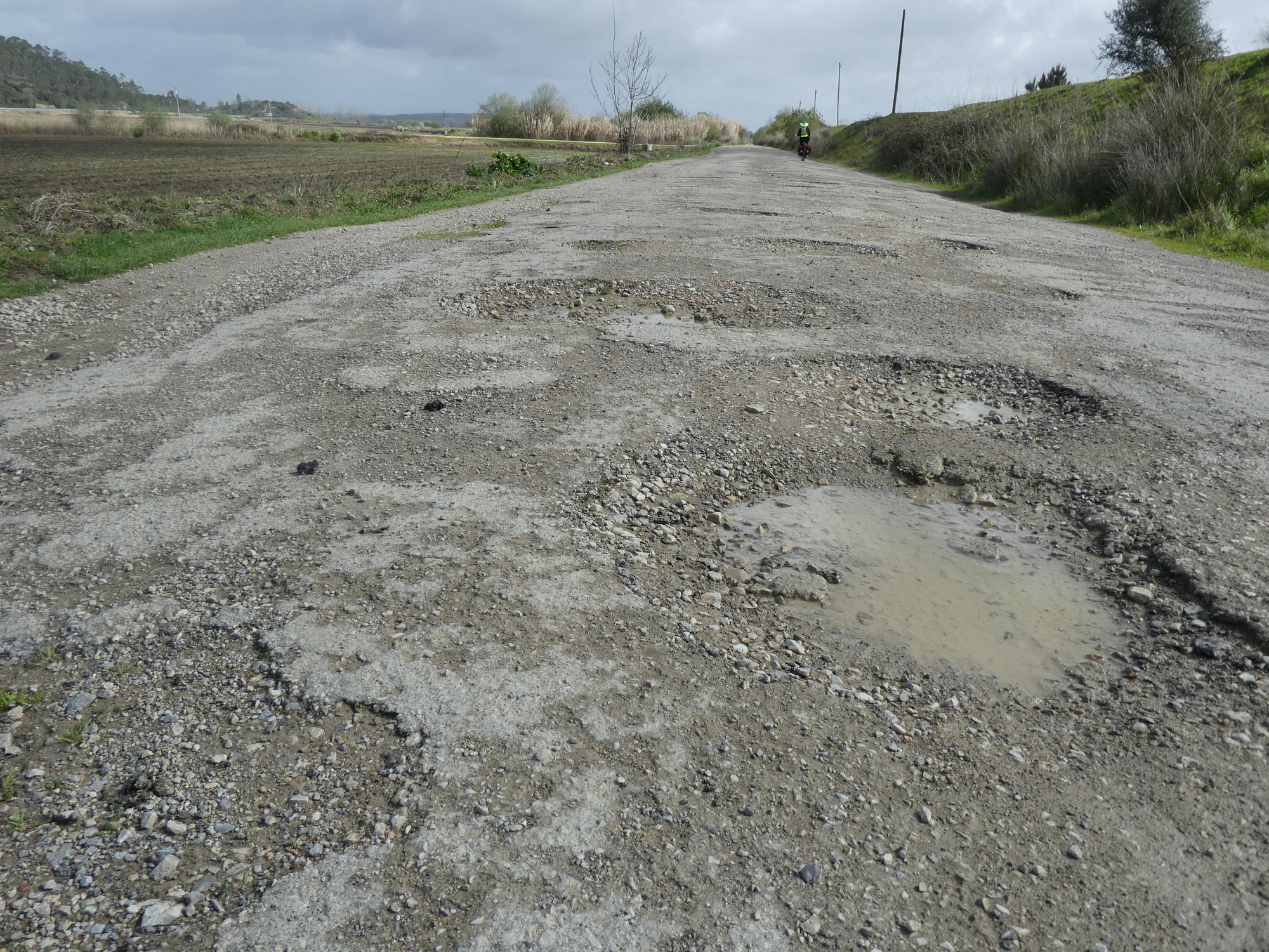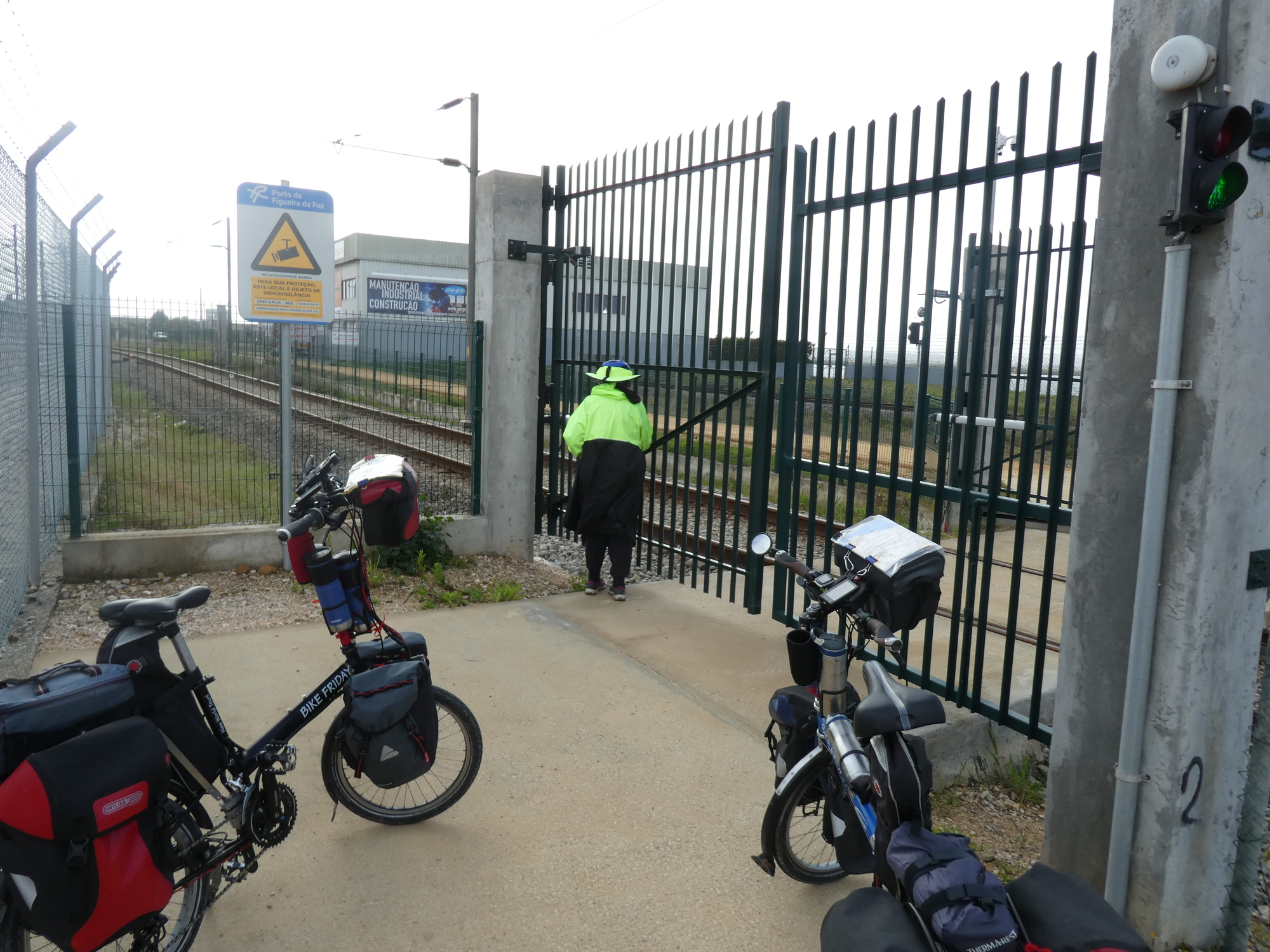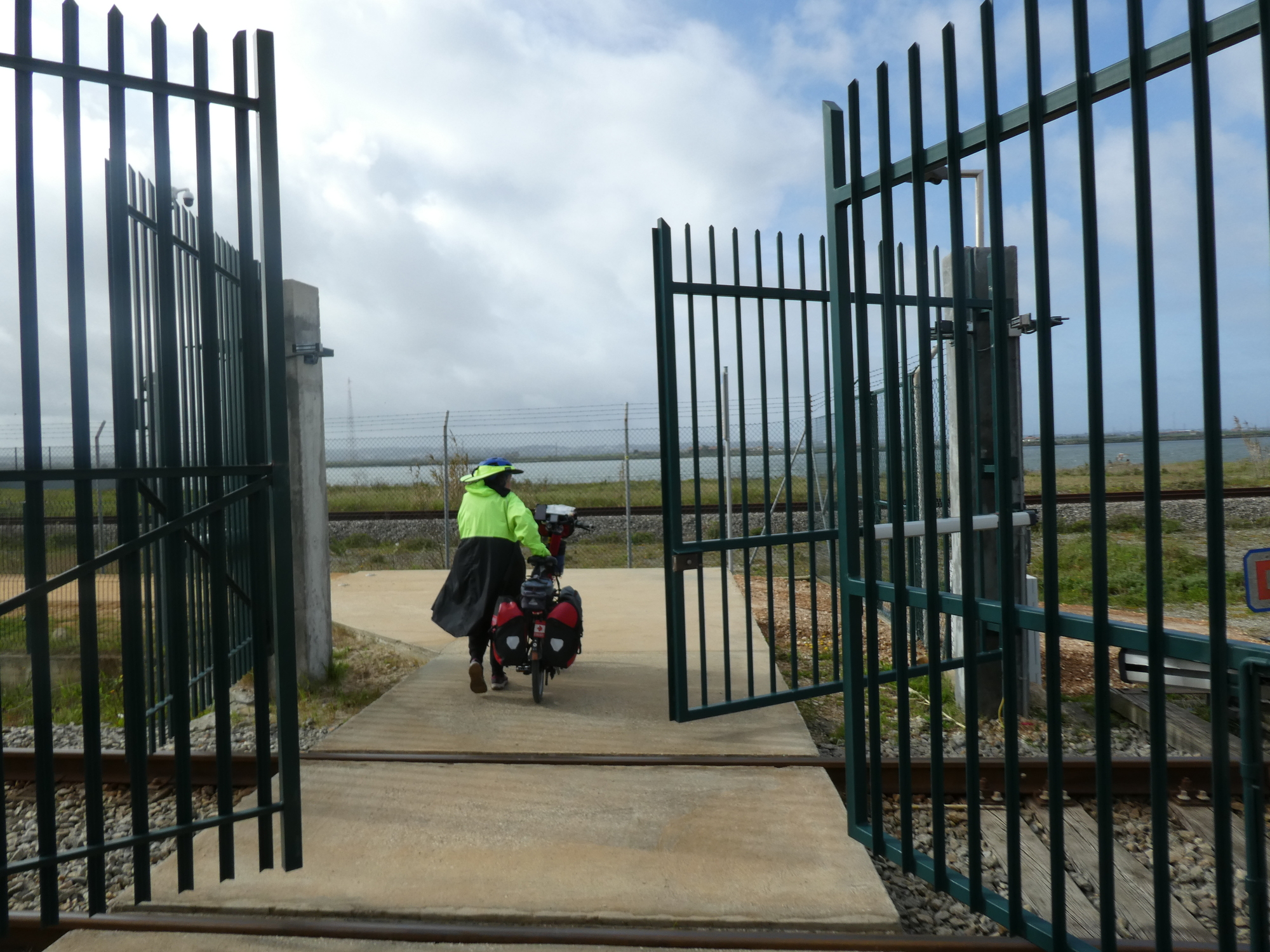 We set off again, out the east end of town, on the first crazy mission required by the track. The bridge over the Mondego River, right at town, is too big for bicycles, so we had to travel about 10 kms upriver to a usable bridge, and 10 kms back again! The first step in this was crossing a railway track, and here we found the way blocked by a serious gate. We looked up and down for some sort of button, and we scanned for a phone number to call. No luck. We tested the gate to see if it could be forced - nope. We were just about to give up (and go home?) when a bell started to ring and the gate mysteriously opened for us. We figure some operator in Lisbon or wherever looked up from playing Solitaire on his phone and saw us jumping up and down on his camera monitor. This impediment was on the official EV1, of course.