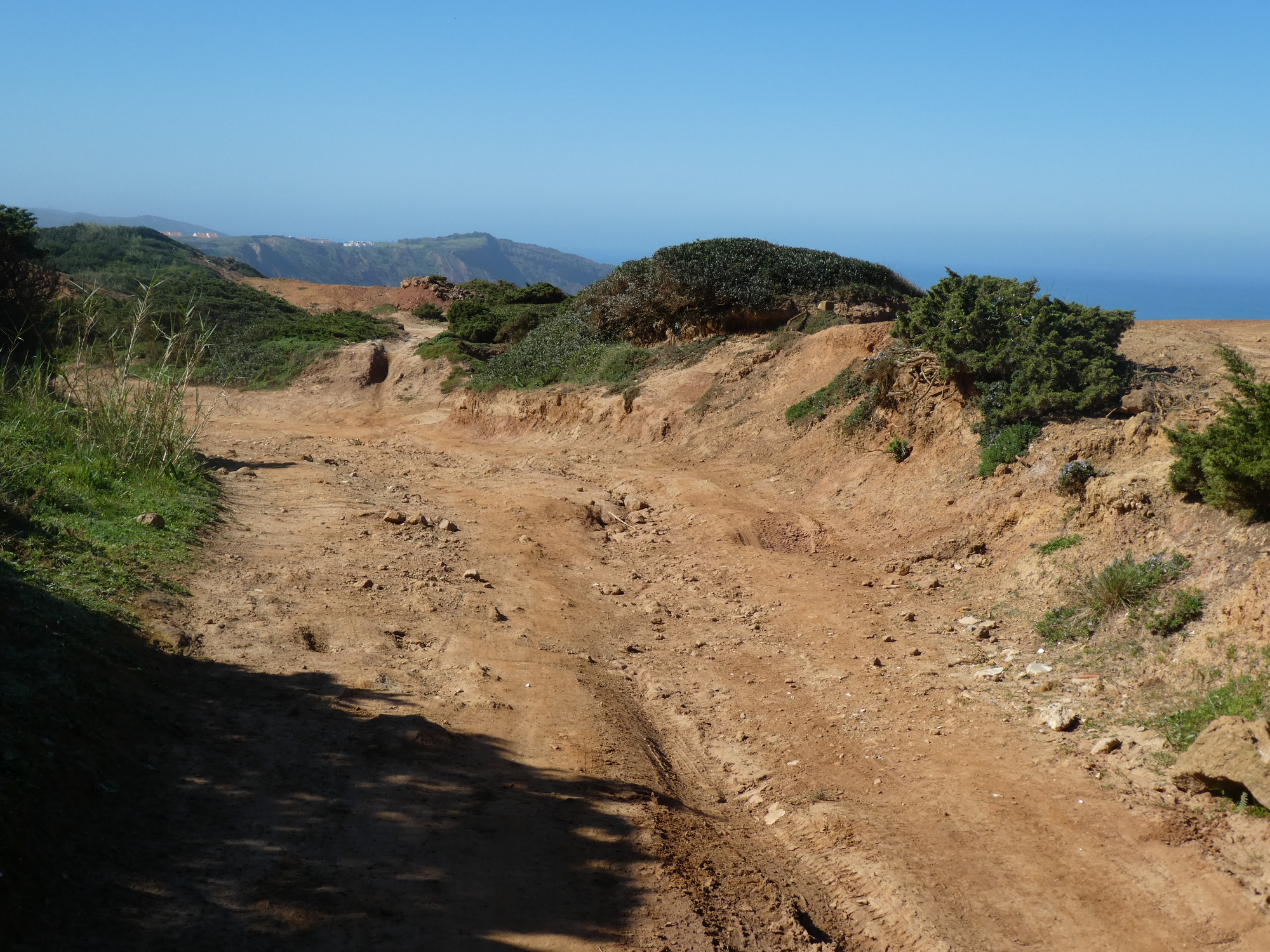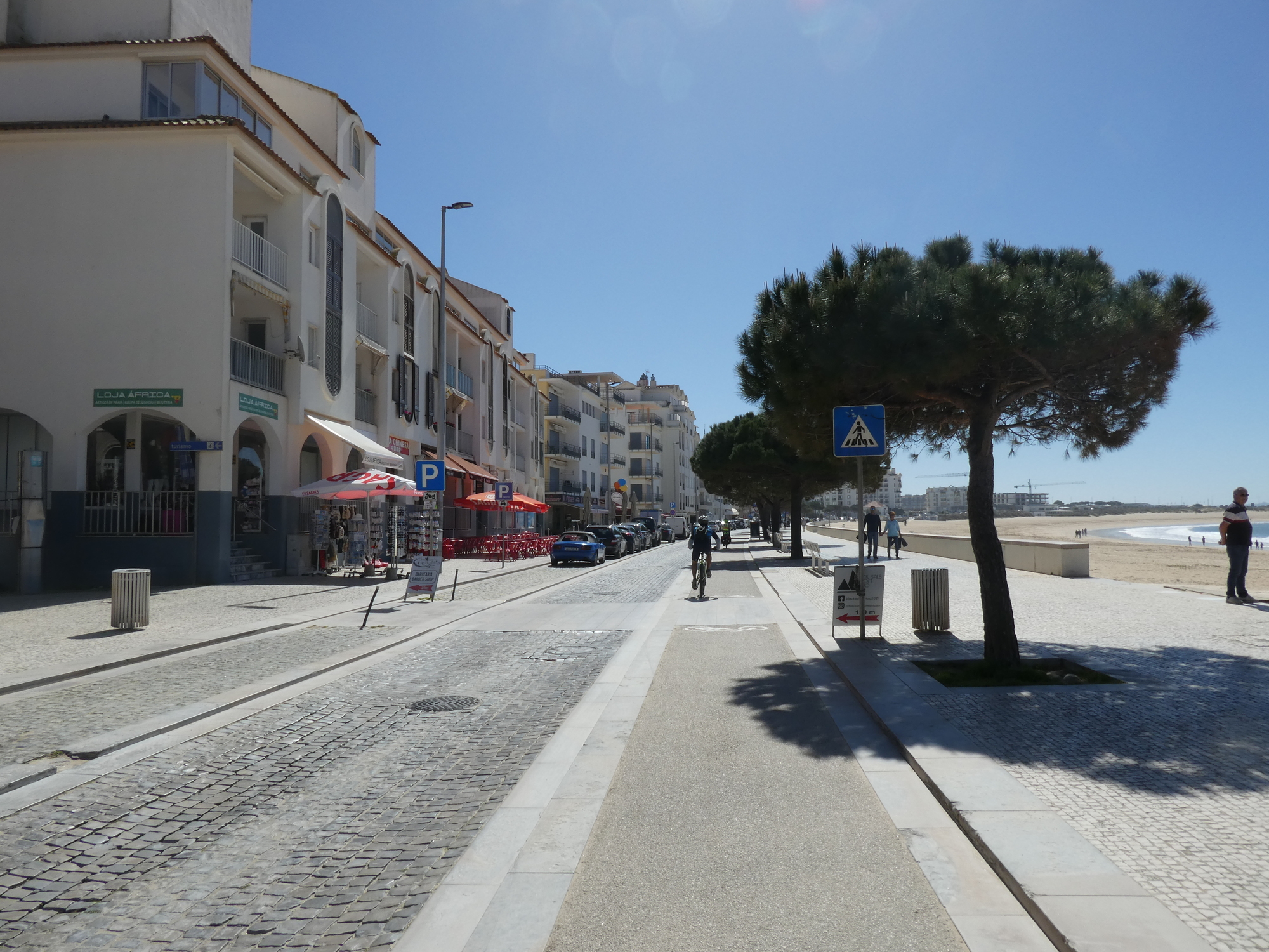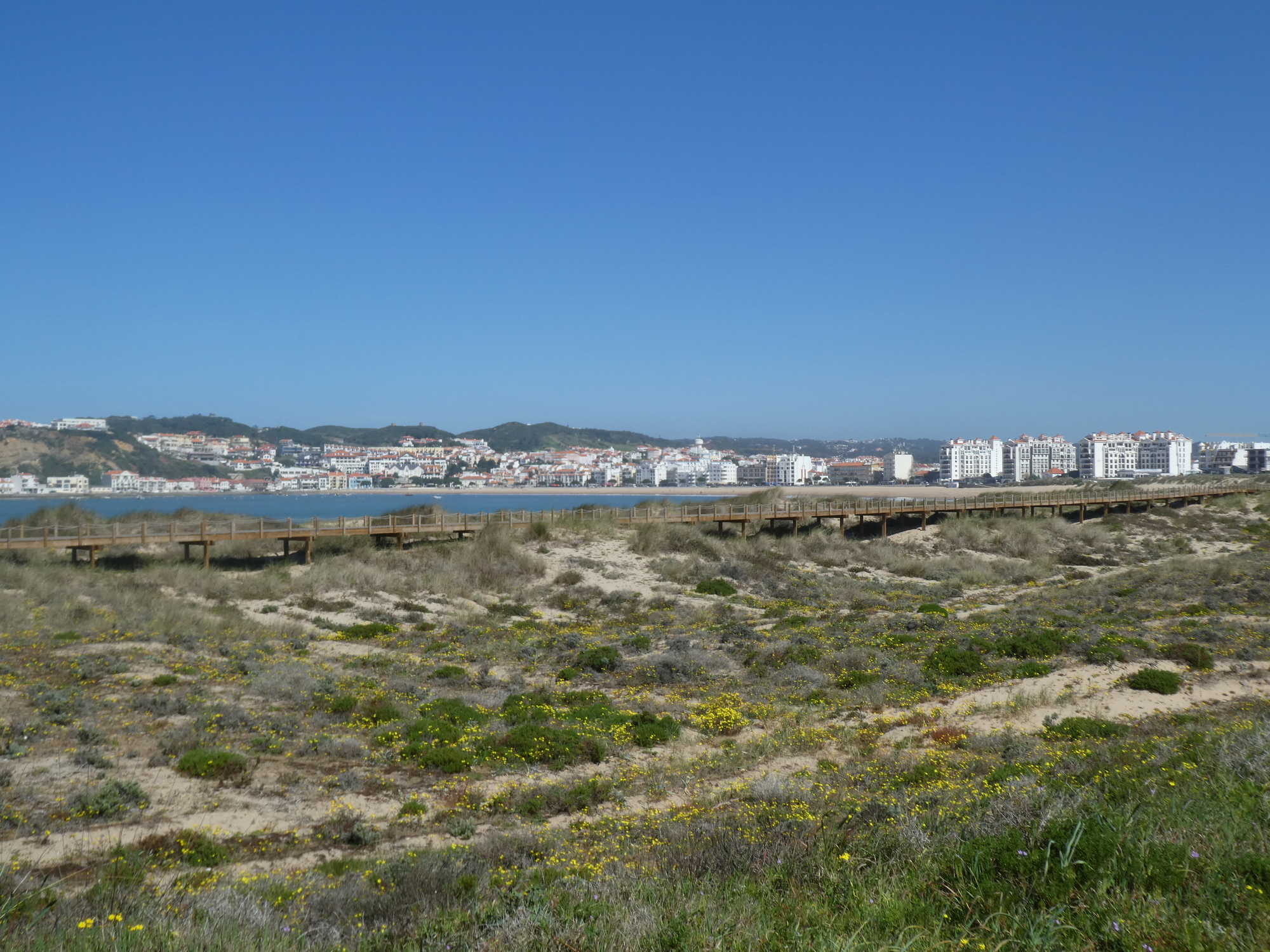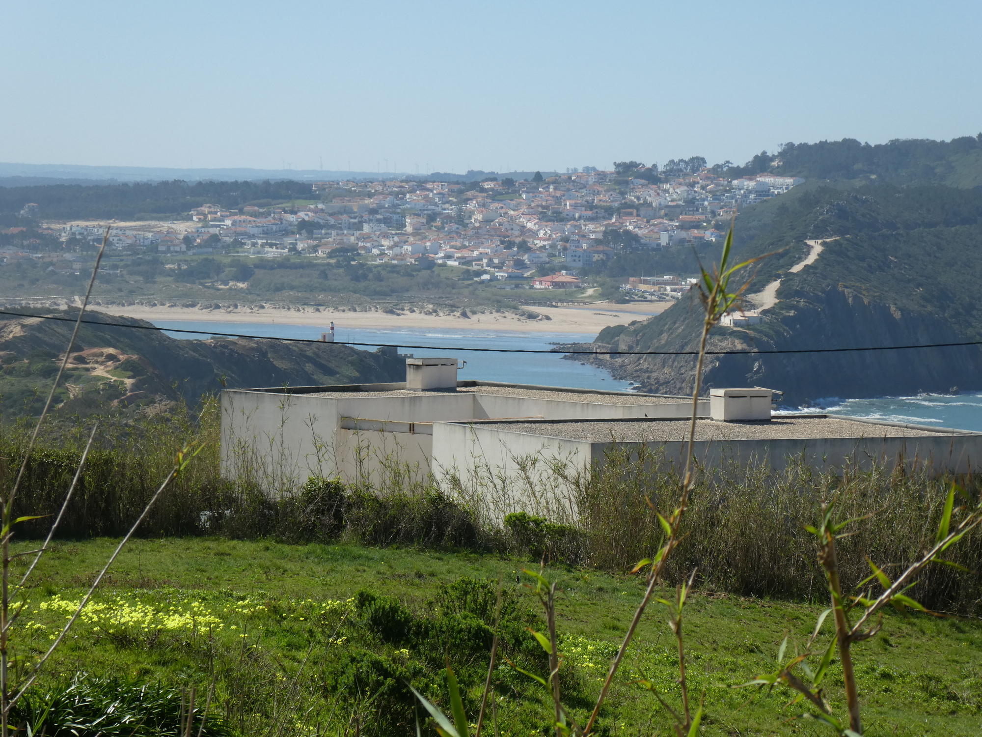 One good thing about hills is that they have to end, else they would be plateaus, or we would never have valleys, or something. So reasonably quickly we were looking down at yet another Nazaré style cove and wide beach, lined with restaurants and shops. I take this to have been Sao Martinho do Porto.