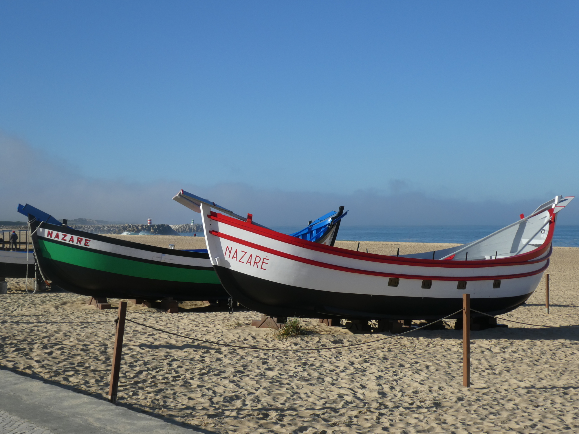 After a nice breakfast in the large and comfortable restaurant of our Hotel Oceano, we cruised along the remainder of the amazing Nazaré beach. We passed a display of restored fishing boats, the kind that have come to symbolize Portugal. These were built around 1900 and restored around 2000.