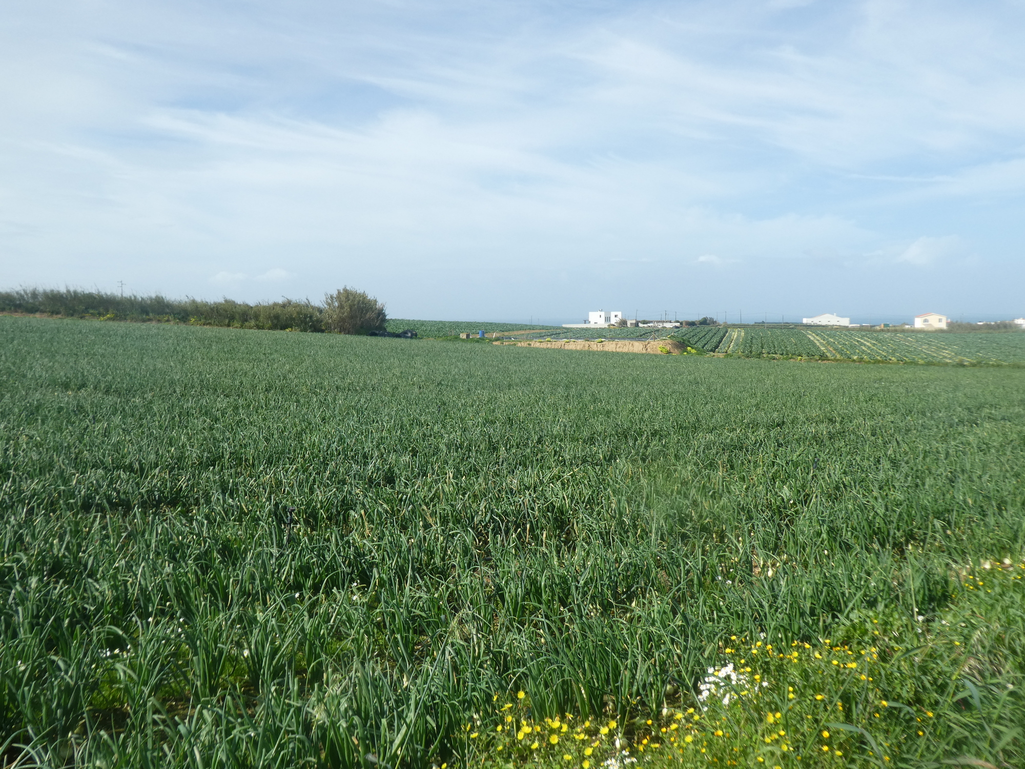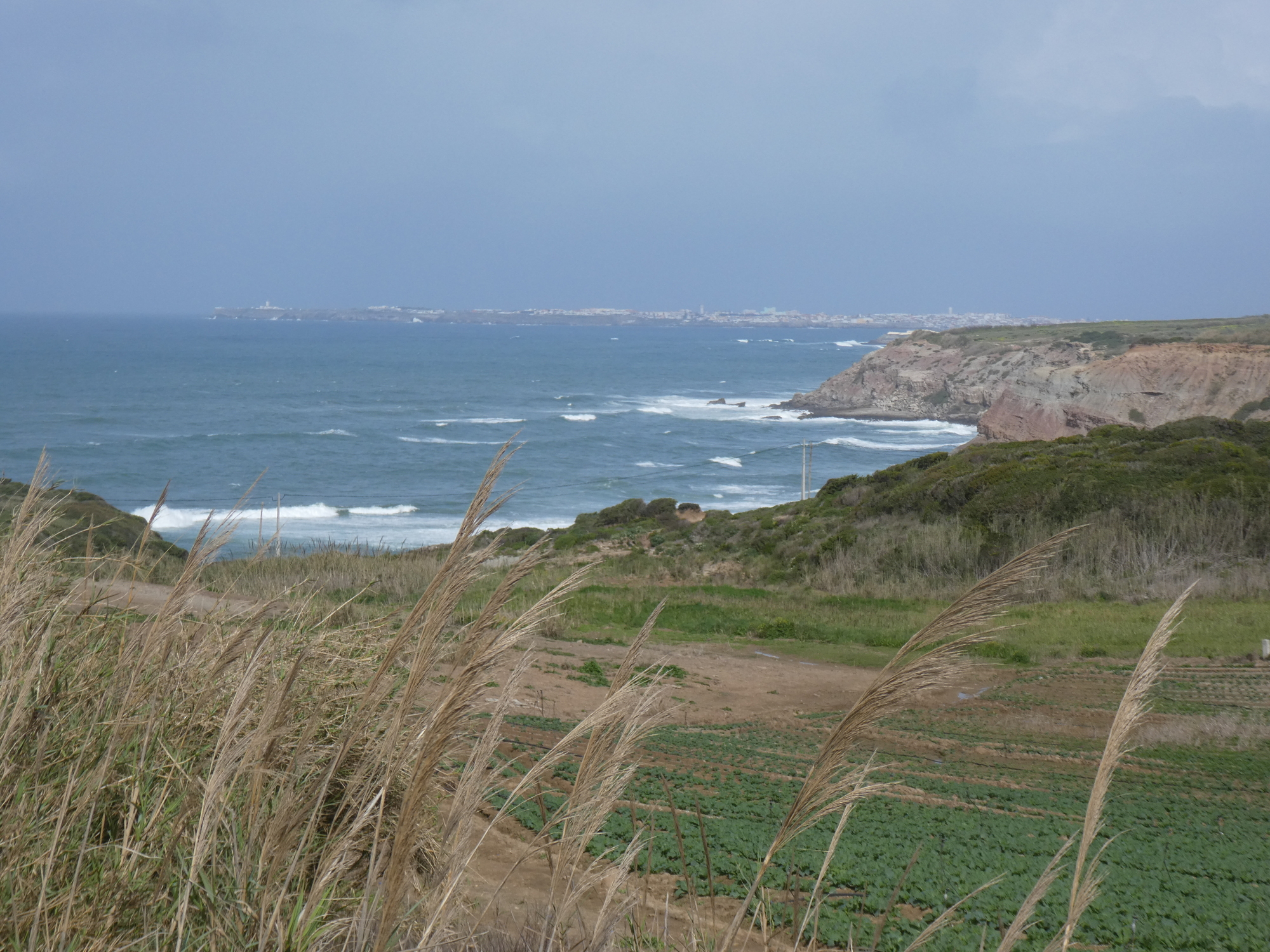 In the earlier days of this tour we had gorgeous Porto, followed by terrific and not so hilly bike paths. This came to an end at Nazare, when things switched to quiet, somewhat hilly roads, with few bike paths. Now, leaving Peniche, is when we have first encountered fairly heavy traffic in hard to negotiate roundabouts, plus many really steep hills. Admittedly there is still the surf, and the fields of vegetables. When Brent Irvine did more or less the ride we did today, he was blown away by the thrill of the upping and downing, the surf, and the general surroundings. But we would have to say we were not so amused. I can say that especially about sections I did three times, helping Dodie to get up the ups.