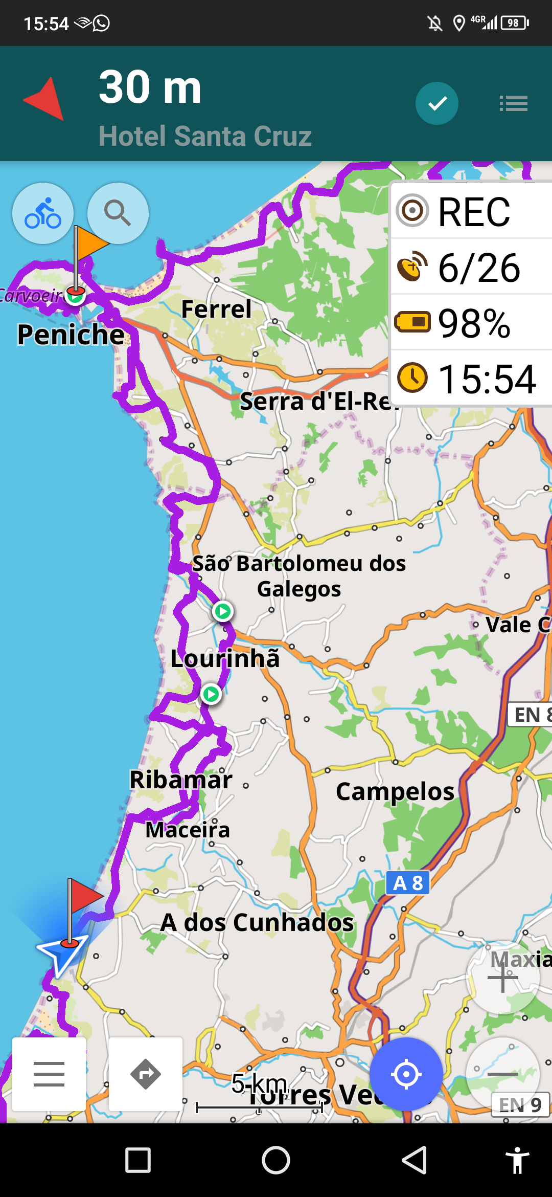 When we met with the Classens back home and went over their rides south of Lisbon, we learned that they had circumvented EV 1 on occasion to avoid sandy or otherwise bad sections. So we have their tracks with us, to help avoid the same sections. Here, north of Lisbon we do have Brent Irvine's observations and tracks, but we are also forging our own way. Basically, EV1 wants to go down to the surf whenever possible and to go up and down headlands. But that can lose its charm, even for Brent, who enjoys the hills way more than us. (OK, we HATE hills.). Today we improvised, and jumped on and off EV1 throughout. For tomorrow, we've had it with climbing, and so have plotted our own way, using cycle.travel. Our revised route does follow some Brent, and some EV 1, but we are also using cycle.travel's paved/unpaved road option. It will be a big day for us, and our destination is now Sintra. From there we are thinking to find a train into Lisbon, to avoid any unnecessary traffic.