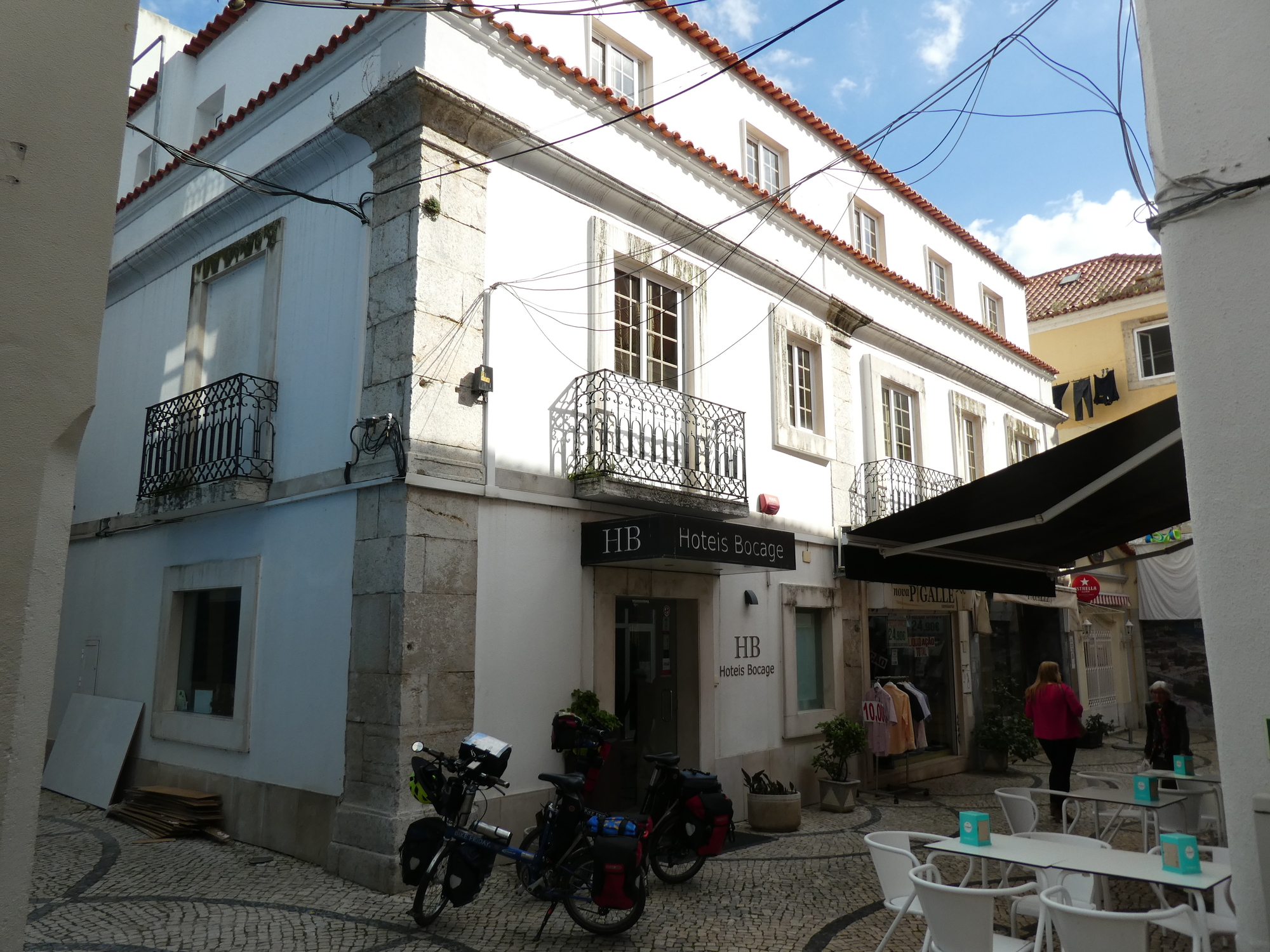 Our hotel was set in one of those squares -open streets off the main street. They set us up acceptably, with the bikes in a second floor patio, reached by elevator. We got to hear the life story of the desk lady. She had been dragged from here at age 17 by her parents, and taken to live near Boston. She liked the States, noting that the Portuguese lack entrepreneurial spirit, do lousy customer service and are generally lazy. The lady's parents ended up not liking the US and returned to Setubal. Now with her father passed away, the lady had come from the States to care for her mother here. The lady, now about 50, dislikes the place but is stuck with the mother. How did we learn all this? We asked for advice about the ferry we need to take tomorrow. "Don't ask me, I'm basically only an immigrant here", was the reply. Well, the lady does seem to be getting into the local swing of the poor customer service ethic!