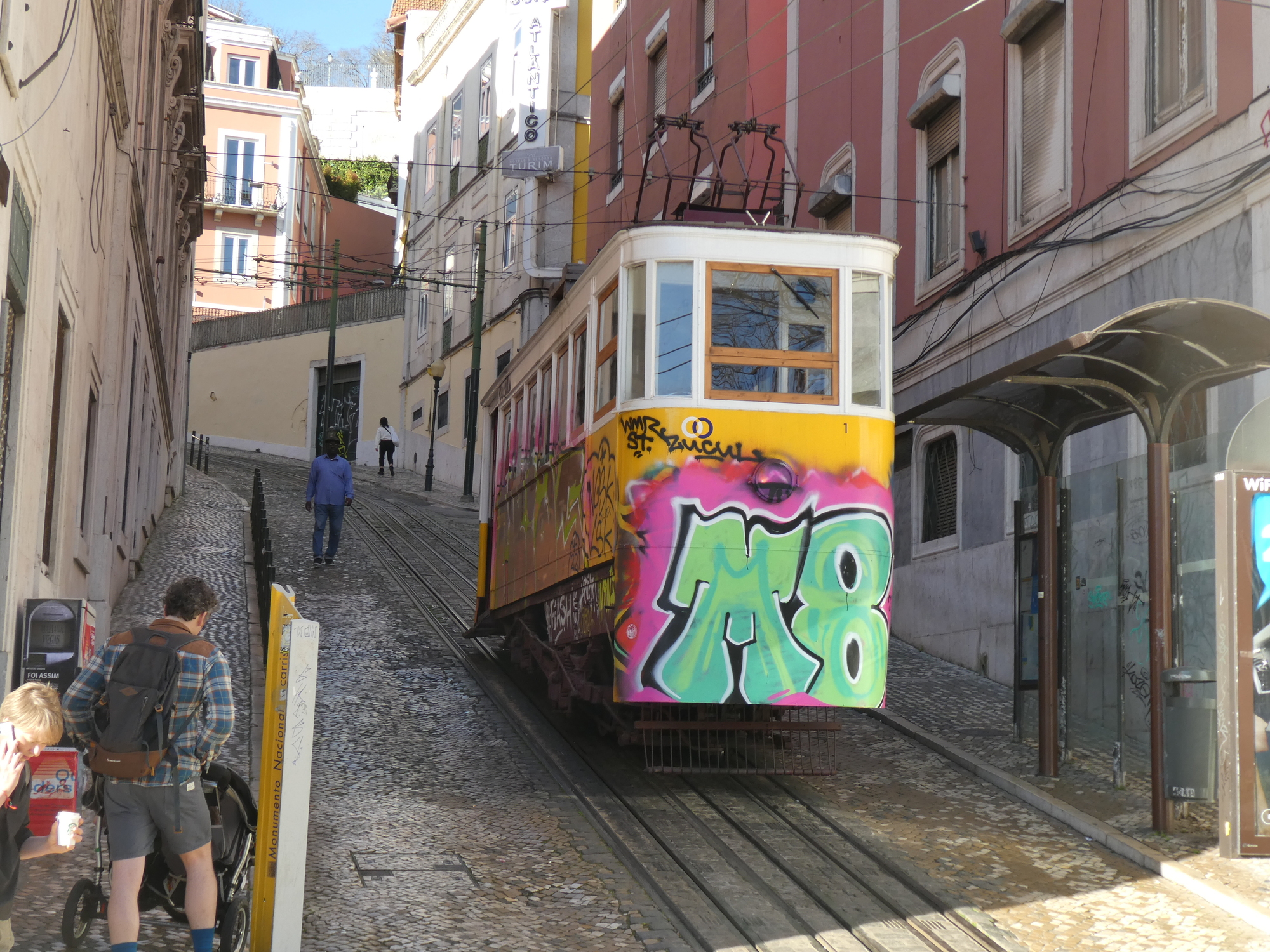 As we got a little deeper into town, we passed some of the sights we had seen yesterday, such as the strange elevator tower. We also spotted one of the uphill travelling trams. We have read in websites and seen on postcards "Tram 28", but we don' know if this was it, or if (more likely) there are lots of trams and this was only one.