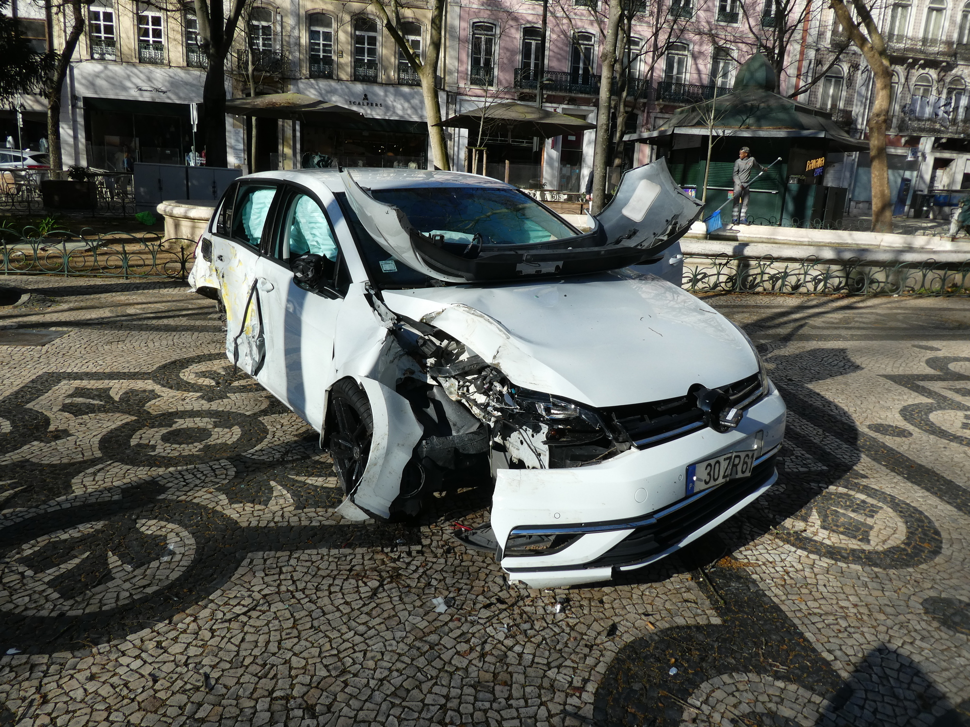 The sidewalk, however, was soon "impacted" by a car that had very recently come off the road and smashed itself on a lamp standard. People were still gathering pieces of the car from around the sidewalk, though the former occupants were now gone.
