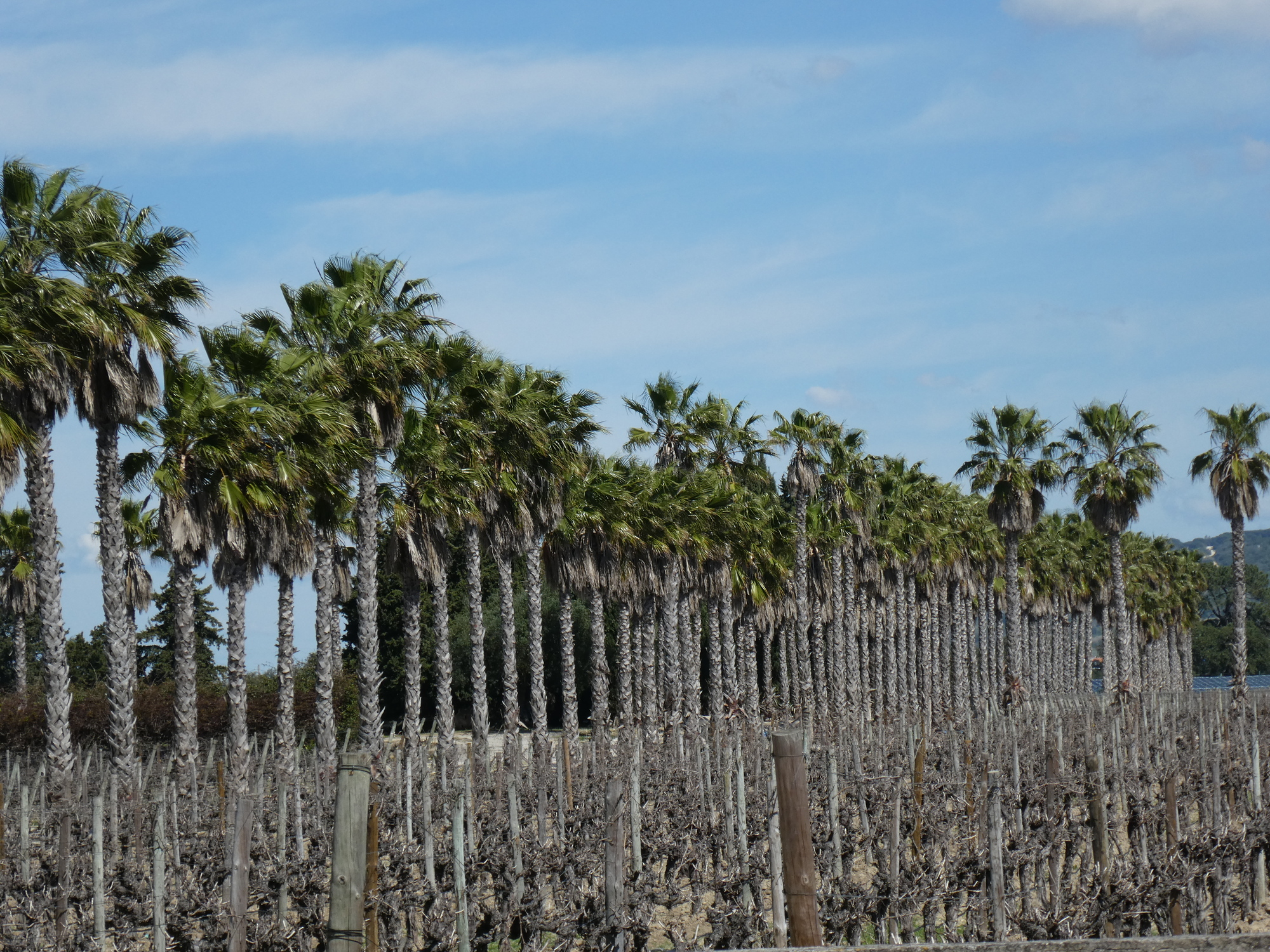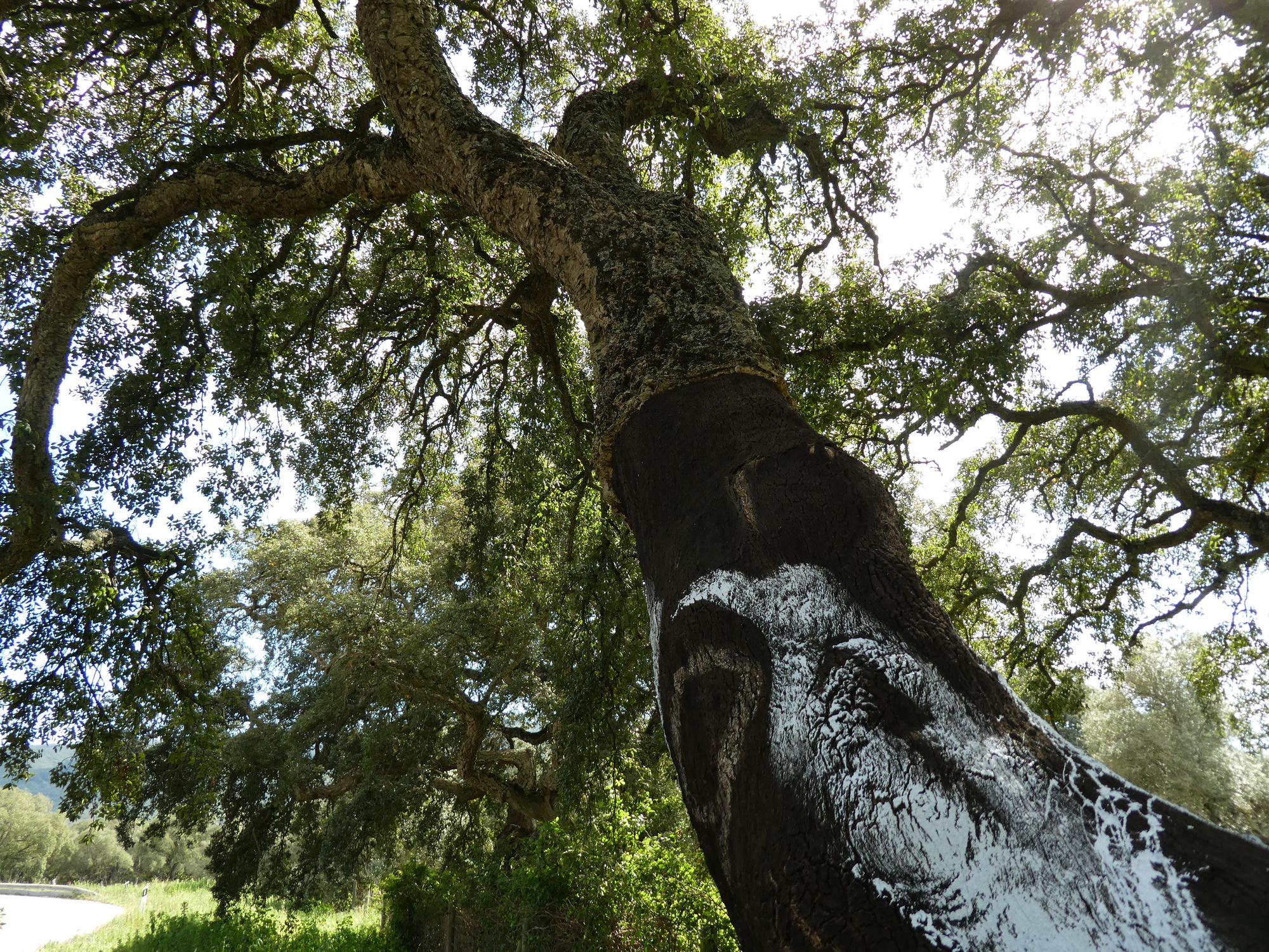 We ran into some plantings of interest as well. One was a large wine producer, with vineyards surrounded by palm trees, a sort of unusual combination. The other was orchards of cork trees, the bark removed and the trees painted white and numbered.