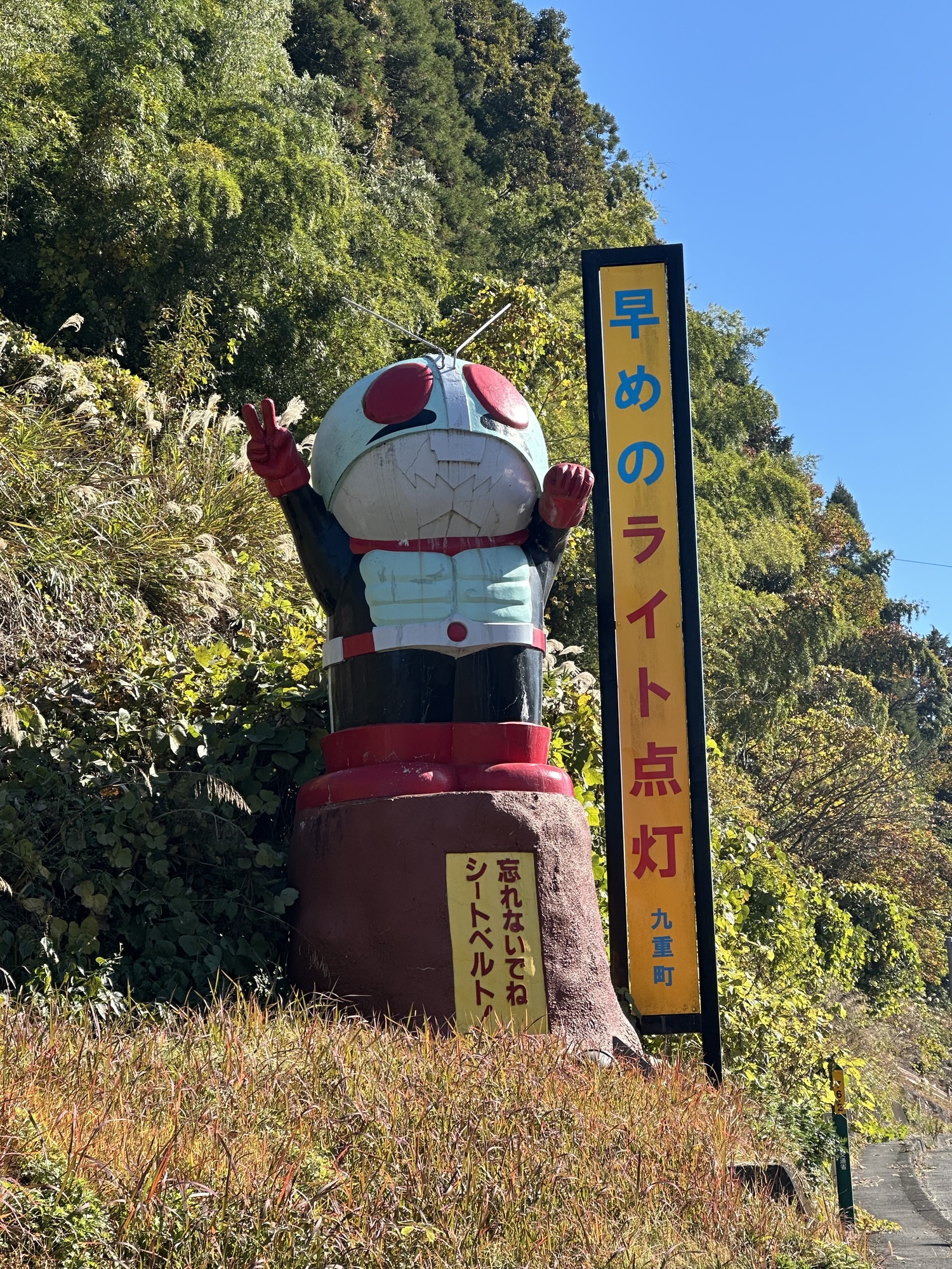 We chugged along pretty contentedly for most of the day, had a mid-day break along the road for mandarins and onigiri and watched a big group of motorcyclists take photographs of themselves and their bikes. Then, while labouring up a slope in the middle of the afternoon, something on my bike went SNAP.