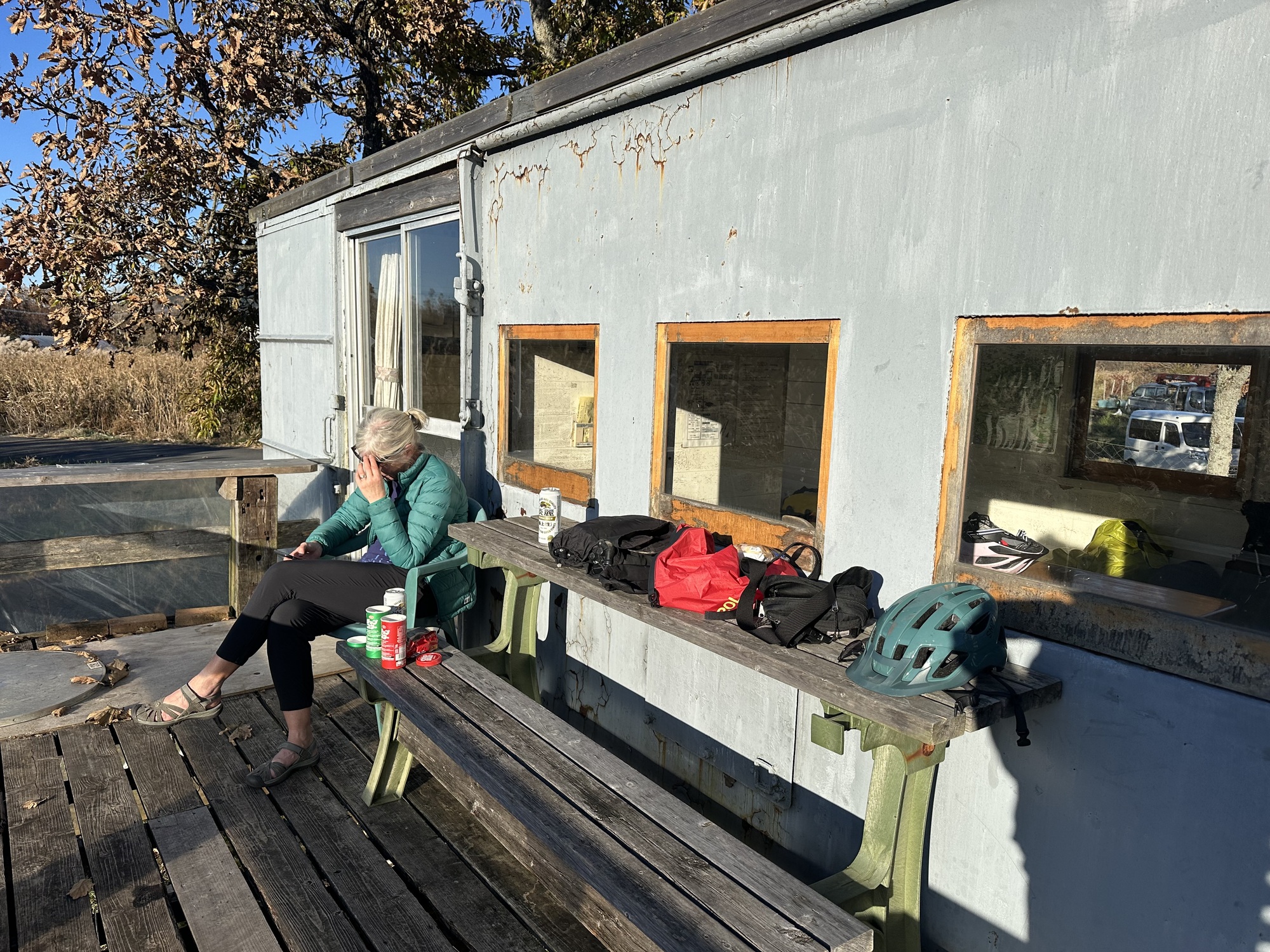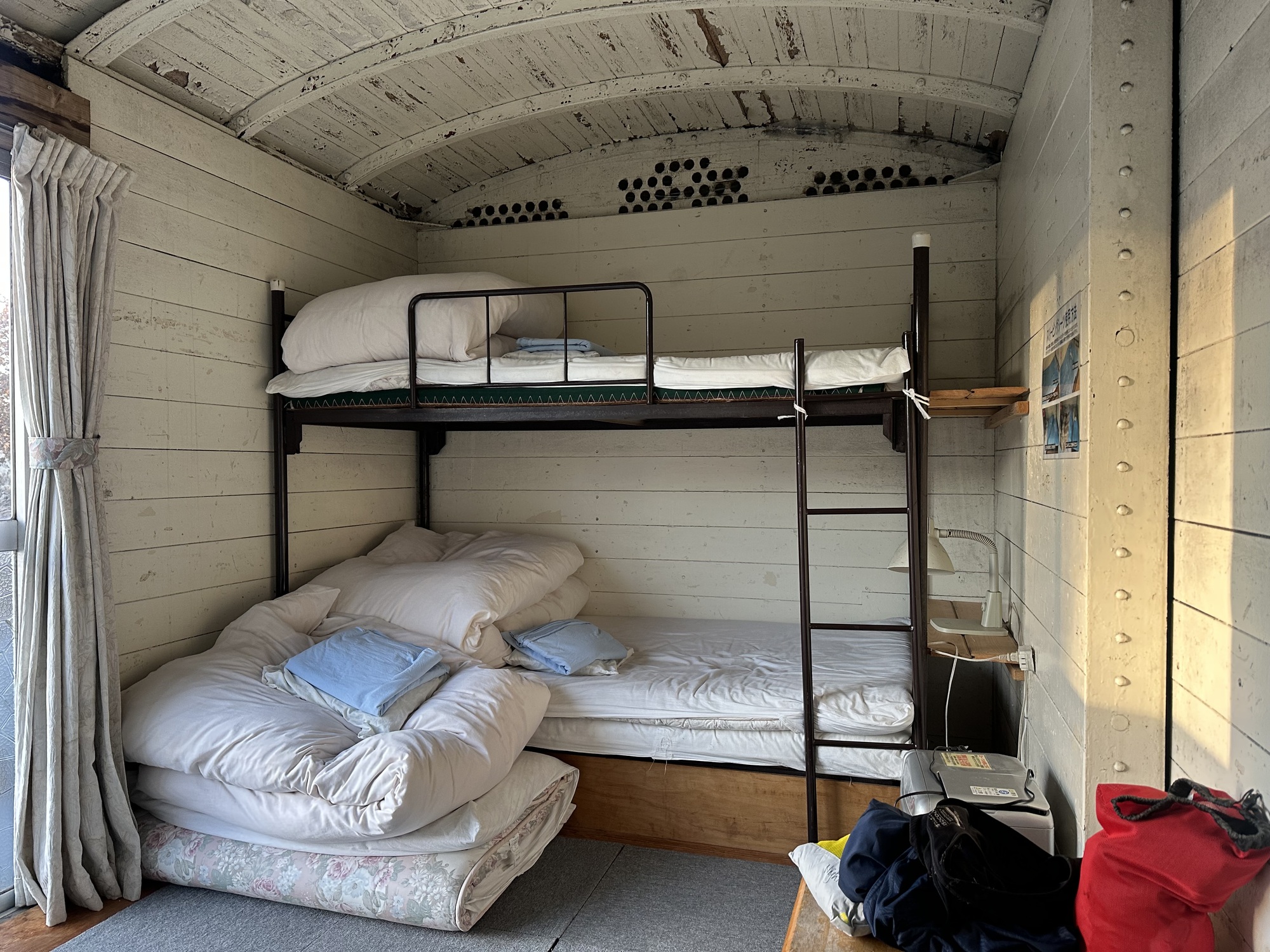 Given the frosty conditions we’d encountered in the morning, I had taken the precaution of booking what seemed to be the last available affordable accommodation in Kuju, the oddly named Kuju Aid Station. It turned out to be a collection of old railway carriages that had been renovated into accomodation — a labour of love by the owners, now a fairly elderly couple, who have been running the place for almost 40 years. Let’s just say it’s not fancy.