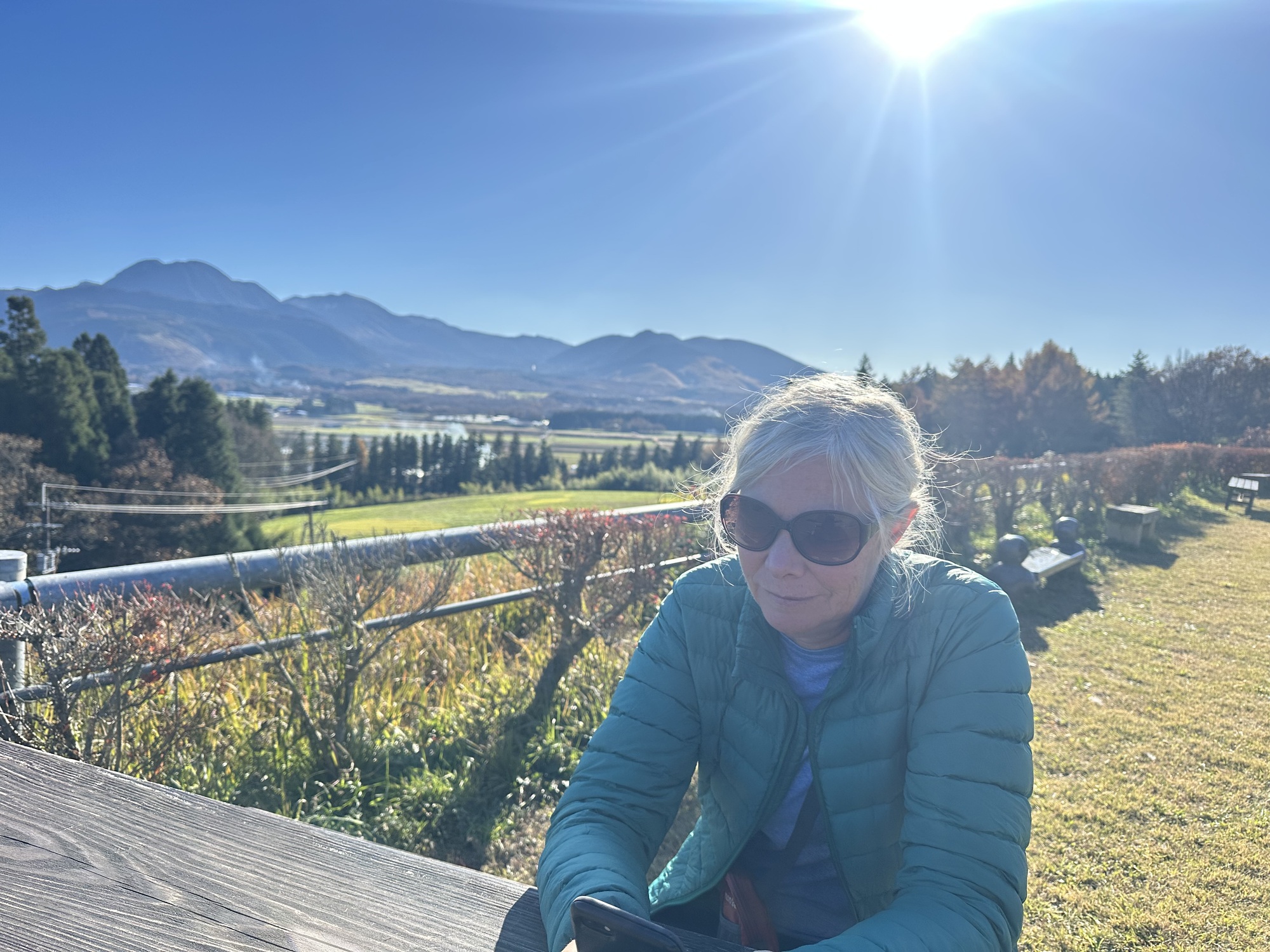 While we were inside chatting, Tom and her husband were out Mcgyvering my bike. They wrapped the broken gear cable around a post to get some tension back, setting it on the lowest gear, and taped the stray cables together. Hill climbing would be easier, but I’d be spinning my wheels on the flats, though I could shift between the rings up front. The profile for the day was a long climb at first, but then a long descent, and the distance was not huge. Provided the cable held on the post, we were suddenly hopeful we would make it to Aso town at least. We were certainly grateful to our hosts for their help!