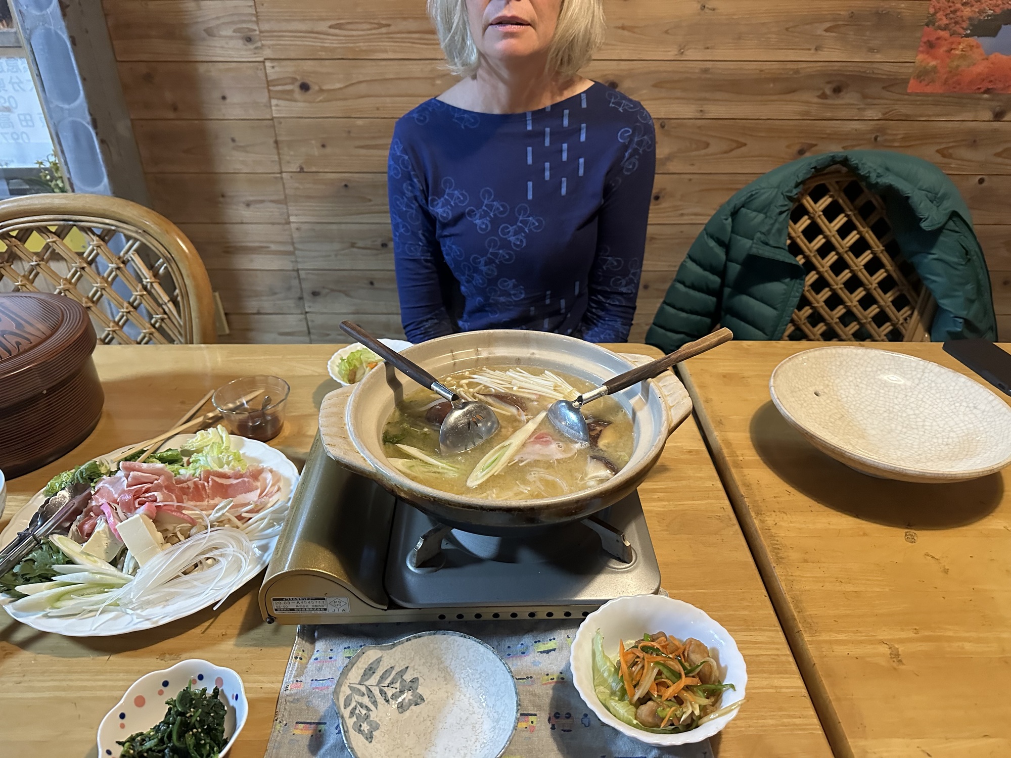But our railway carriage came with a westward facing deck, so we were sitting out enjoying the last of the sunshine when the lady in charge came over and asked if we wanted to go to an onsen. Well, sure! Next thing we knew we were sitting in the backseat of a little van driven by her husband, being chauffeured to an onsen. And when we got back, dinner was served in the main building.