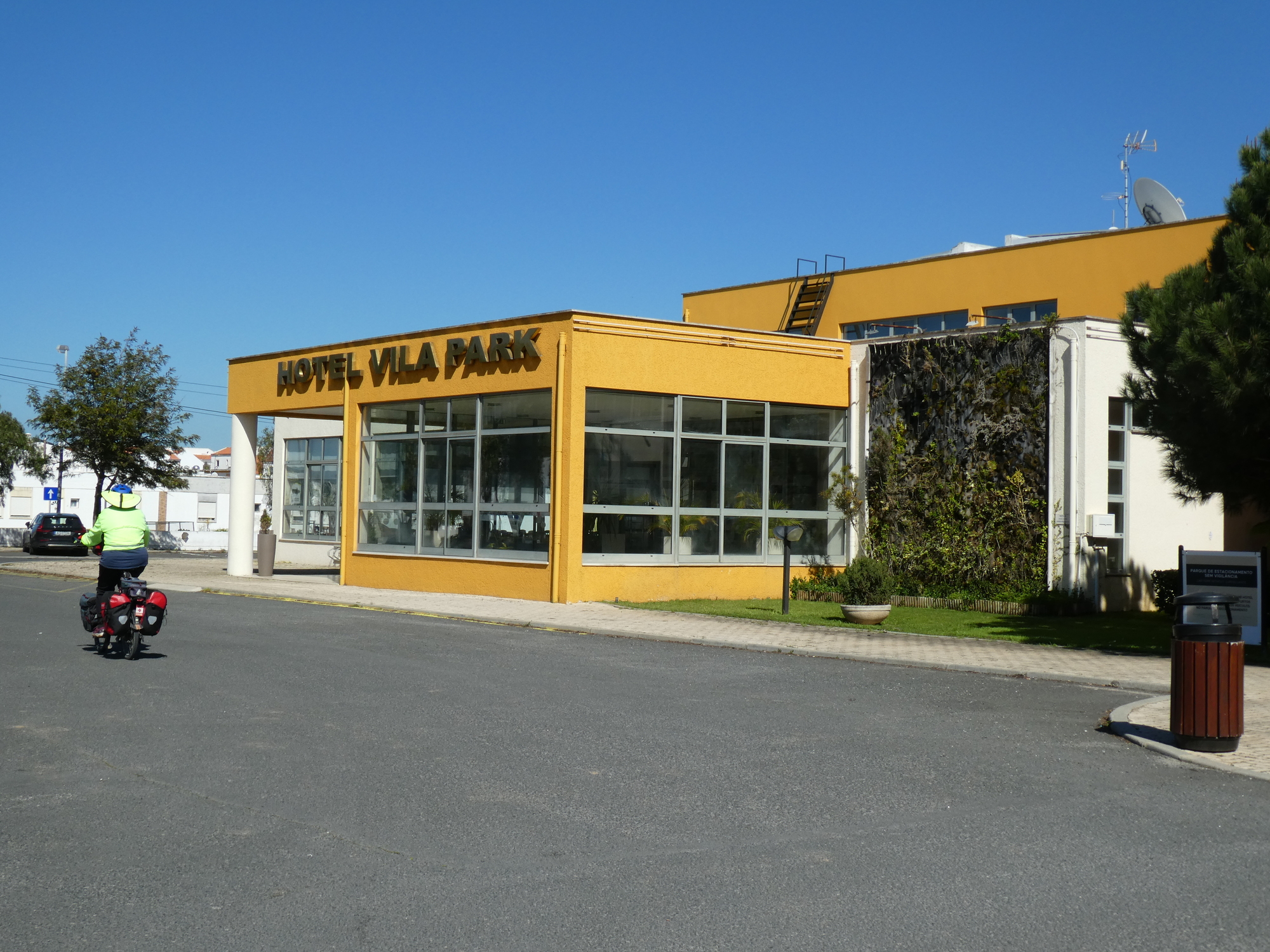 The town of Vilanova de Santo André might mainly have as it's Claim to fame an Intermarché supermarket. The buildings of the town certainly look very normal, if disorganized. Our hotel was slightly more costly than most, but Dodie was targeting someplace close, since she was not feeling great. The hotel, called the Vila Park, looks a bit like a high school building. It's deceptive though. The low rise, sprawling construction means that our room is on the ground floor. There was also plenty of room for the bikes in a storage room, and the hotel has a restaurant that it seems we are able to afford. Plus, the internet works! so life is good.