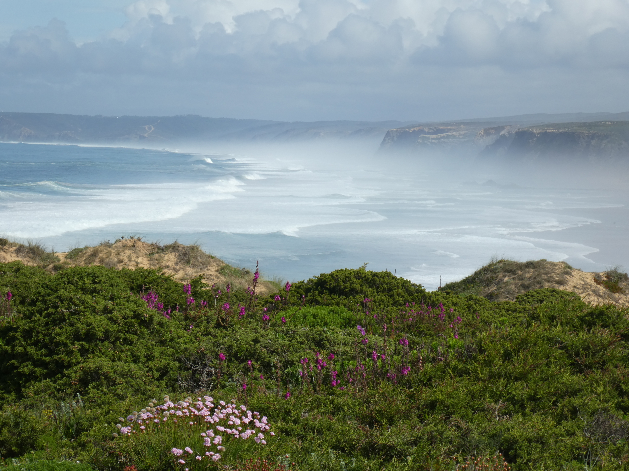 Our ride today qualifies as having offered the most varied and exciting topography of any in Portugal so far, and some roadside wild gardens that were just out of this world. It began as we found ourselves in a wild feeling mountainous region that gave way to dunes and then crashing surf, ending with flat "steppes" of grass meadows.