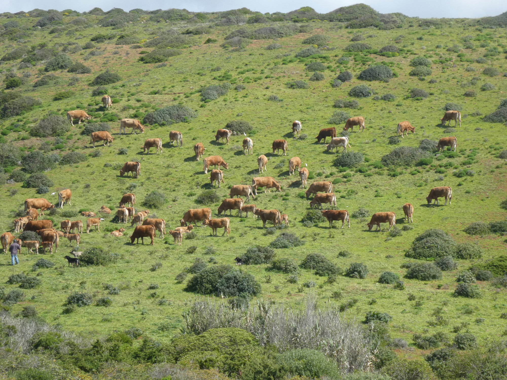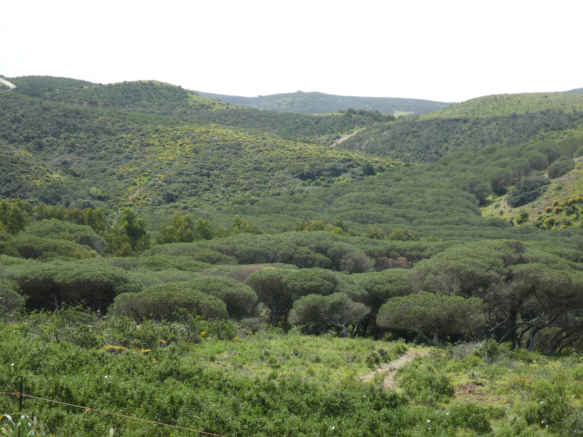 One hillside was adorned with attractive cattle, while another had yellow flowers (not lupins this time). Another adornment was hills and valleys filled with a variety of pine that we started to call "mushroom pine", for their unique shape.