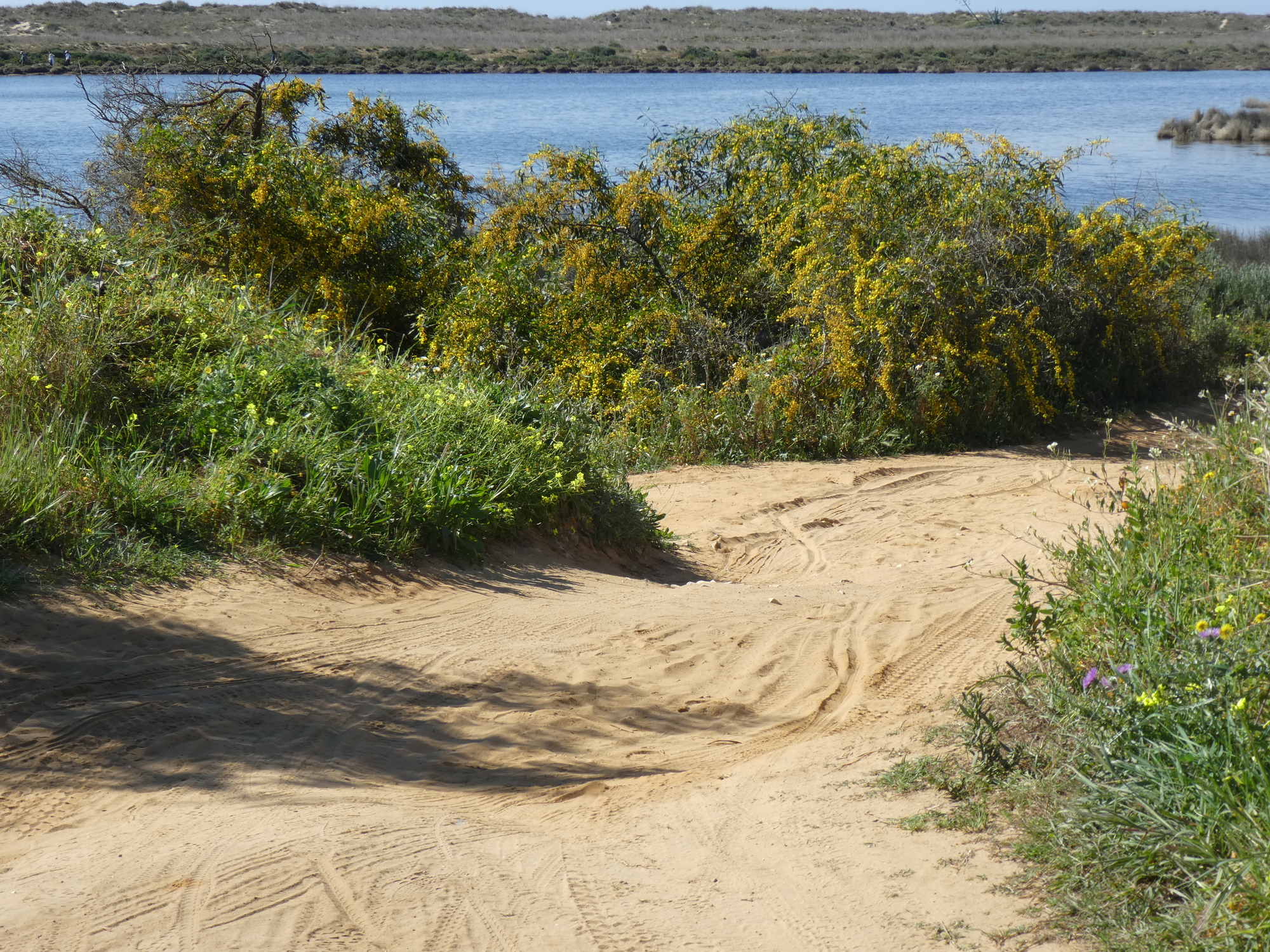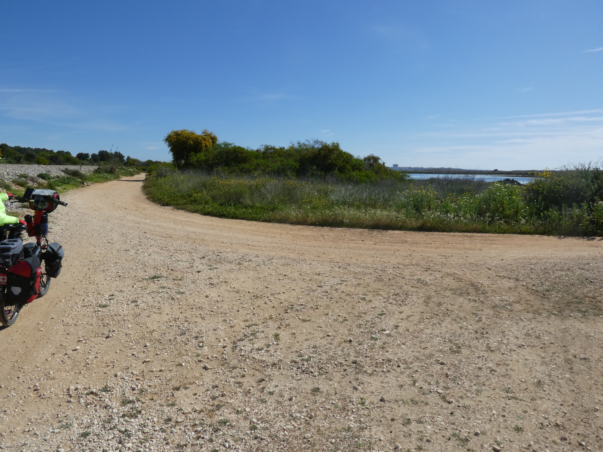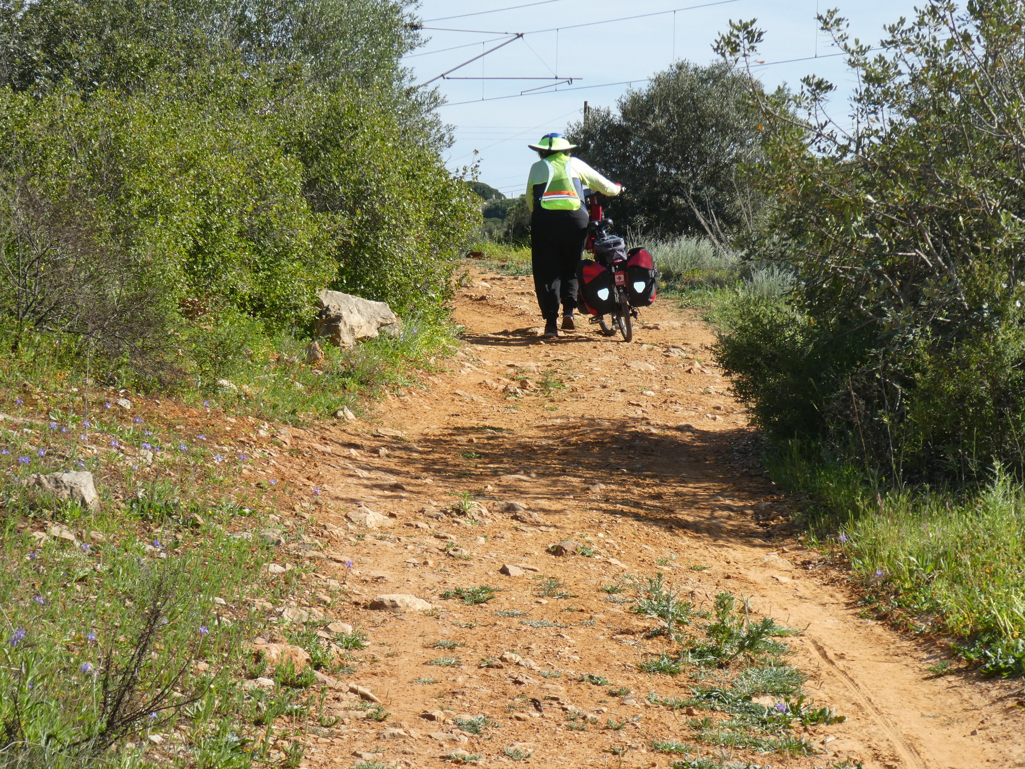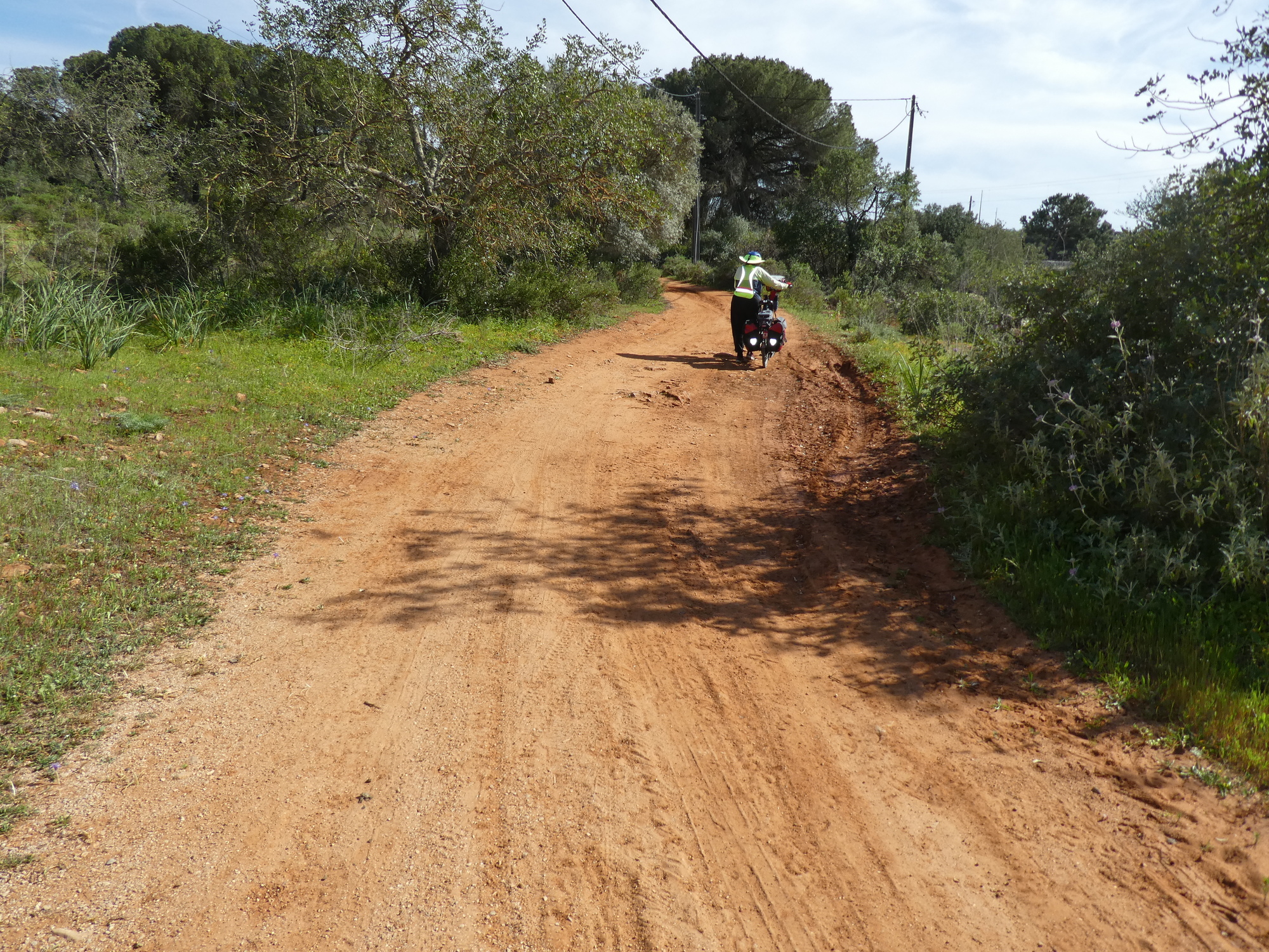 Because of the short day yesterday, we had lots of time to read other blogs and to contemplate the pros and cons of following EV 1, and to what extent. Our thinking was affected by some basic facts. Fact one was the need to make it to Vilamoura, not only because of a booking but also to make sure that in turn we make it to Seville, where we had to book well in advance because of Semana Santa. Fact two is that we are opposed to pushing on sand or having our bikes jarred apart by too rough roads. And fact three, the big one, is that the distance to Vilamoura on EV 1 is about 90 km, and even if less sick and injured than we are, that is too far, even on paved roads.
