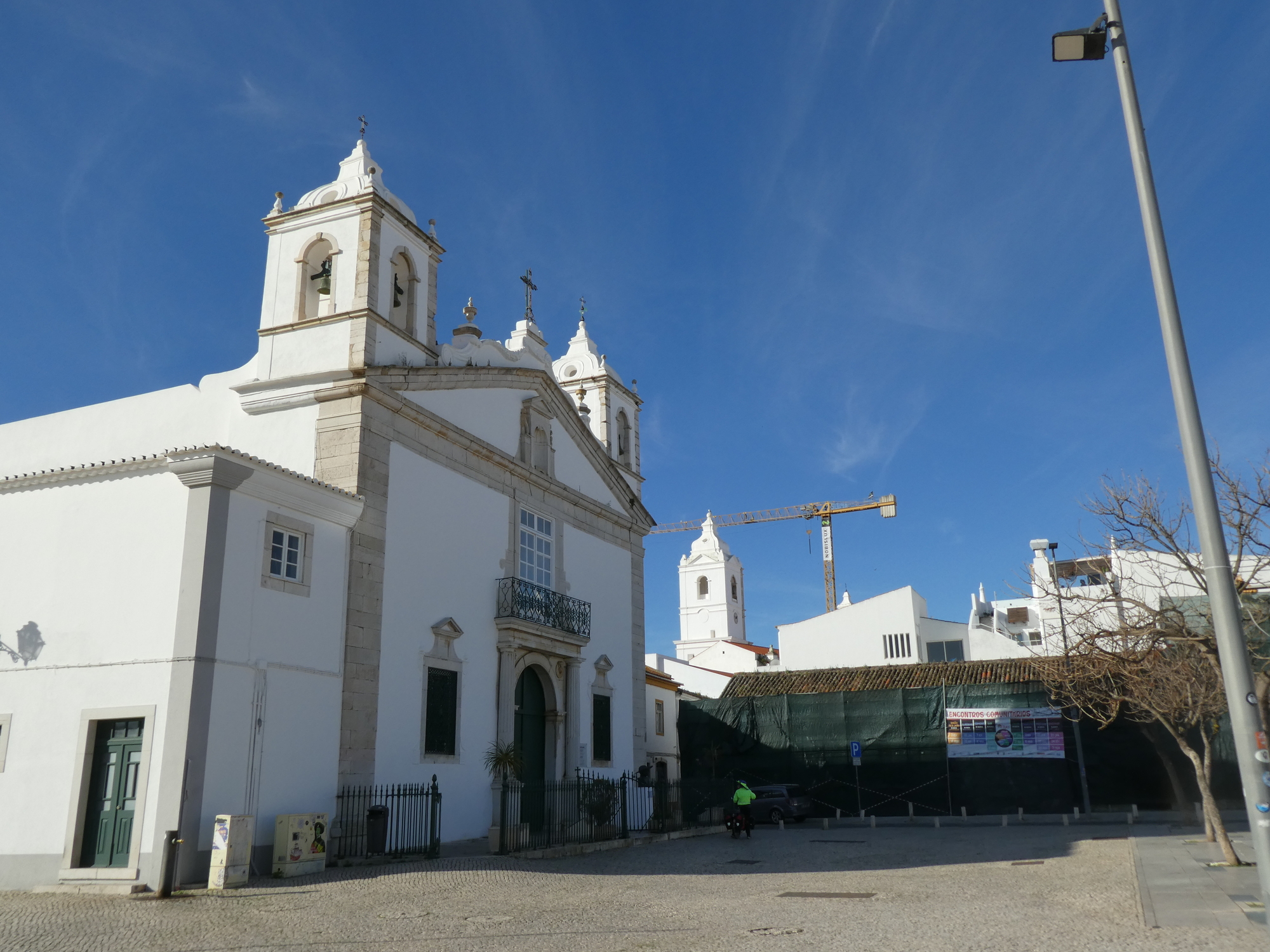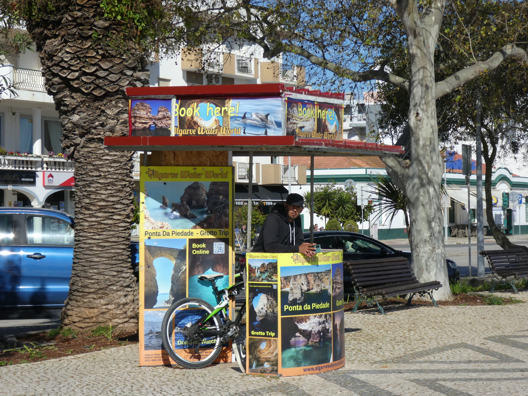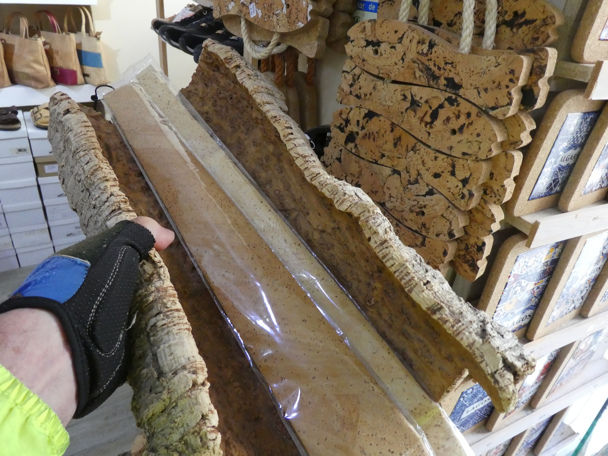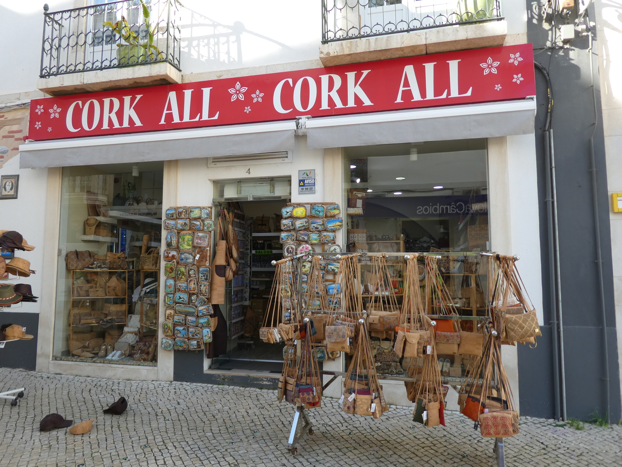 As instructed by Rick Steves, we went inside the old wall of Lagos for our look around. We found a closed church, and very pleasant walking street, with good postcards for Dodie to buy. There was also a cork store, where I got to ask a question that had been bugging me: Since cork bark is usually only about an inch thick, how do "corks" of about 2 1/2 inches get punched out of it? The answer is that the barks are cooked and compressed into blocks, then sliced to the correct thickness before the corks are punched out.