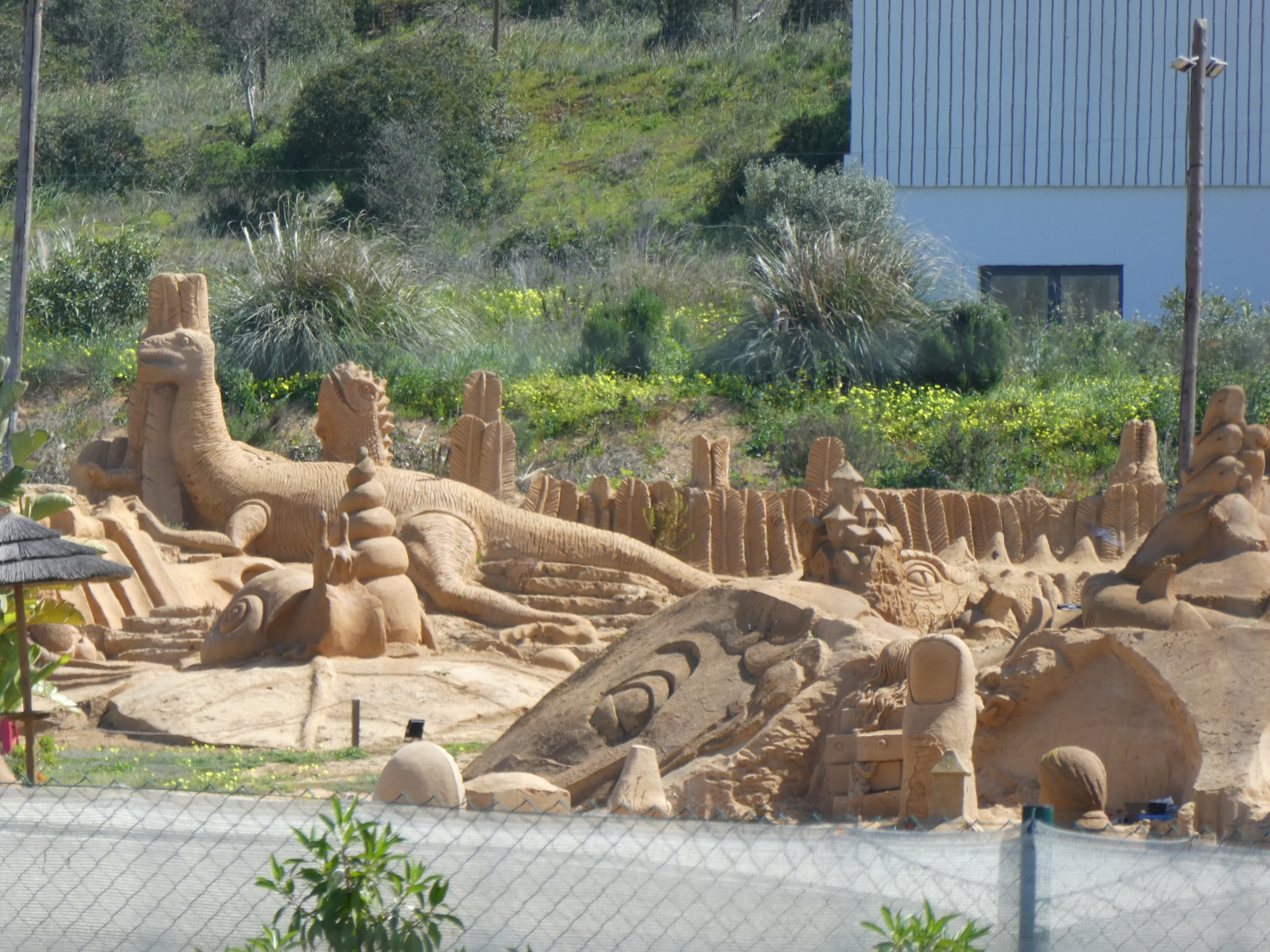 A lot of billboard advertising went into a sand sculpture park. This long shot gives and idea of what it was like behind its fence.