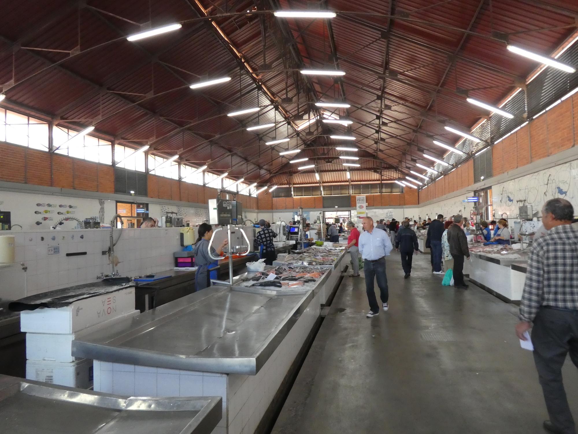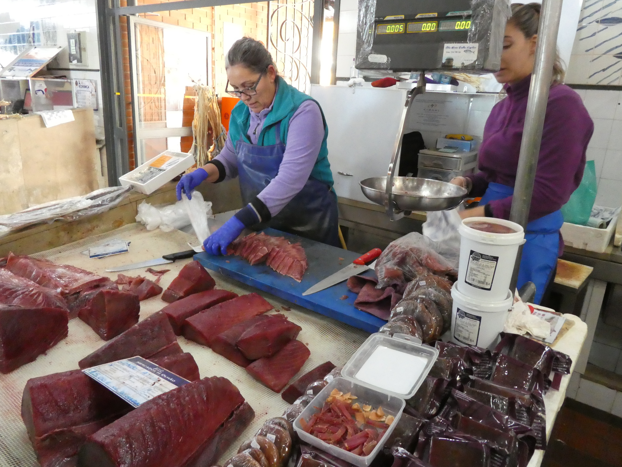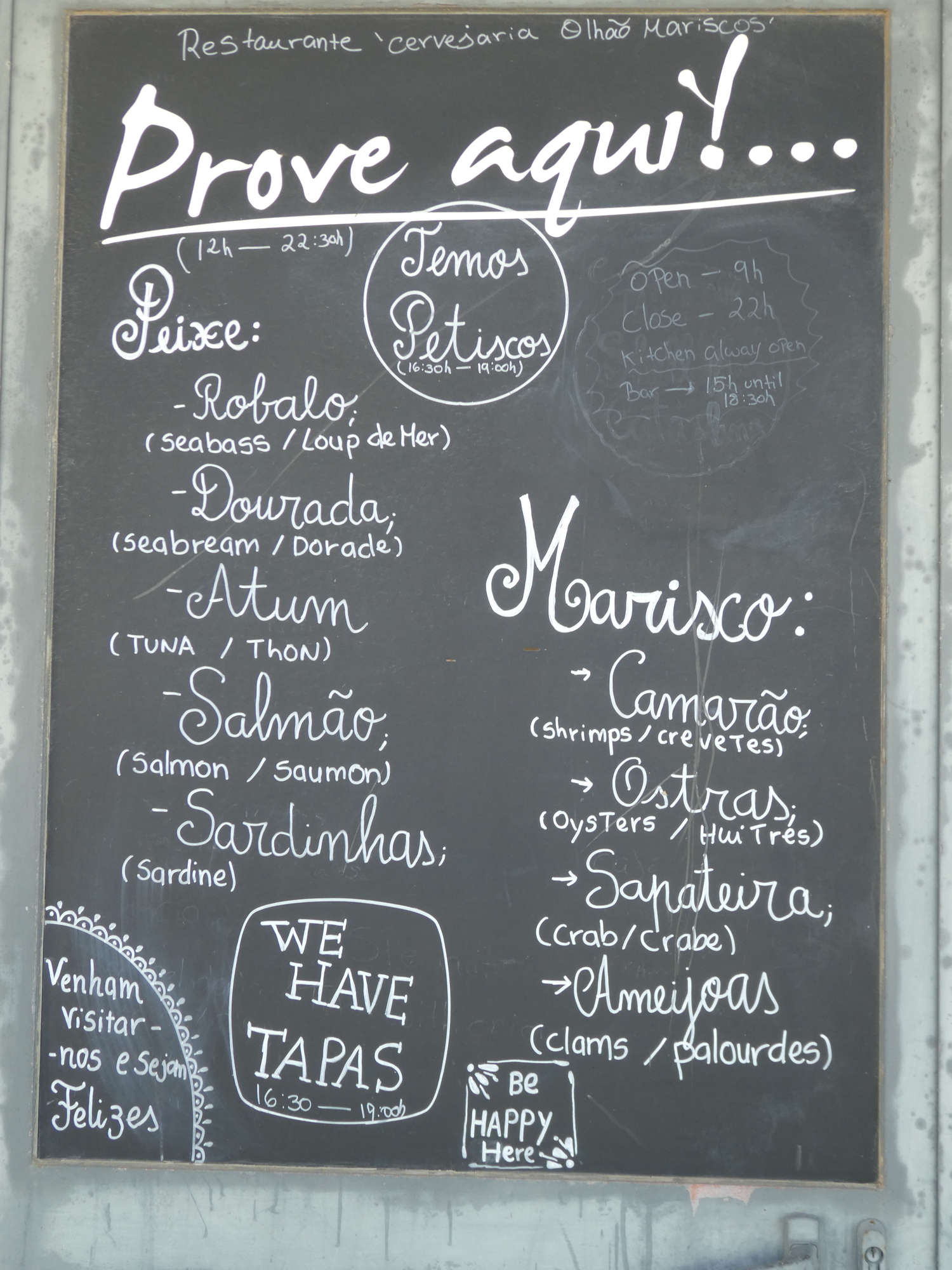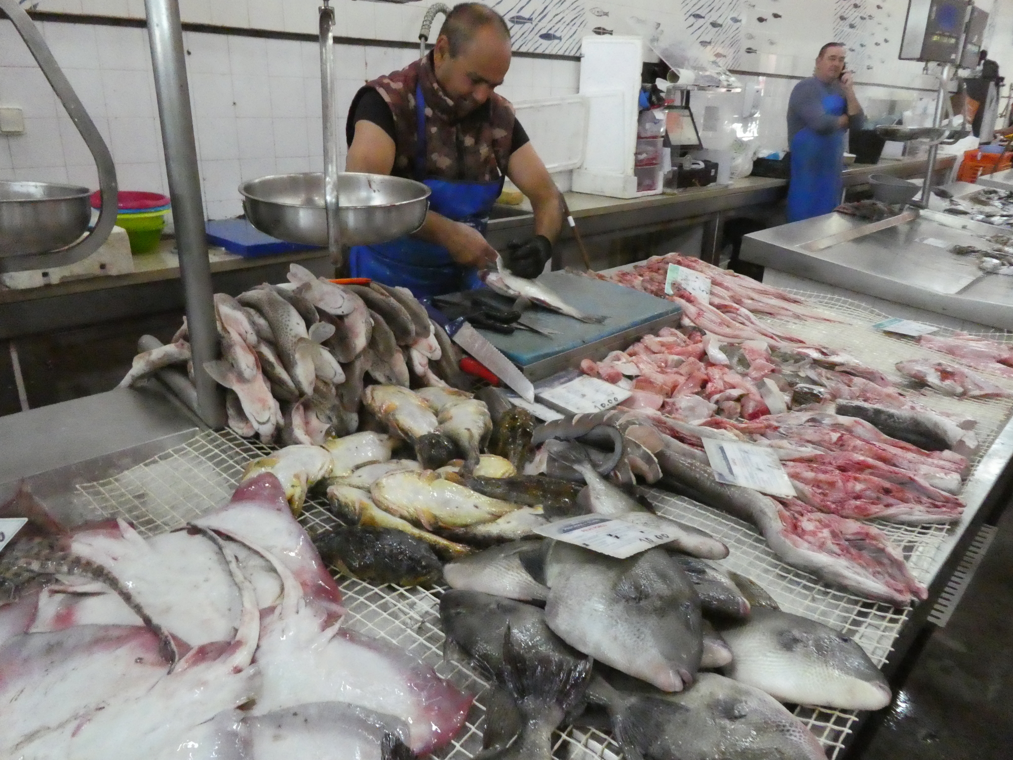 Olhao's main feature is a malecon featuring shops and restaurants and condos. The best of this is a large market building, which is in two parts - one with seafood and one with vegetables and meat. As usual this all wowed us, especially all the squiggly sea creatures. It was not just the creatures, but the fact that the building was right by the sea, and that this was an authentic market, in PORTUGAL! There were some other cues to authenticity here. For example, the little vans that all the workers use. In the old days, in France especially, I remember the goofy little Citroen trucks that all tradesmen had. Now it's these white vans. And then there is the restaurant selling exactly what you will find in the market. And the clients out on the tables - totally unhurried, as were the wait staff.