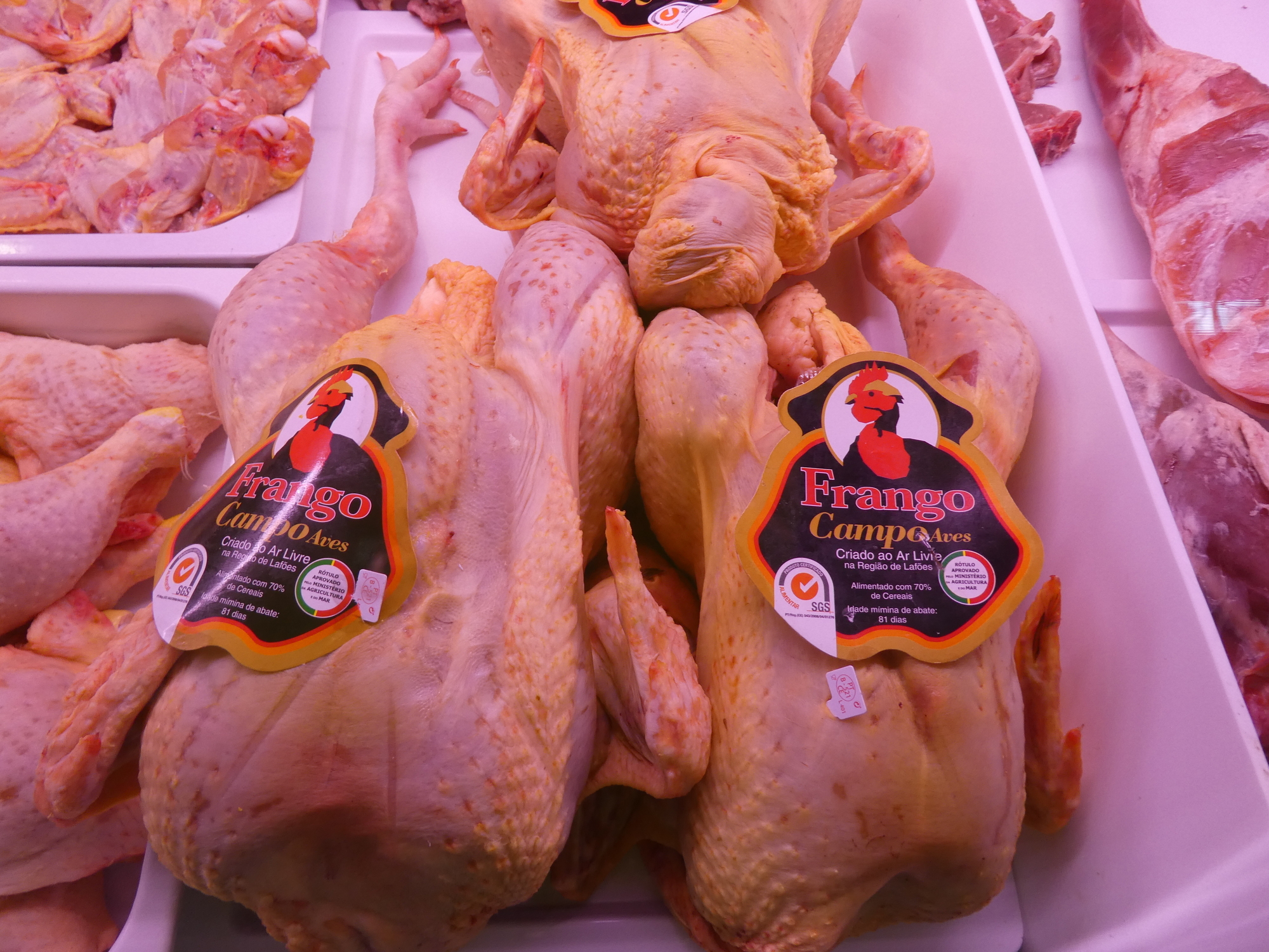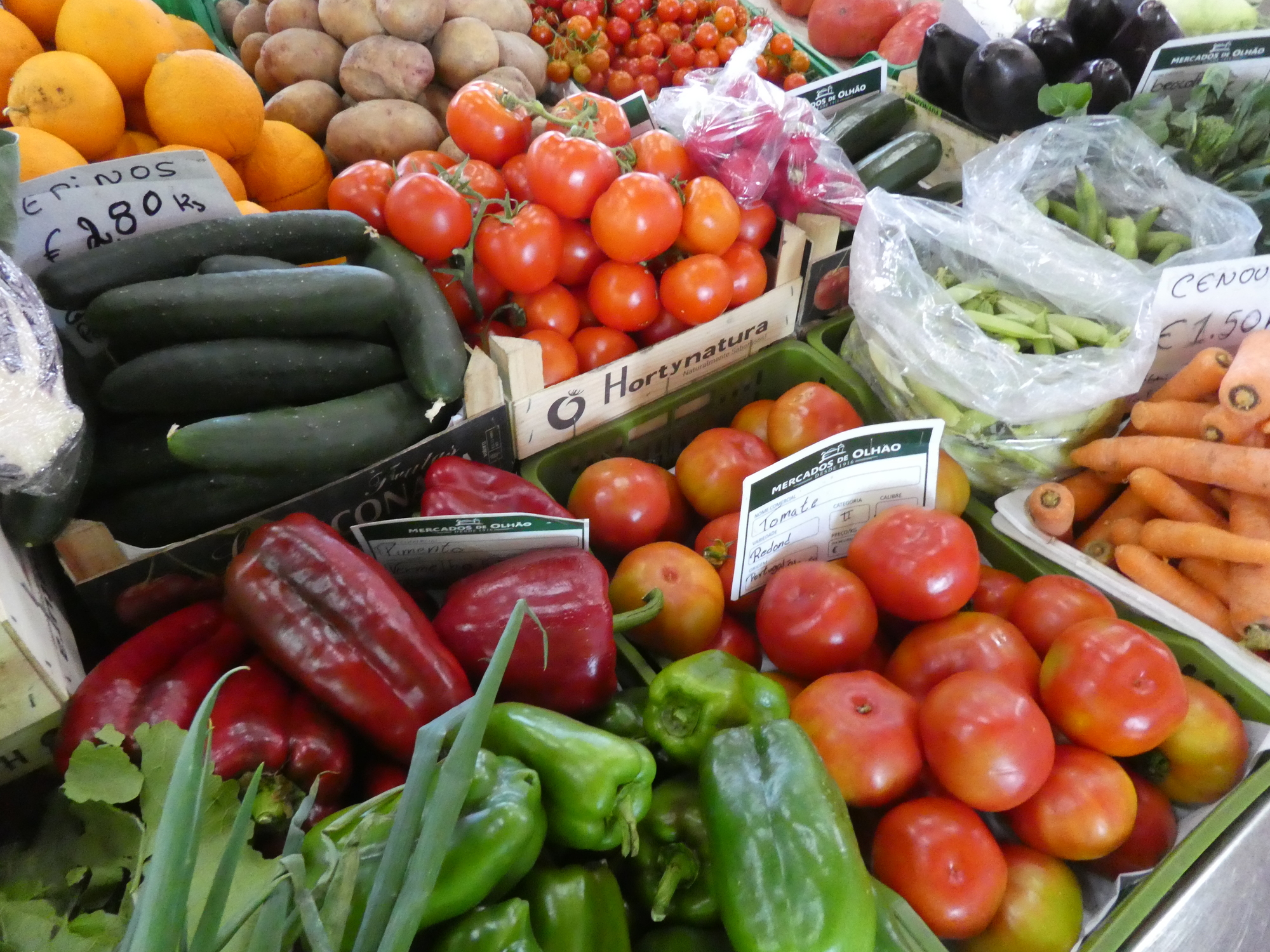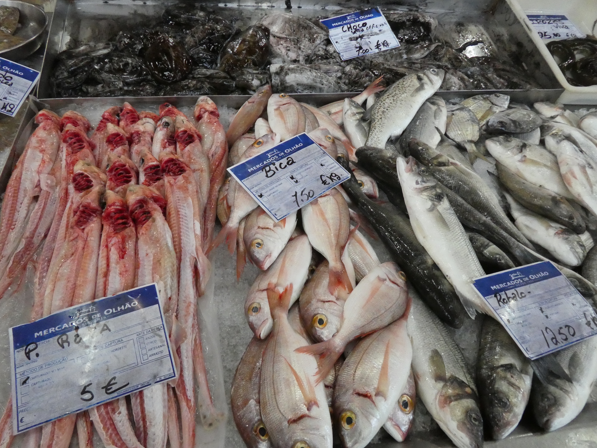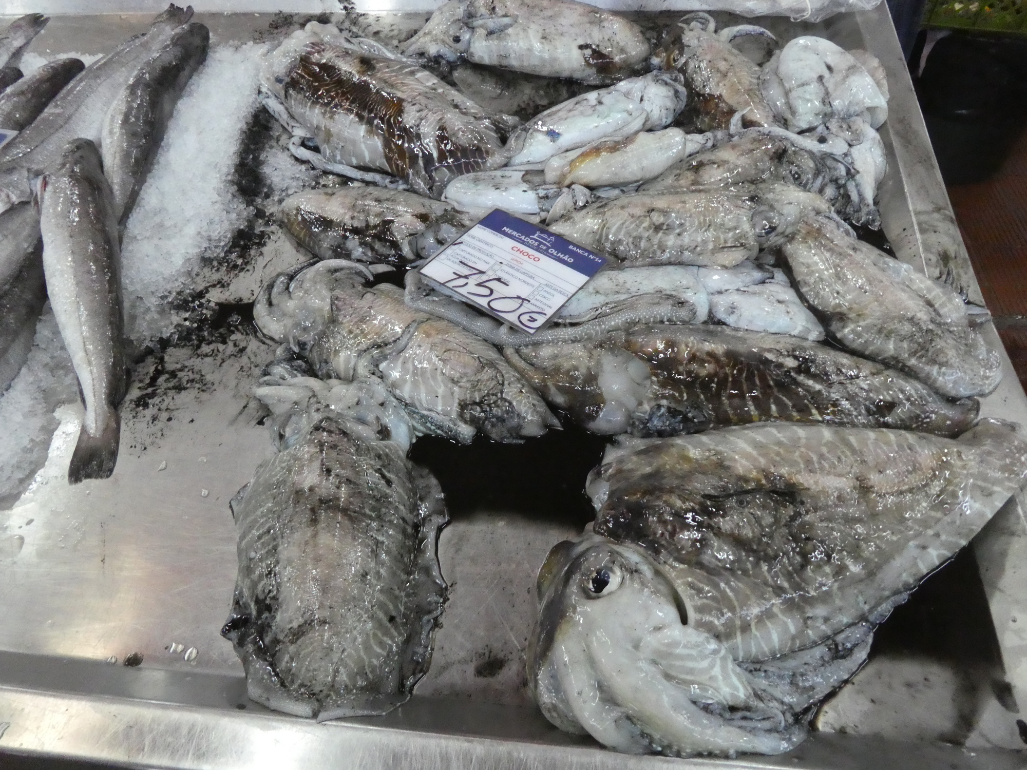 Olhao's main feature is a malecon featuring shops and restaurants and condos. The best of this is a large market building, which is in two parts - one with seafood and one with vegetables and meat. As usual this all wowed us, especially all the squiggly sea creatures. It was not just the creatures, but the fact that the building was right by the sea, and that this was an authentic market, in PORTUGAL! There were some other cues to authenticity here. For example, the little vans that all the workers use. In the old days, in France especially, I remember the goofy little Citroen trucks that all tradesmen had. Now it's these white vans. And then there is the restaurant selling exactly what you will find in the market. And the clients out on the tables - totally unhurried, as were the wait staff.