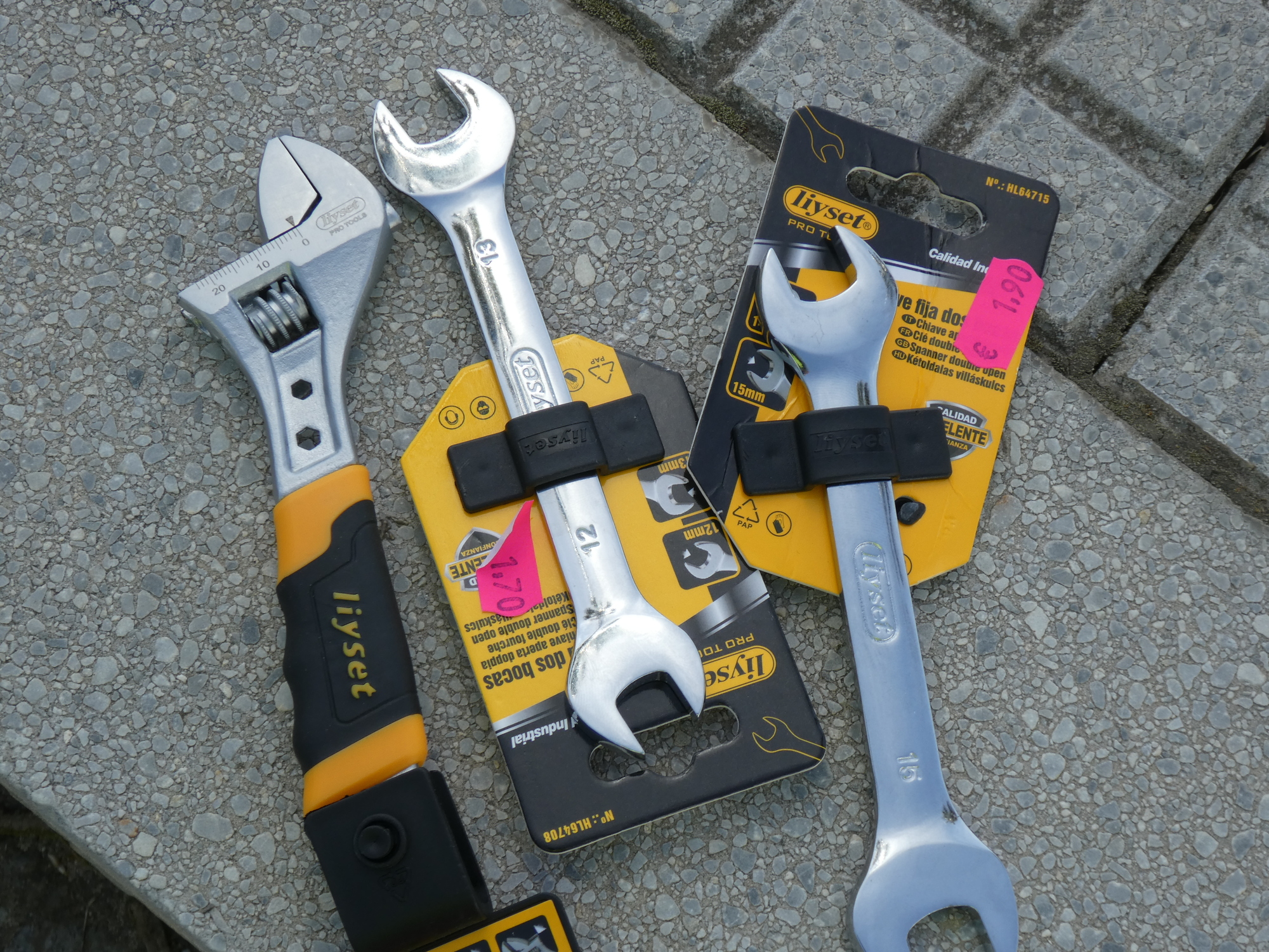 This led us to seek out the local "dollar store" here correctly called the Chinese store, for some smaller wrenches. The store was called Mega Ayamonte, and it was bigger than one might think. They did have some nice bike tools and accessories, but I went to the hardware section, emerging with wrenches of the right size, but too thick? Yes, too thick. So, did I give up? What do you think?