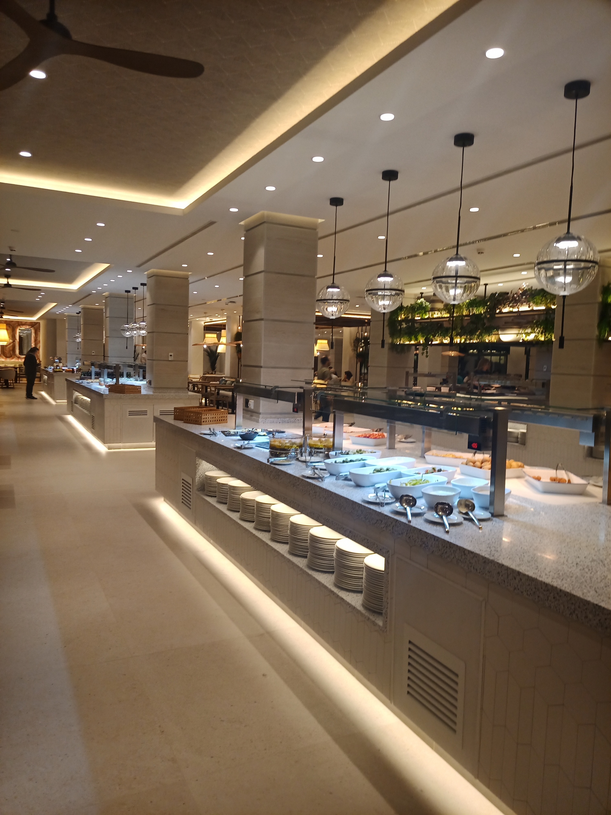 The hotel offered a buffet supper, which sounded good to us after our stressful cone wrench adventure. We soon made our way down to floor zero and launched the long hike to the dining room. We were shown to a table, and I went for a walk to visit the various foods that were on offer. After doing the circuit I arrived back at our table and took my seat, empty handed. I wanted to rest up for a bit before heading back out into the infinite spaces that comprise the dining area. I think I have been in some big hotels, like in Los Vegas maybe, and surely they were bigger than this, but this does give more the impression of cavalier use (or disuse) of space.