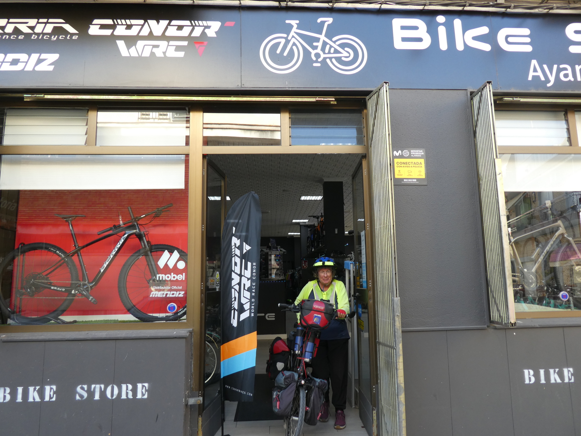 Sending Dodie into the post office to buy stamps, I set about the adjustment, only to find that the darn wrench was the wrong size for the cone. So, Google Maps pointed us to the bike shop and off we went. We arrived there at 1:20, only to find that they, like every other shop of import in Spain, closed for Siesta, 1:30 -5:00, and these guys must have been extra sleepy, because they were already closed!