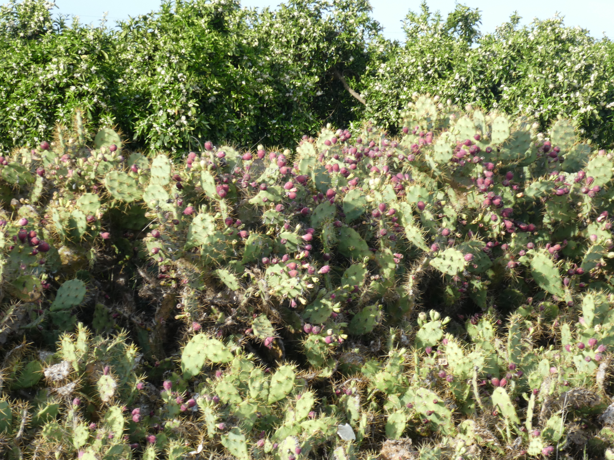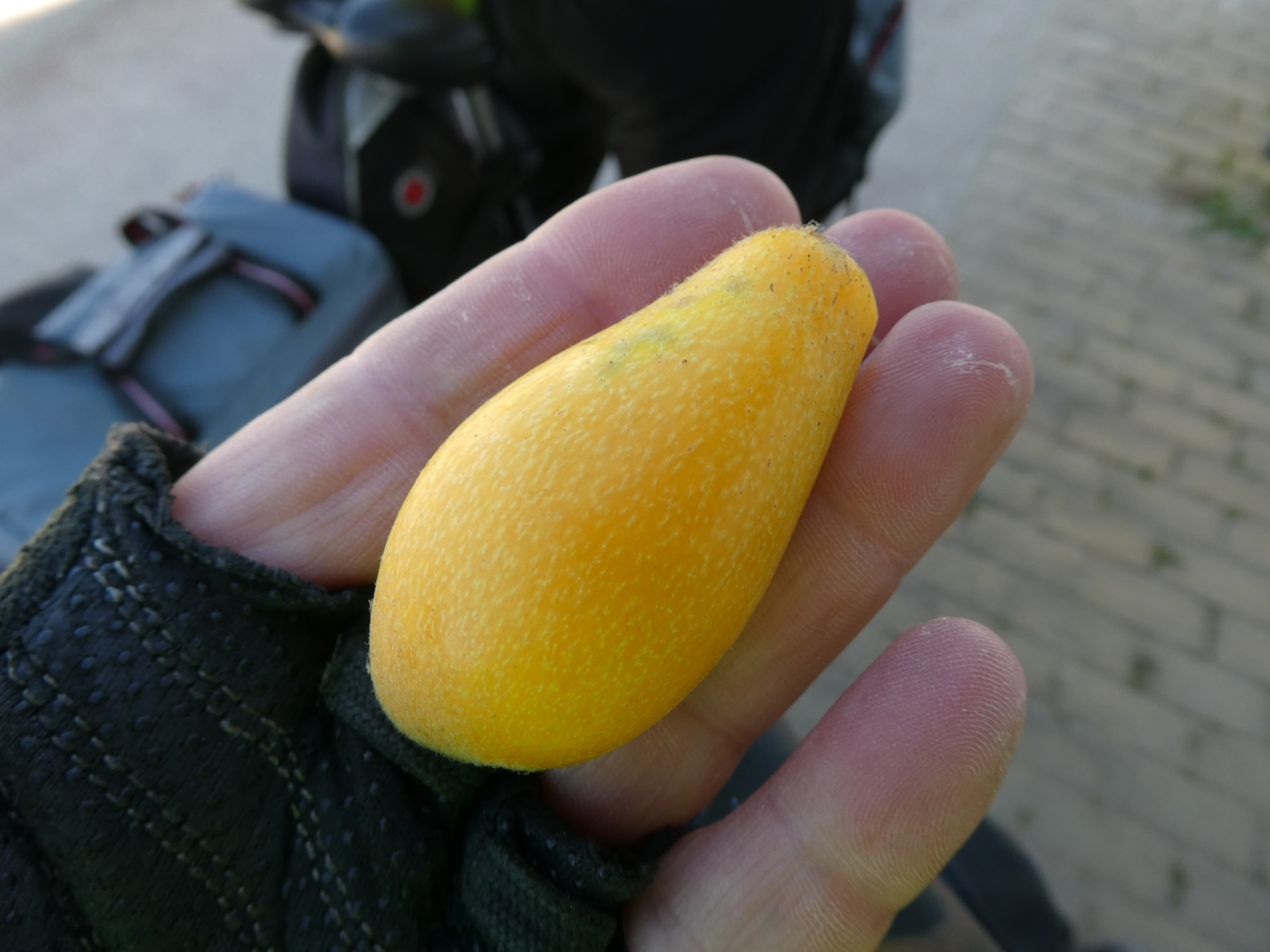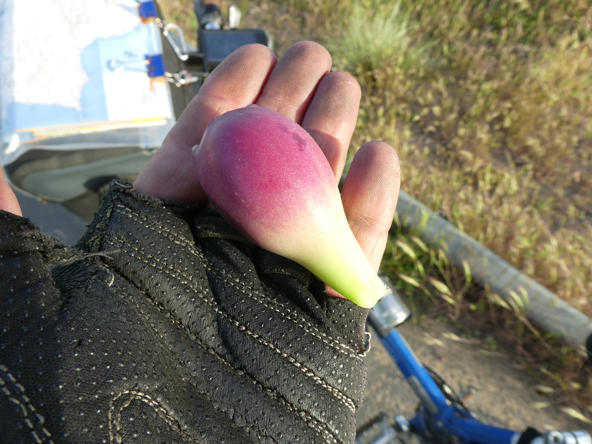 Fruit research came on hard times as we passed a km or so of prickly pear cactus. I stopped and collected one fruit (getting jabbed by only one giant thorn) and announced to Dodie that it seemed edible and I was going to bite it. She said no, she thought you had to cook them. So I shoved the fruit in my bag. Soon though I was suffering twinges and jabs in my hands, which I localized to little thorn like hairs that came from the fruit. Later research revealed that these are called "glochids". You have to burn these off before eating, and you only collect prickly pear with heavy gloves! Had I bitten that thing, there were have been (even more) tears for a long time!