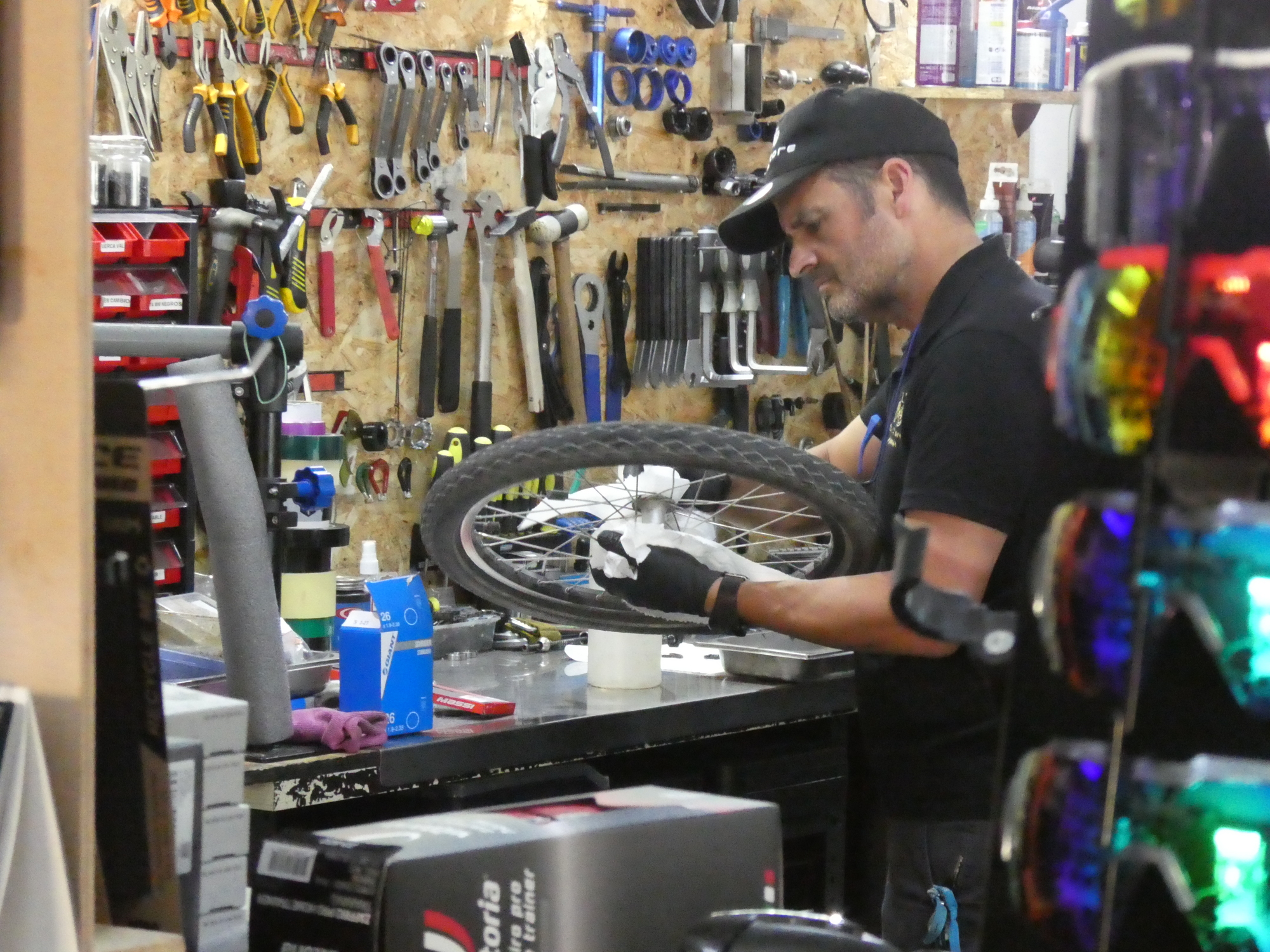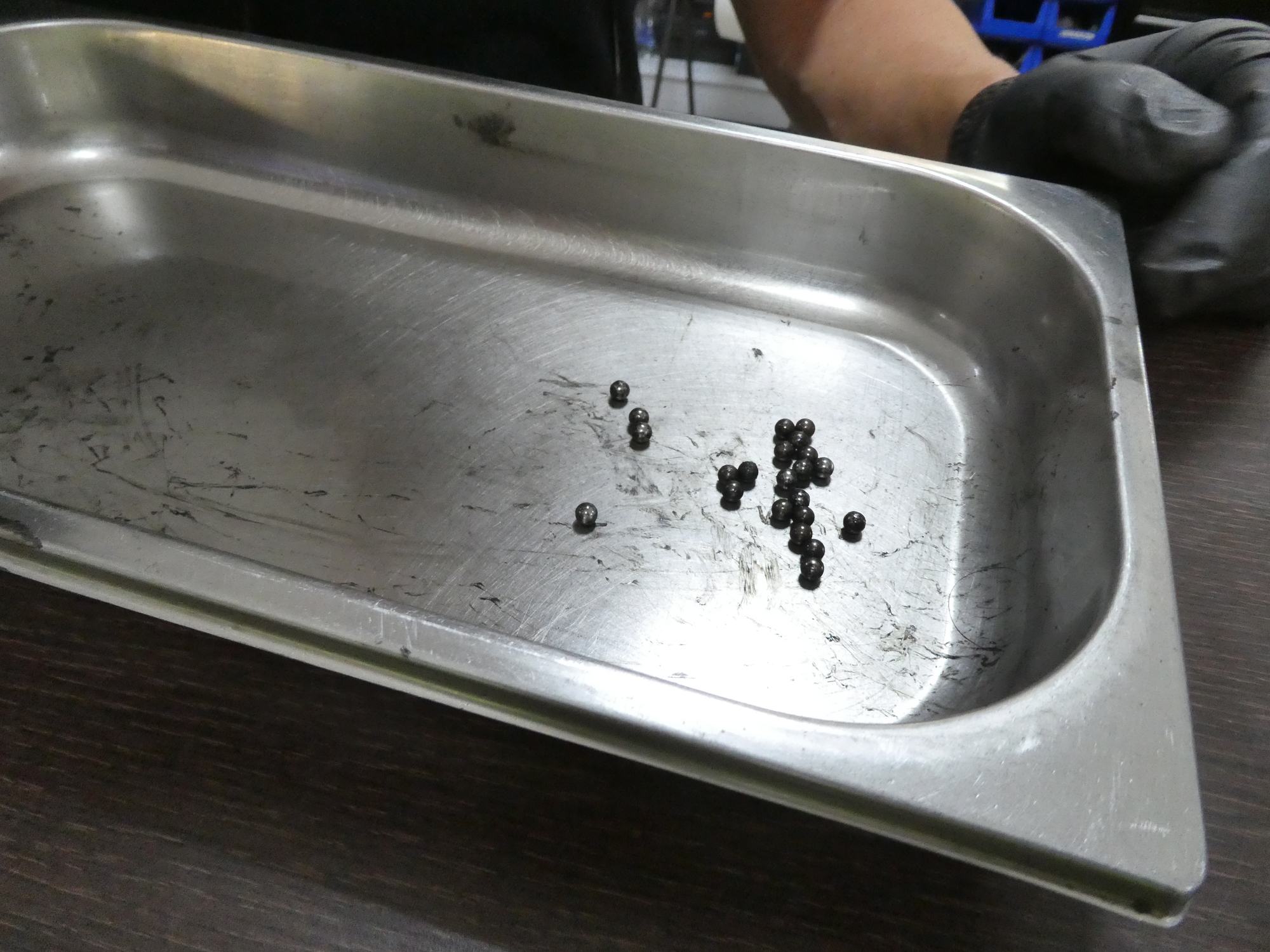 But wait, before 4:30 Dodie spied activity at the bike shop! In we went, and whopped off the wheel, to explain the problem to the mechanic. Oh, to be surrounded by appropriate tools, as he was! He did not settle for just adjusting the cone, but rather pulled the ball bearings out, cleaned and greased the races, and put new balls in. As you can see in the photo, he was not much pleased by what he found inside. The balls were completely worn out, not even all of the same size still. Dodie had done this mischief in not even, ok, maybe 30,000 km of riding this bike! Clearly when we get back there is a new hub in its future!